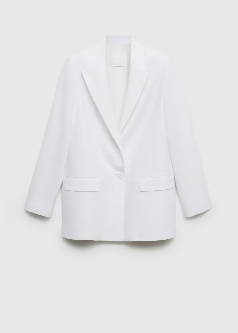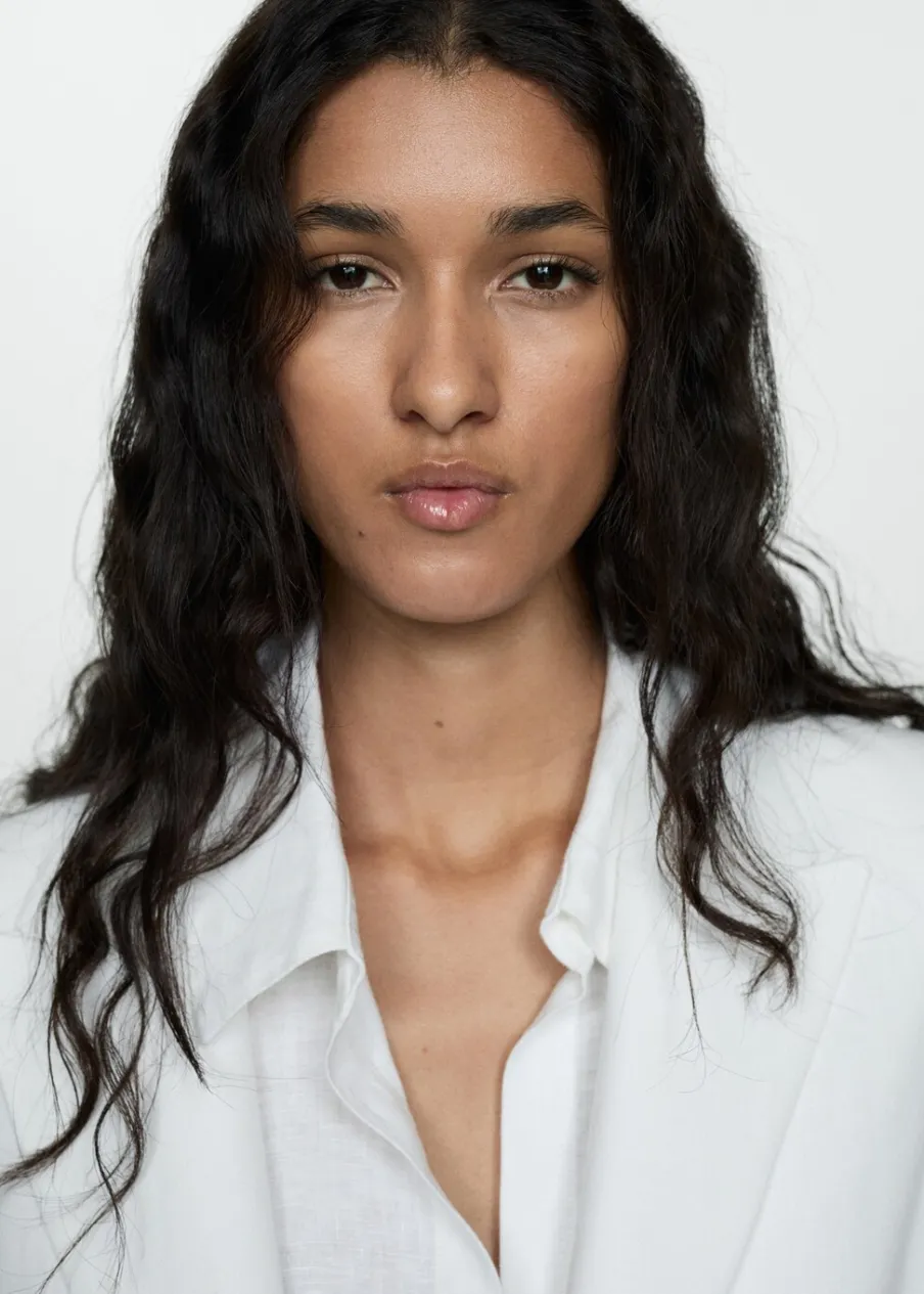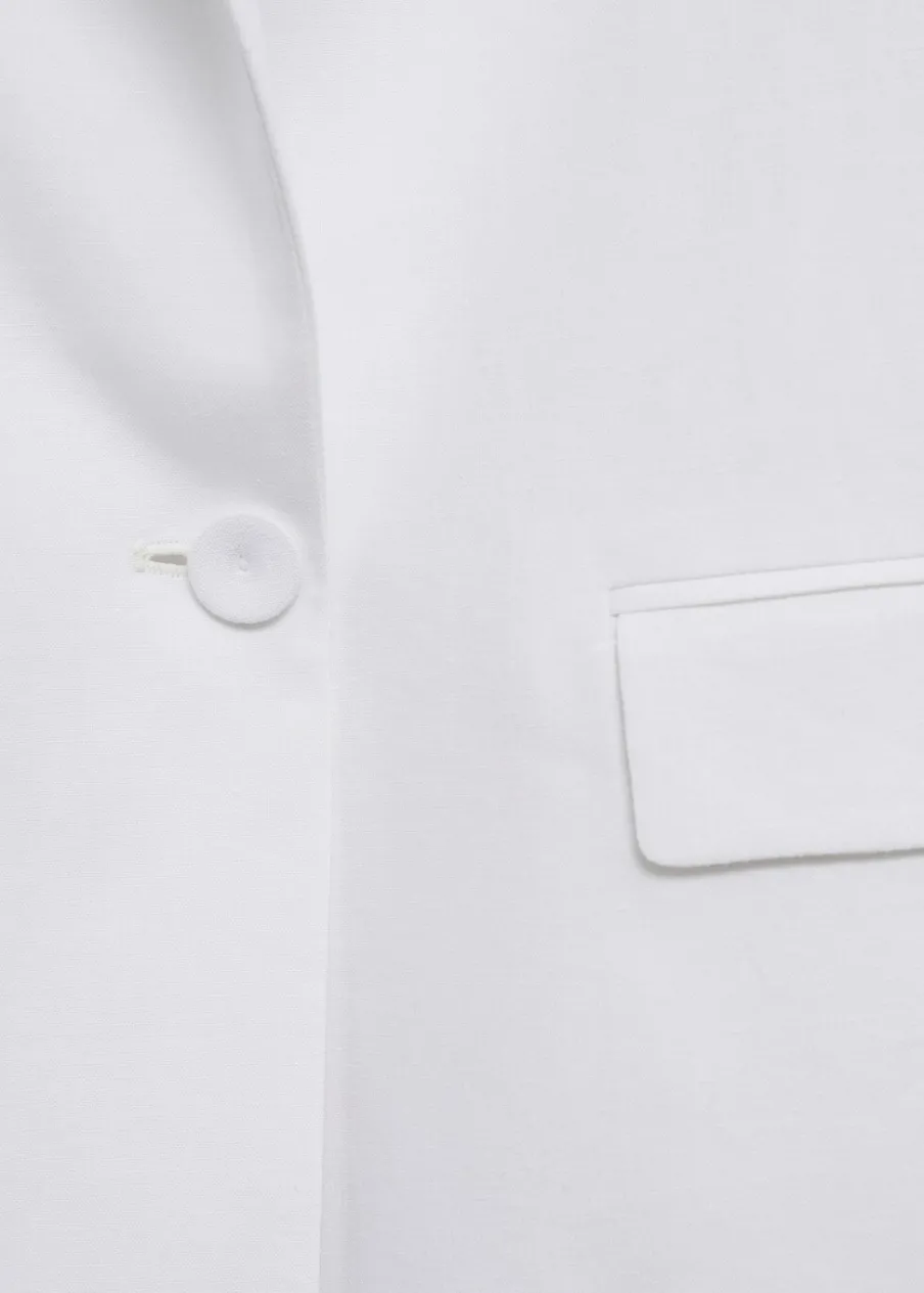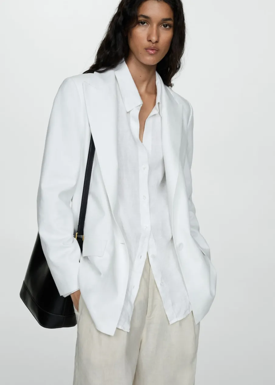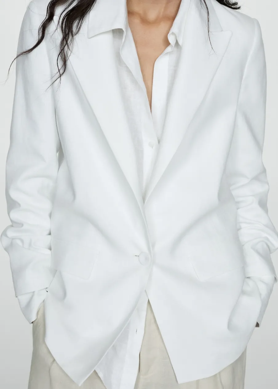 OpisTkanina z mieszanki lnu. Model prosty. Dekolt w szpic z kołnierzykiem. Klapy z nacięciem. Długi rękaw. Dwie kies…