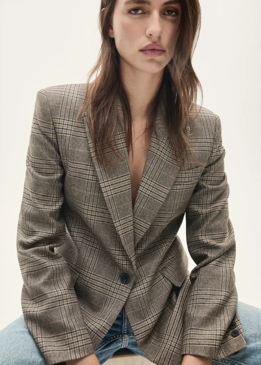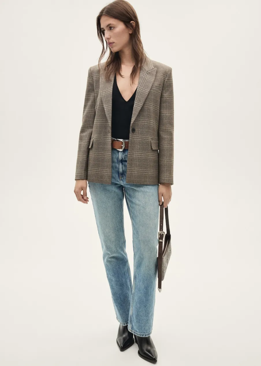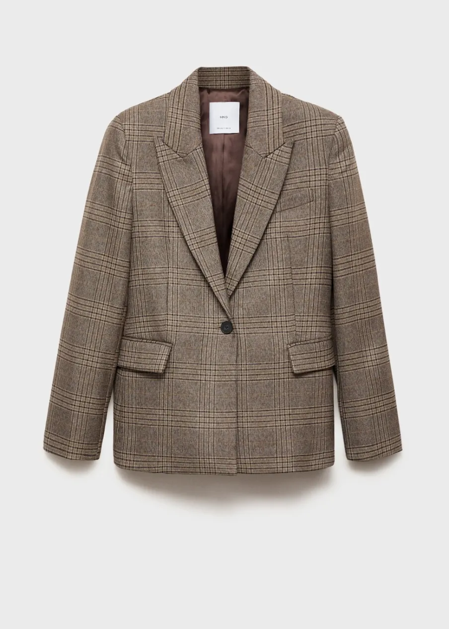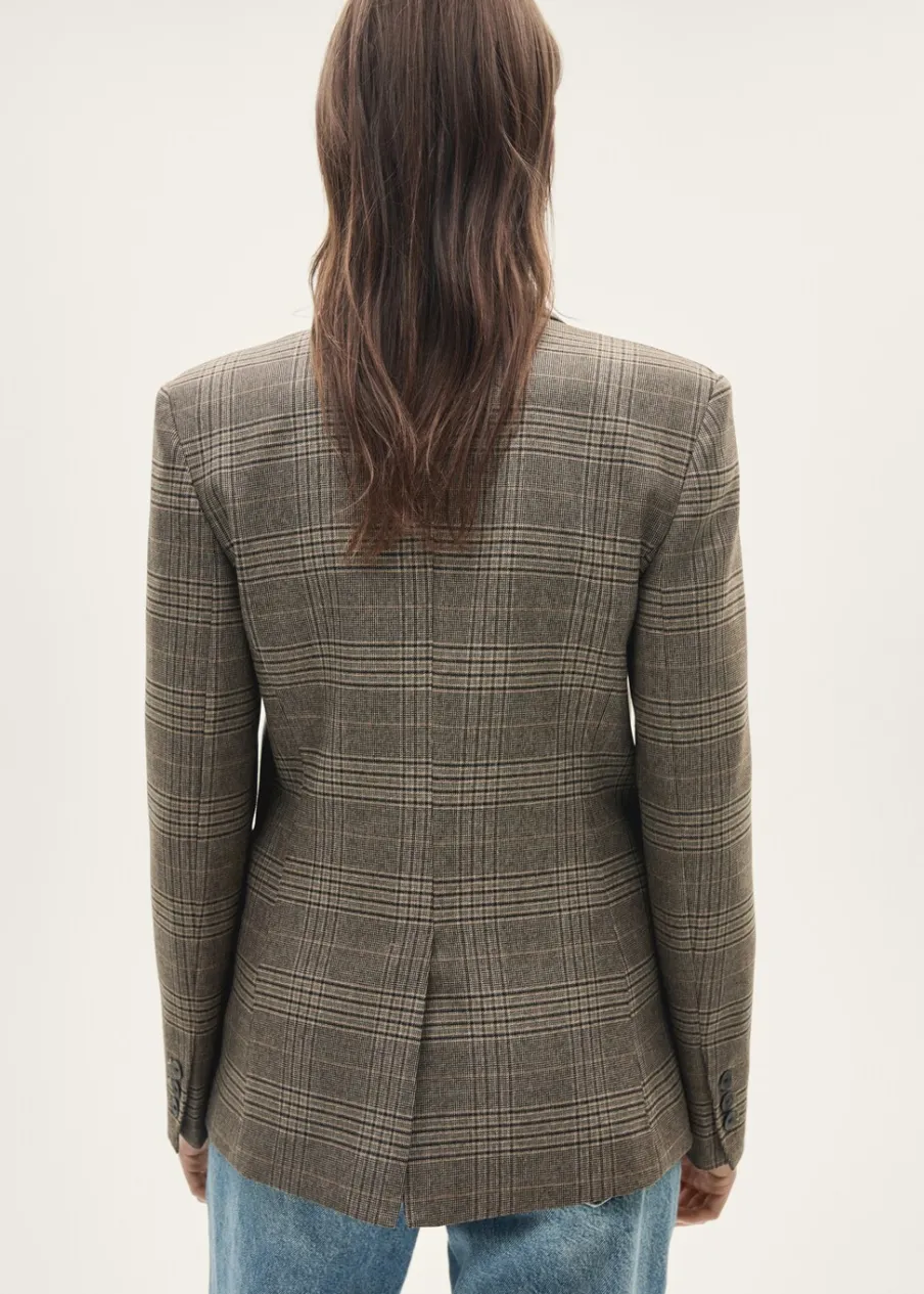 Deseń w kratę. Model prosty. Dekolt w szpic z kołnierzykiem. Długi rękaw z zapięciem na guziki. Dwie kieszenie z przodu z wypustkami i patką. Zapięcie z przodu na guzik. Wewnętrzna podszewka.