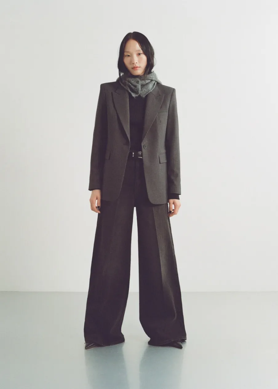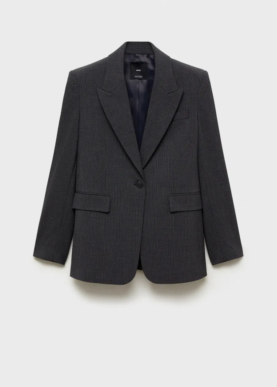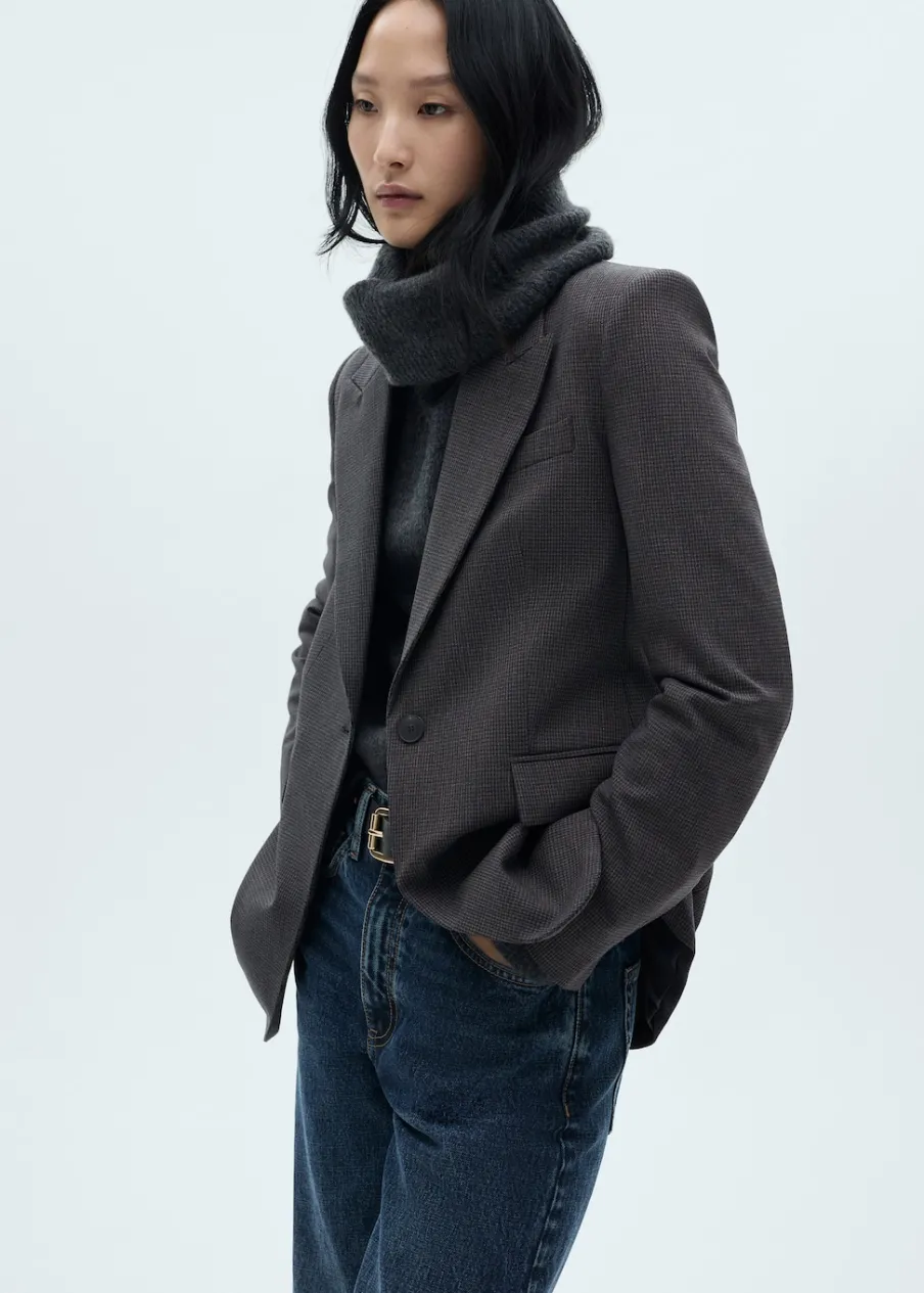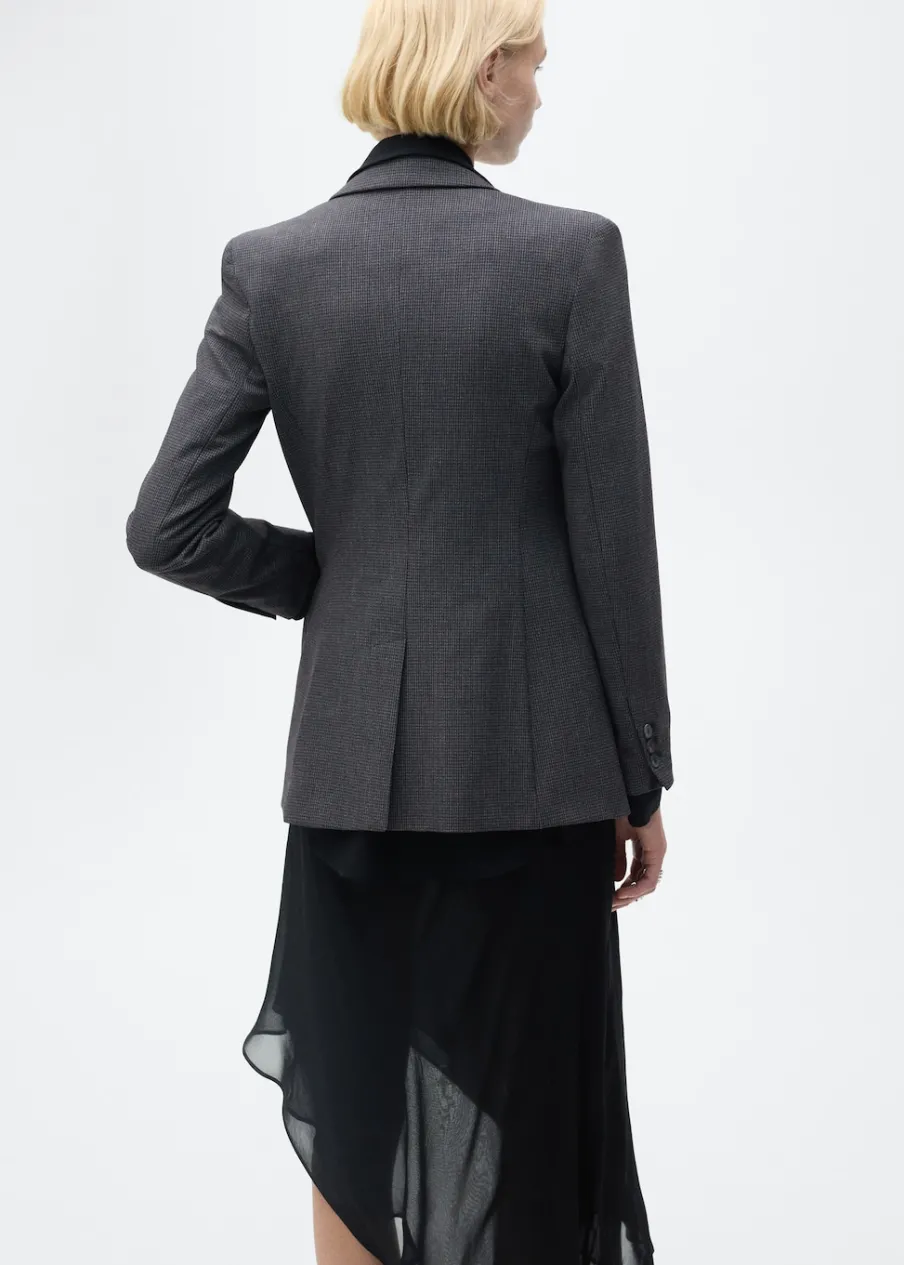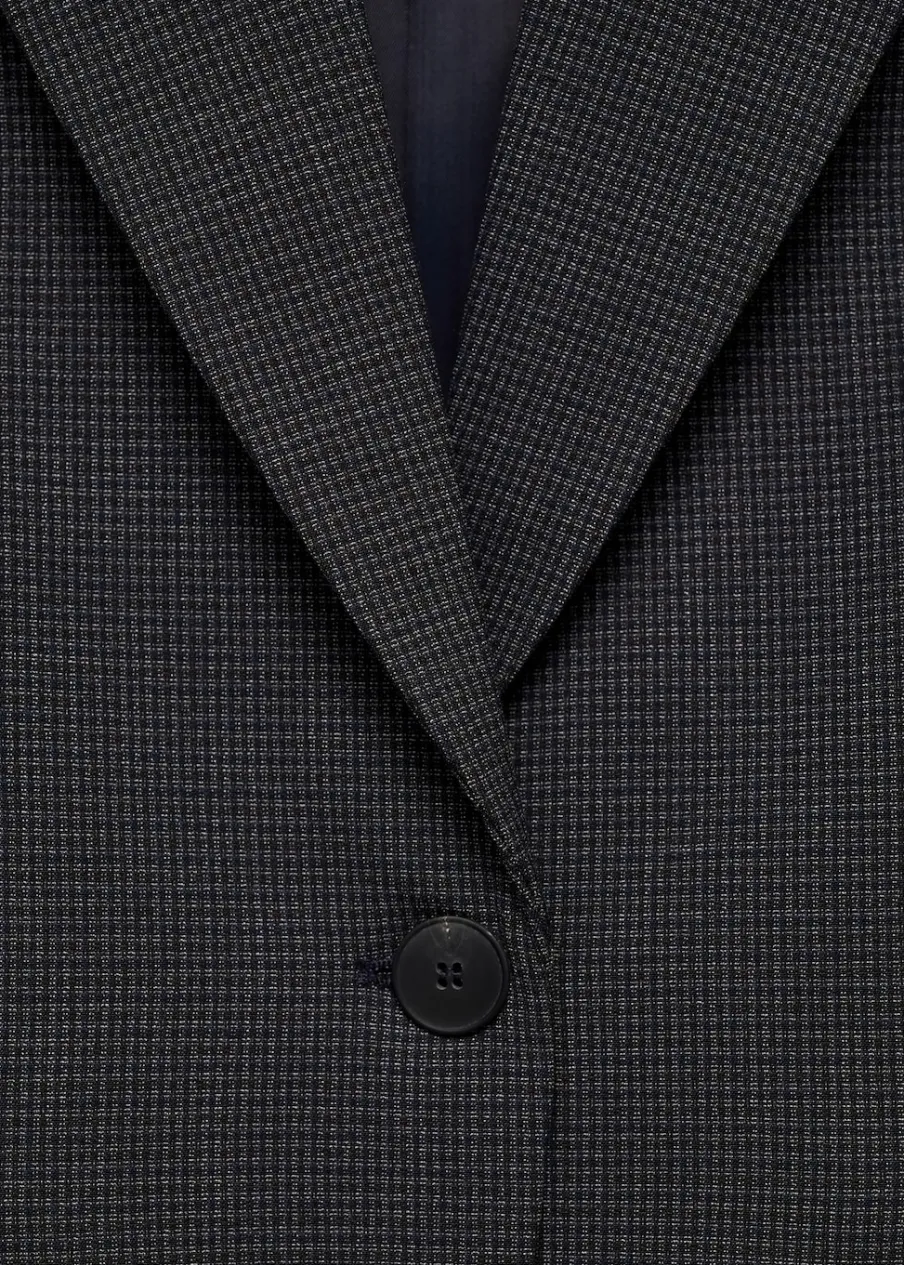 OpisModel prosty. Wzór w drobną kurzą stopkę. Dekolt w szpic z kołnierzykiem. Długi rękaw z zapięciem na guziki….