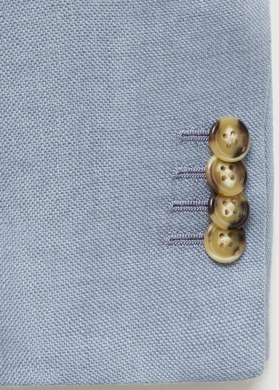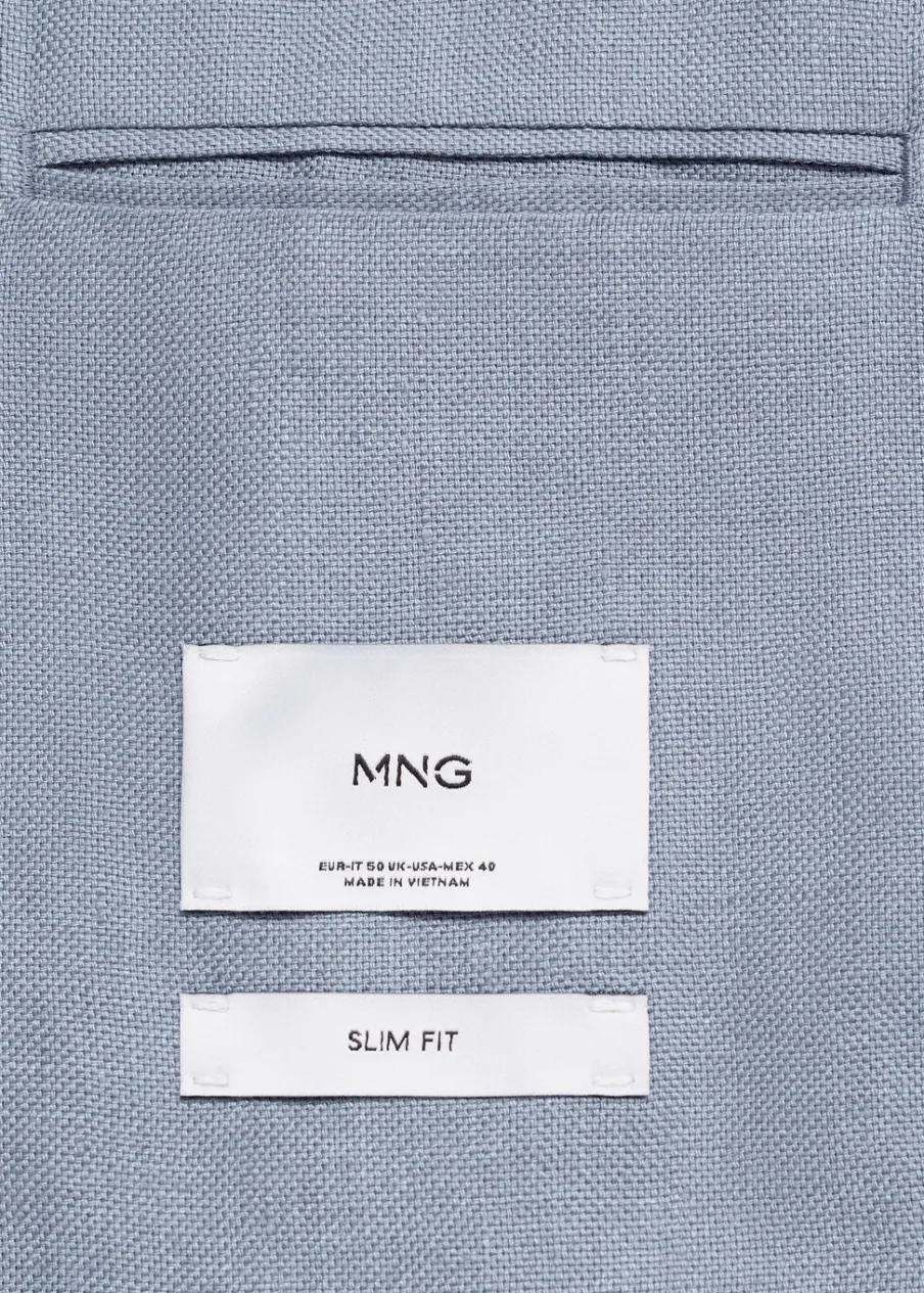 Slim-fit. Tkanina z 100% lnu. Kołnierz z klapami. Zapięcie na dwa guziki z przodu. Dwie kieszenie nakładane z przodu. Długi rękaw z guzikami na mankietach. Bez podszewki. Model ma 187 cm wzrostu i nosi rozmiar 50. Naszywana kieszeń z guzikiem po wewnętrznej stronie. Kieszeń z wypustkami po wewnętrznej stronie. Dwie szlice z tyłu.