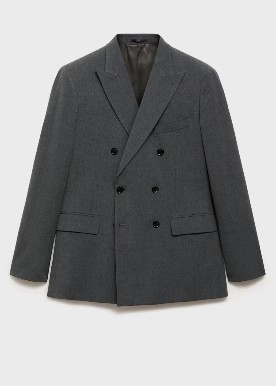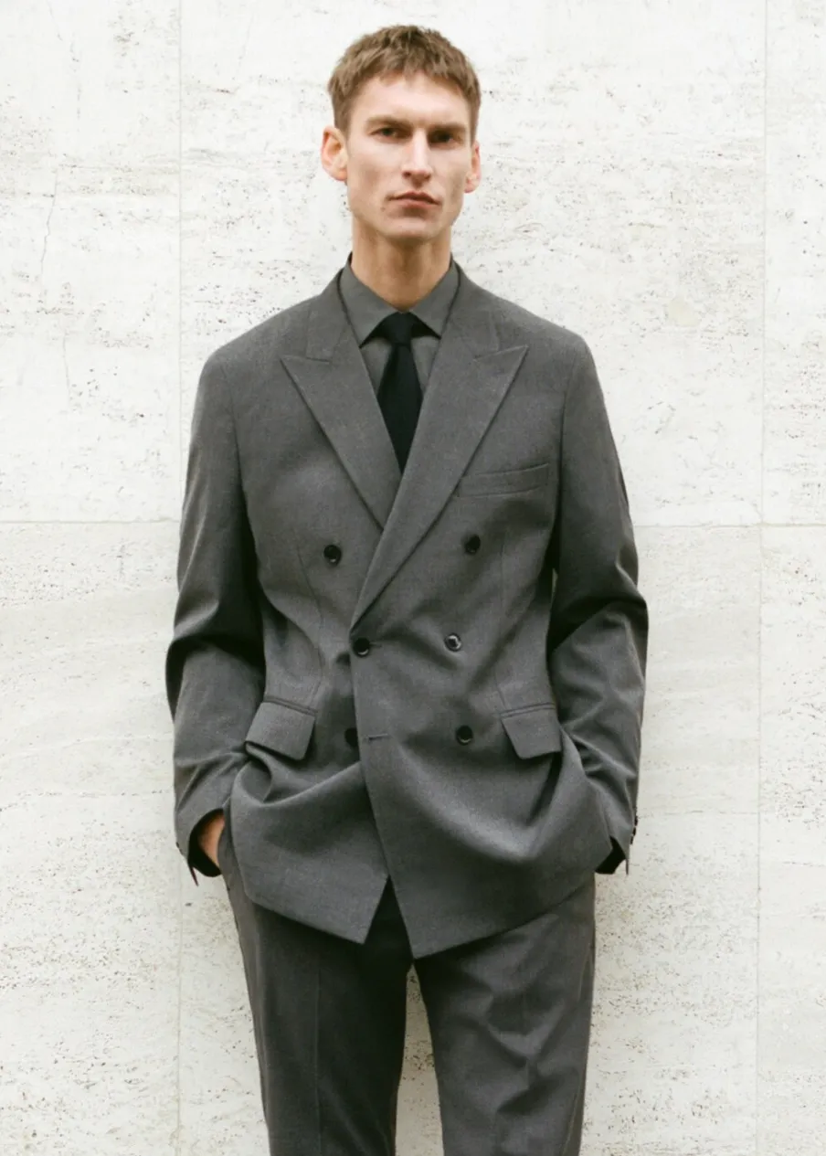 Slim-fit. Klapy zamknięte. Dwurzędowe zapięcie na guziki z przodu. Kieszeń wpuszczana na piersi. Dwie wpuszczane kieszenie z patkami z przodu. Długi rękaw z guzikami na mankietach. Dwie szlice z tyłu. Prosty dół. Wewnętrzna podszewka. Wewnętrzna kieszeń. Model ma 190 cm wzrostu i nosi rozmiar 50.