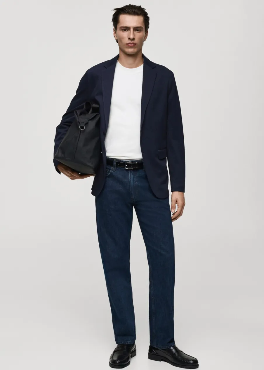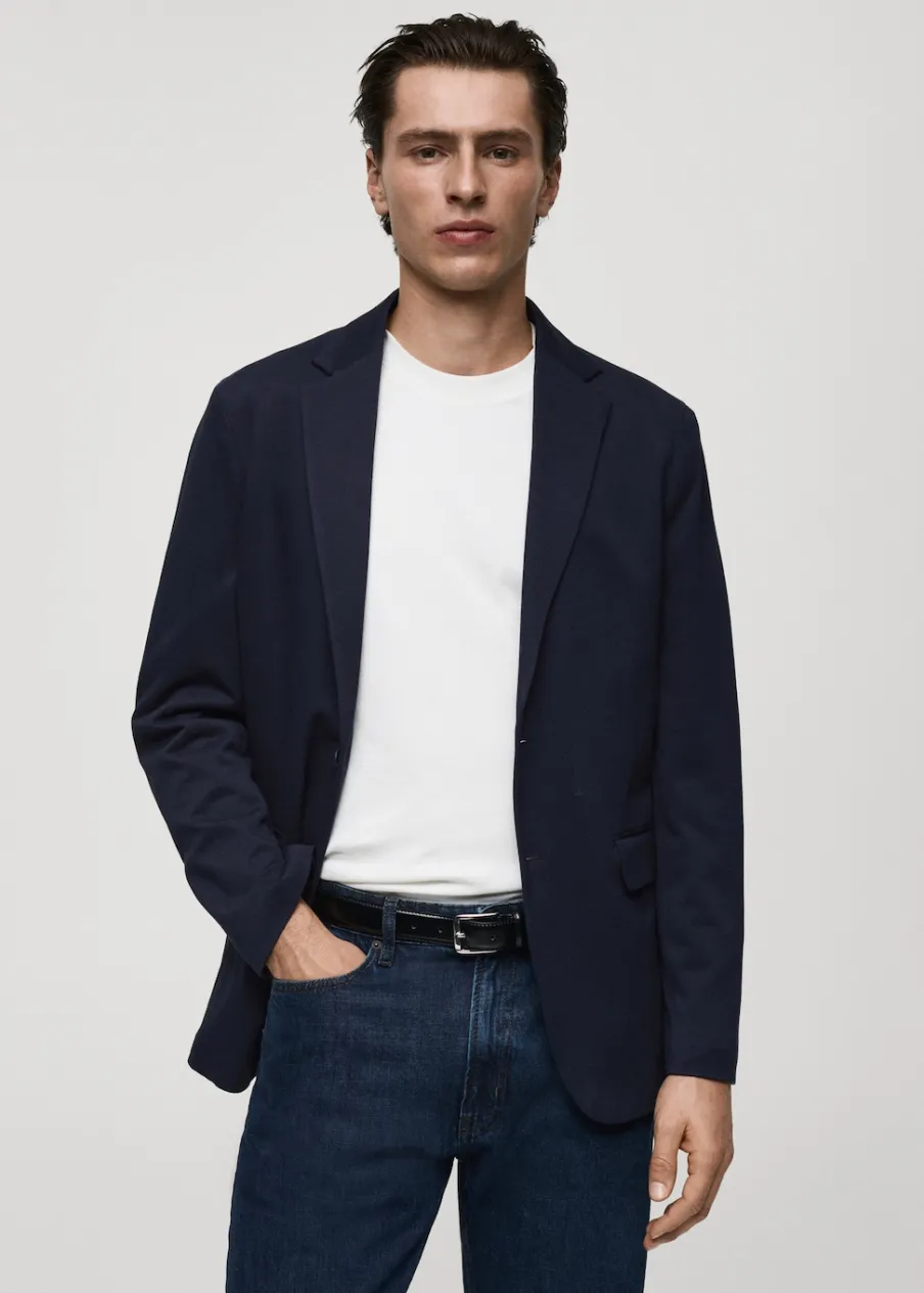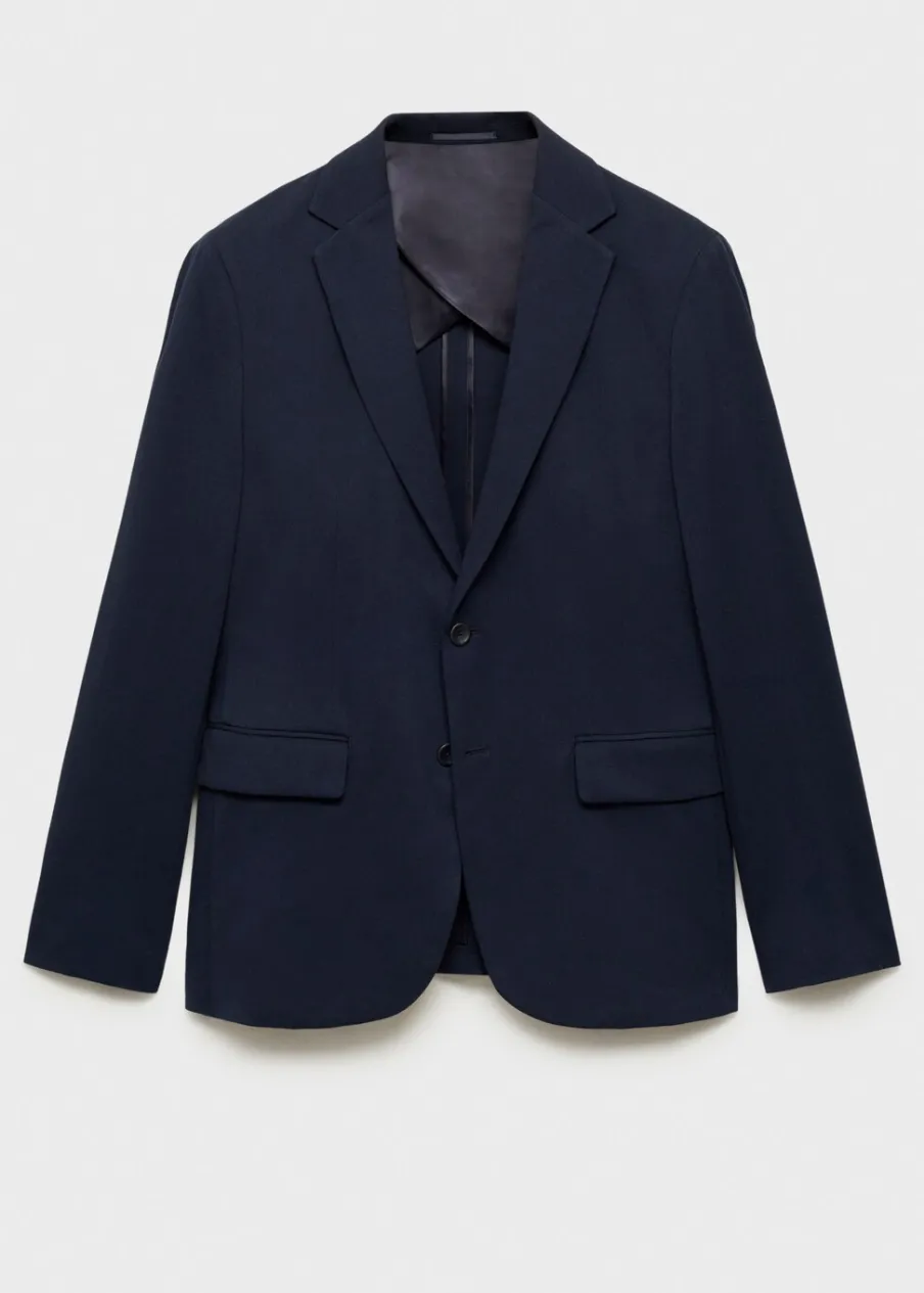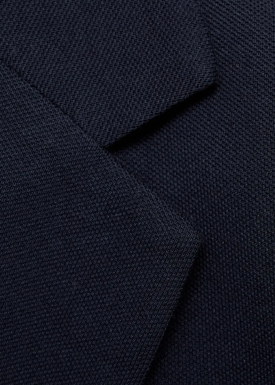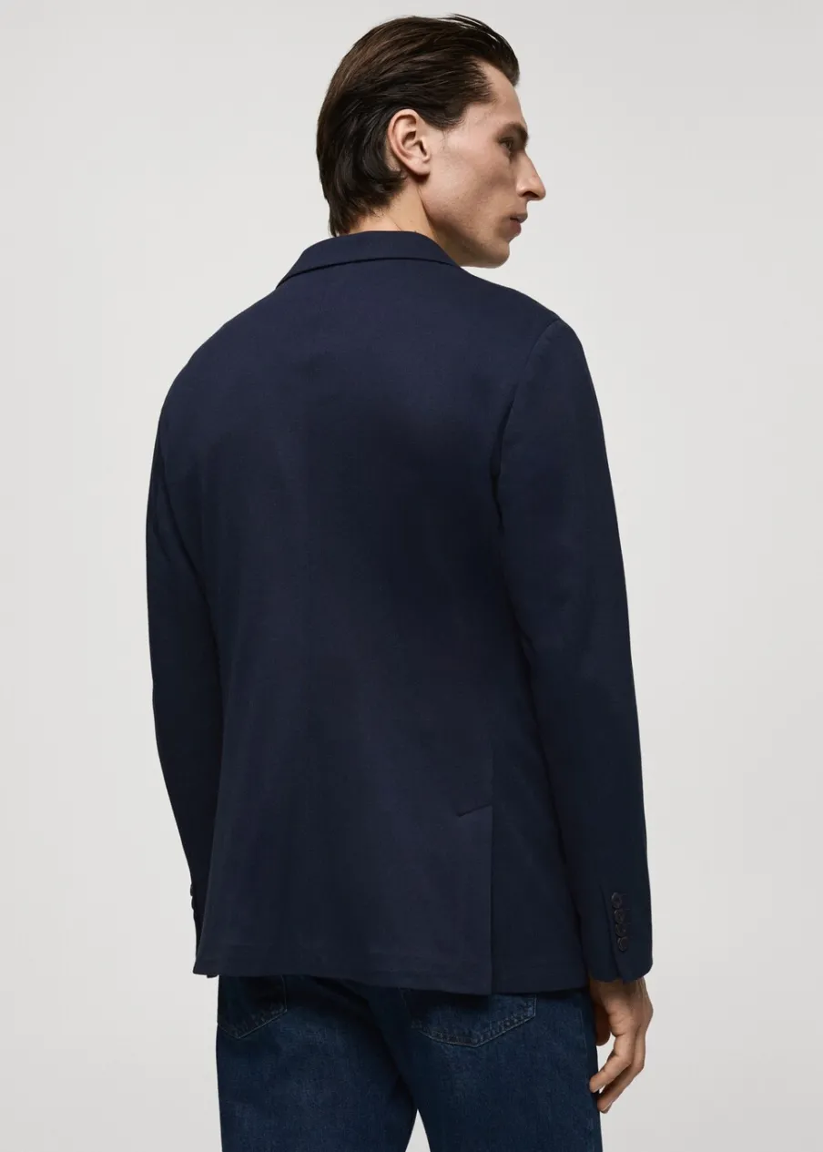 Tkanina mieszanka bawełny. Slim-fit. Tkanina z mikroteksturą. Kołnierz z klapami. Zapięcie na guziki z przodu. Dwie wpuszczane kieszenie z patkami z przodu. Długi rękaw z guzikami na mankietach. Dwie szlice z tyłu. Częściowa podszewka. Wewnętrzna kieszeń. Model ma 190 cm wzrostu i nosi rozmiar M.
