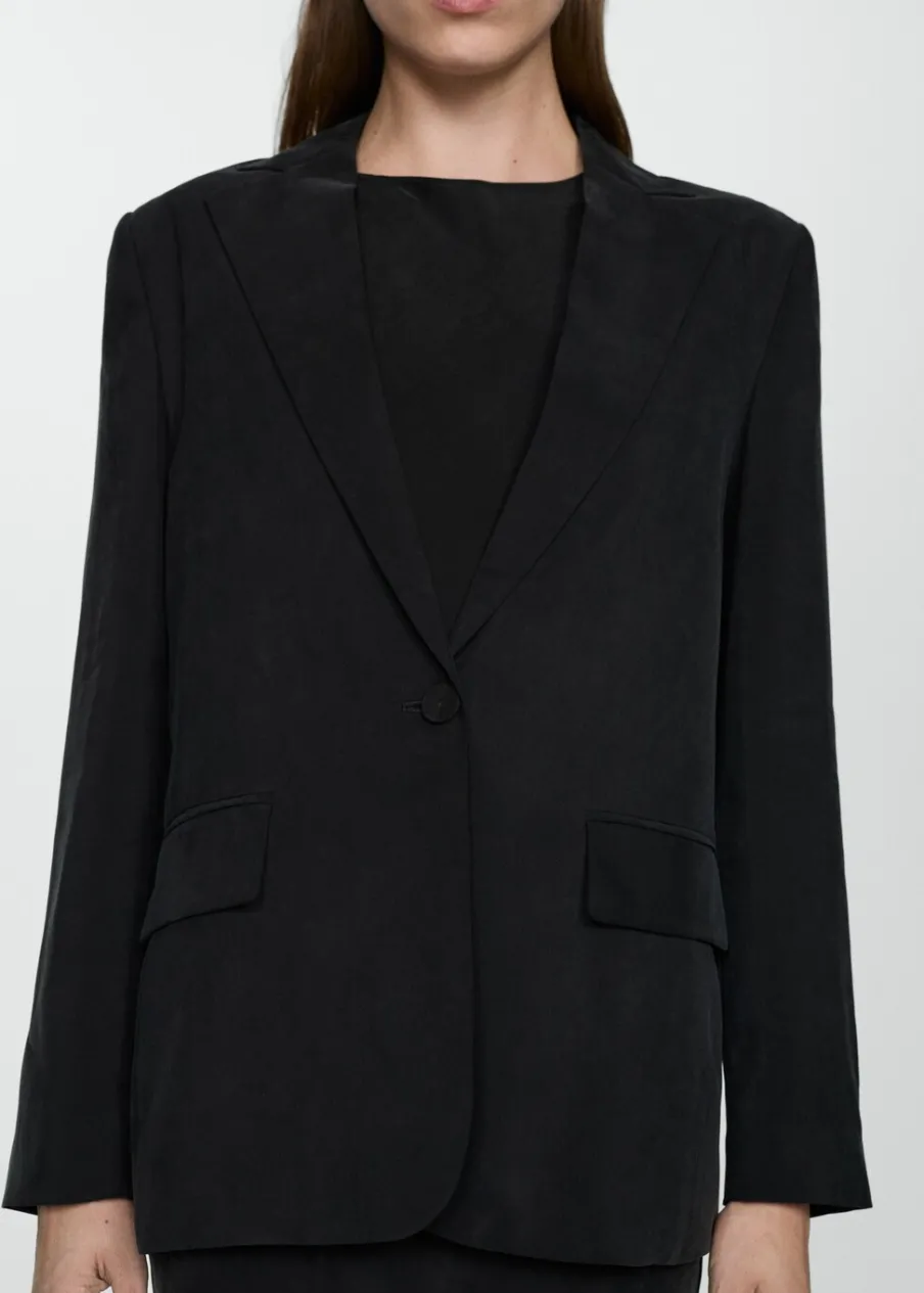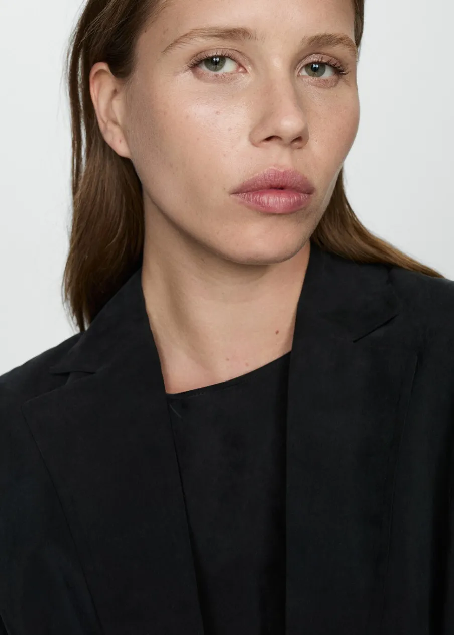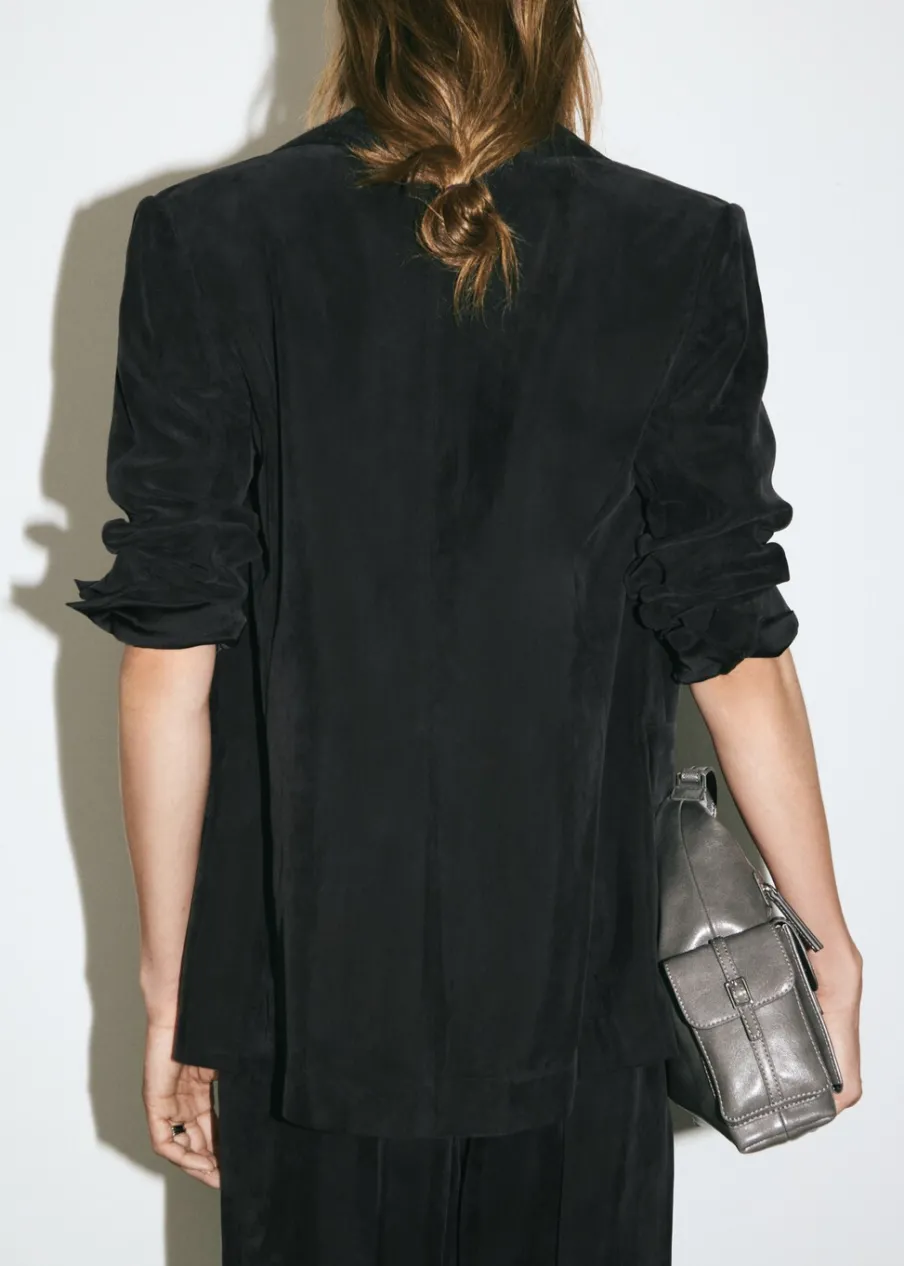 Tkanina z mieszanki włókna cupro. Model prosty. Dekolt w szpic z kołnierzykiem. Długi rękaw. Zapięcie z przodu na guzik. Wewnętrzna podszewka. Total look.