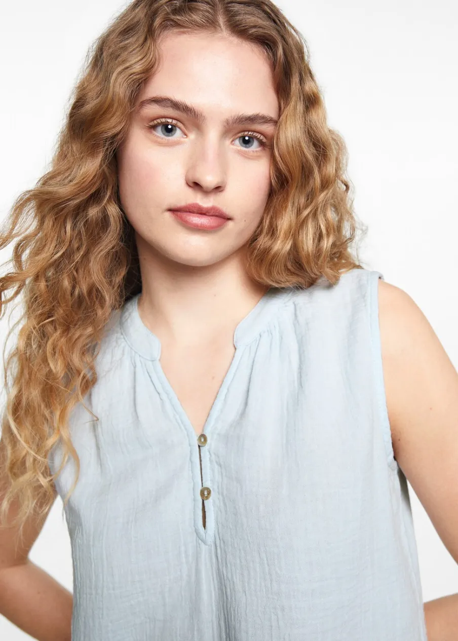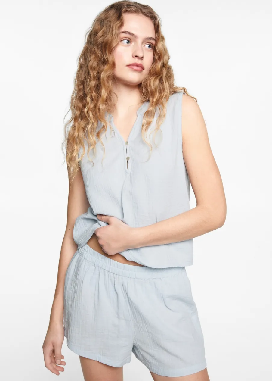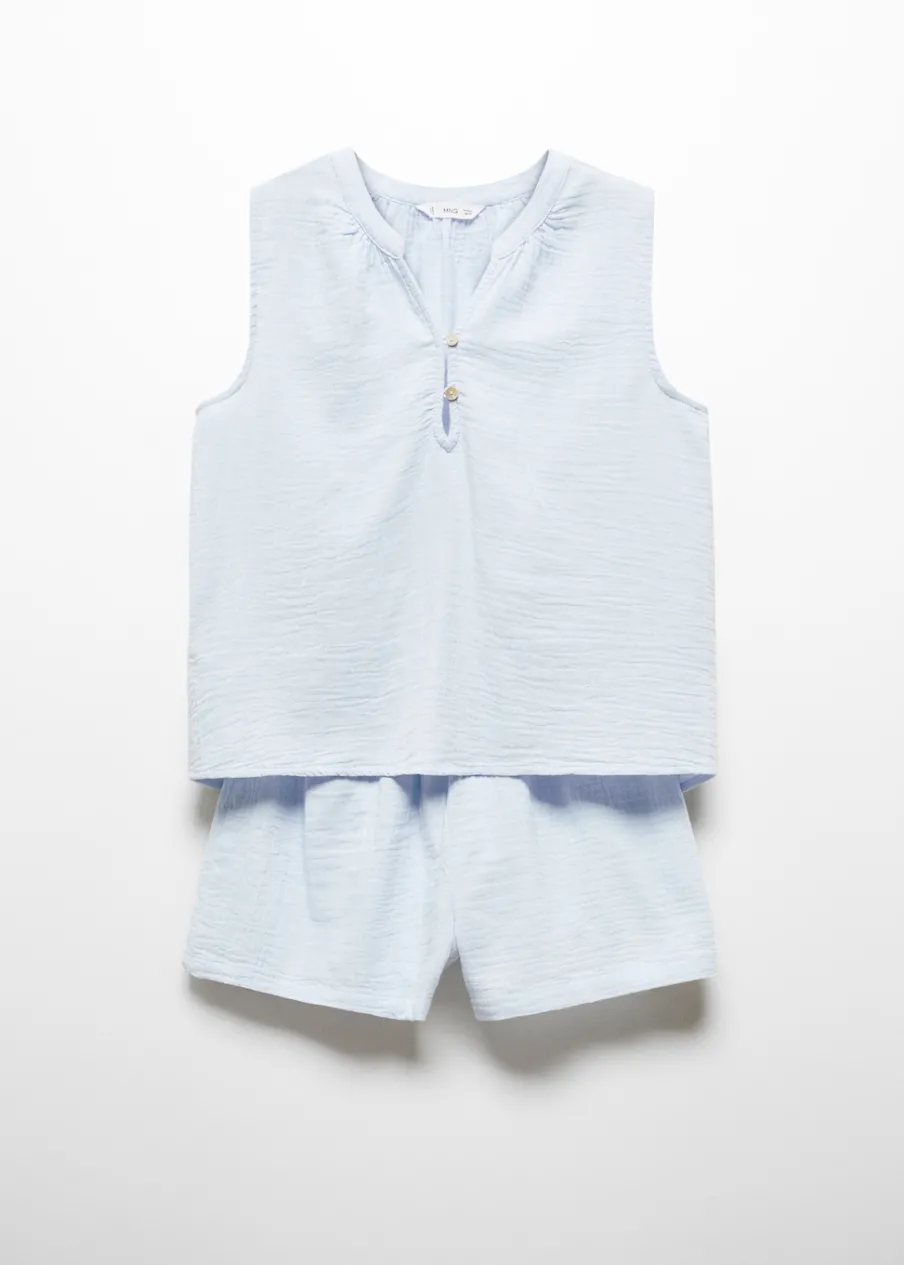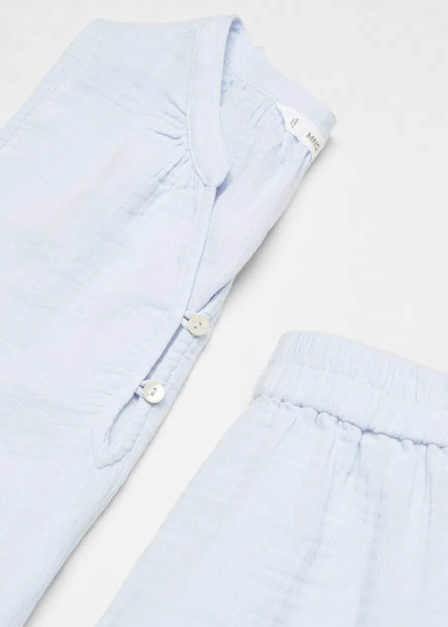 Zestaw piżamowy: koszulka i spodnie. Kreszowana tkanina. Tkanina bawełniana. Krótki krój. Dekolt V. Bez rękawów. Elastyczny pas. Zapięcie na guziki.