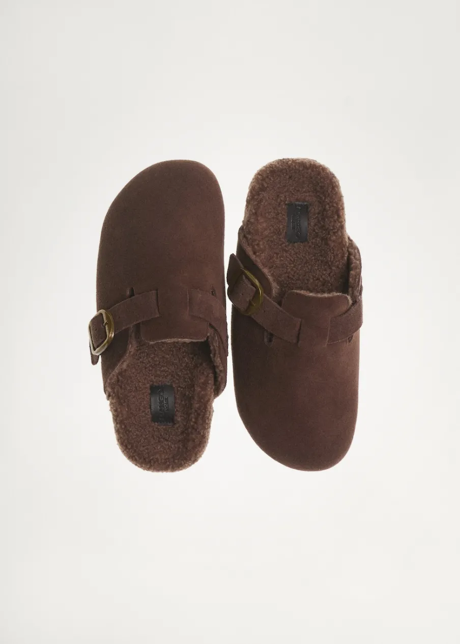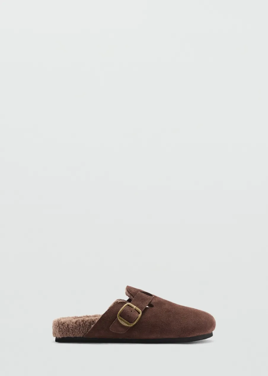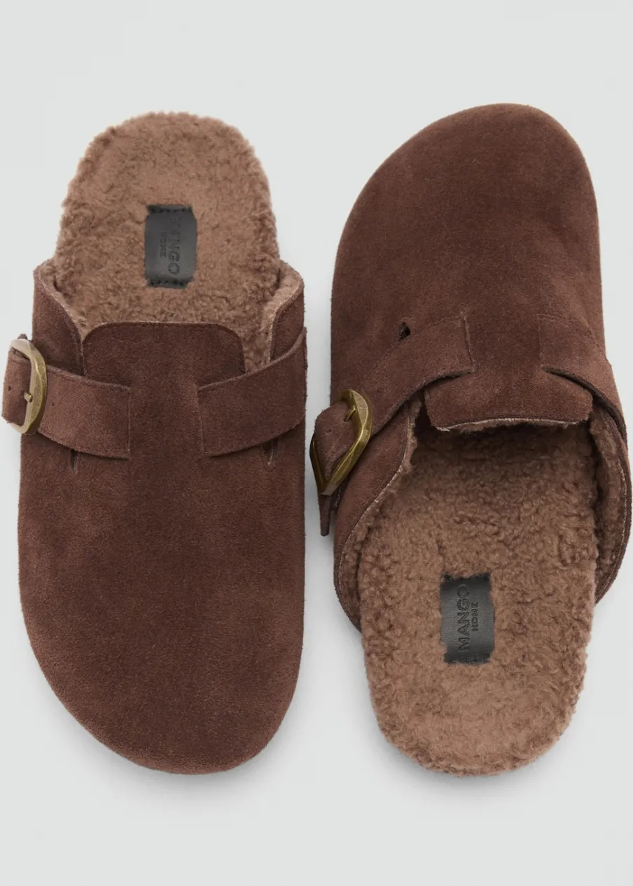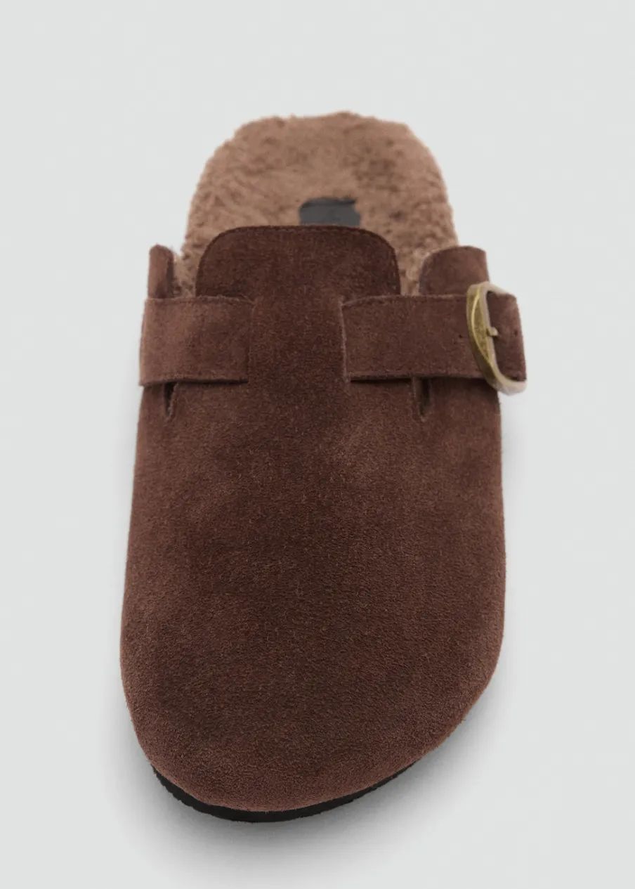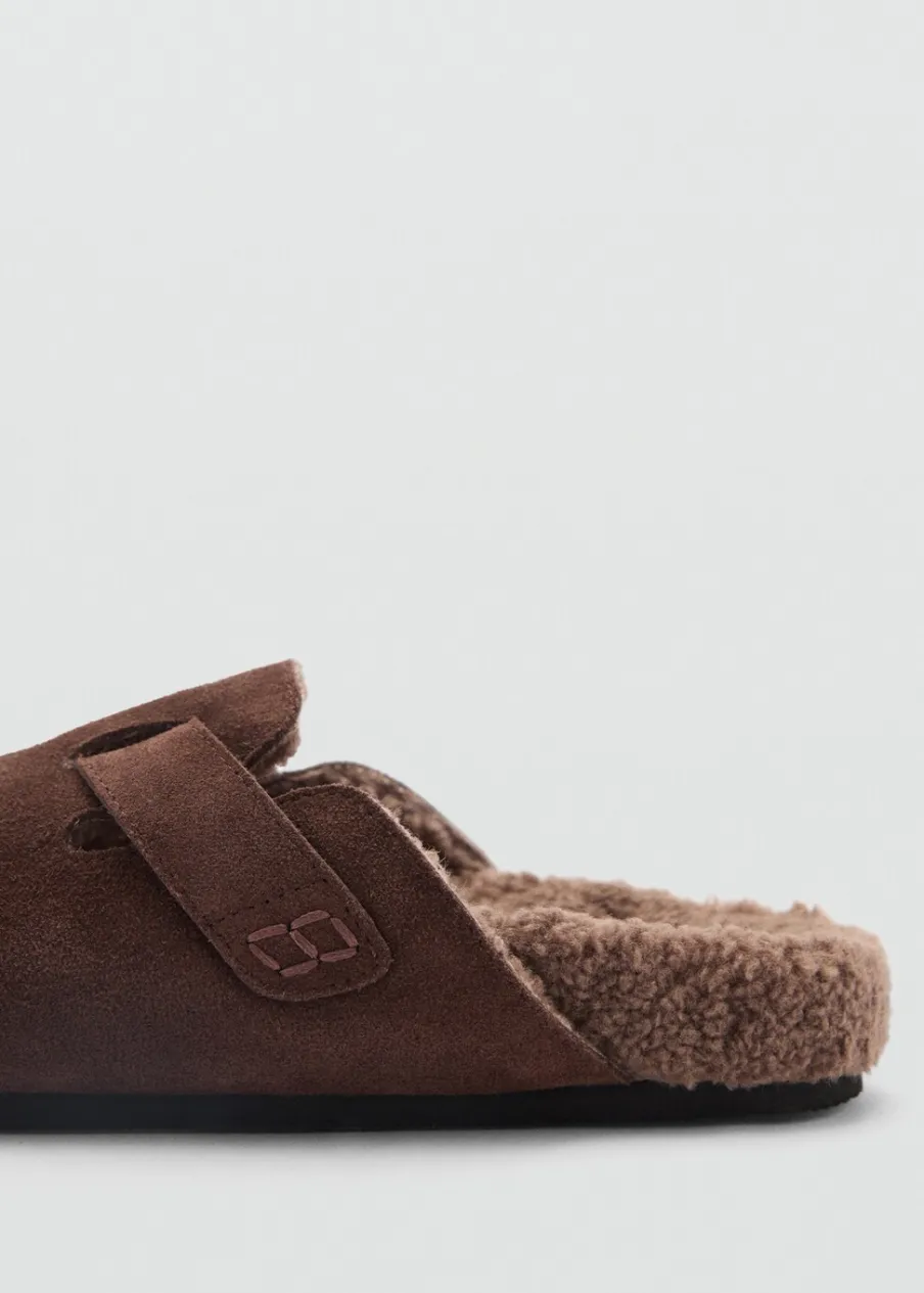 100% skóra bydlęca. Dwoina skórzana. Okrągły nosek. Model łączony. Ozdobna klamra. Wewnętrzna podszewka. Sztuczny baranek. Kapcie domowe. Model z odkrytą piętą. Wygodny i ciepły model.