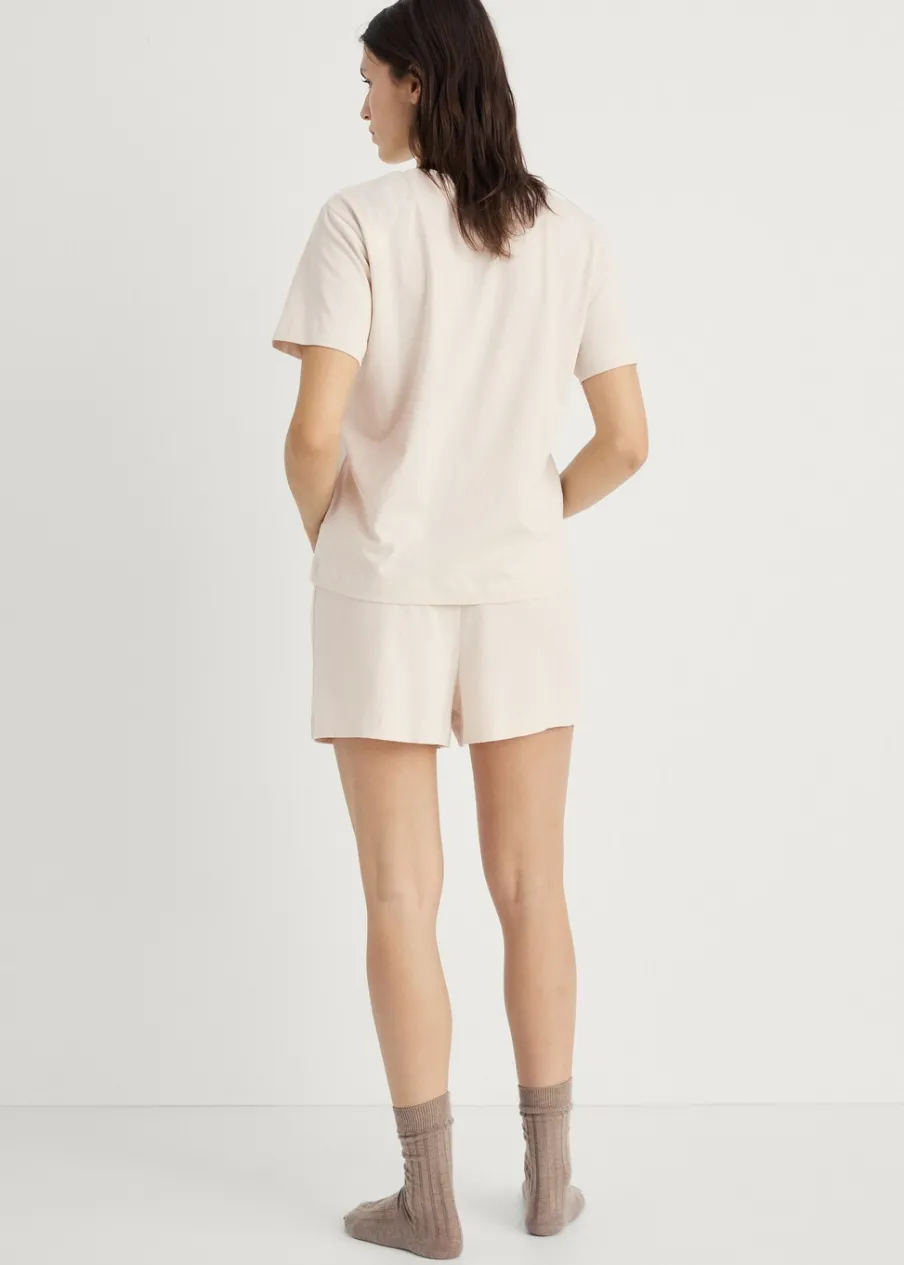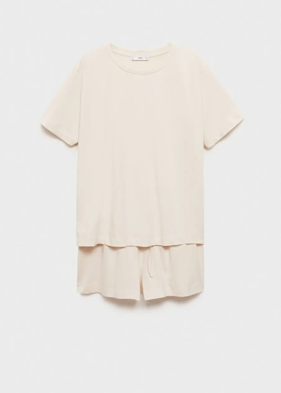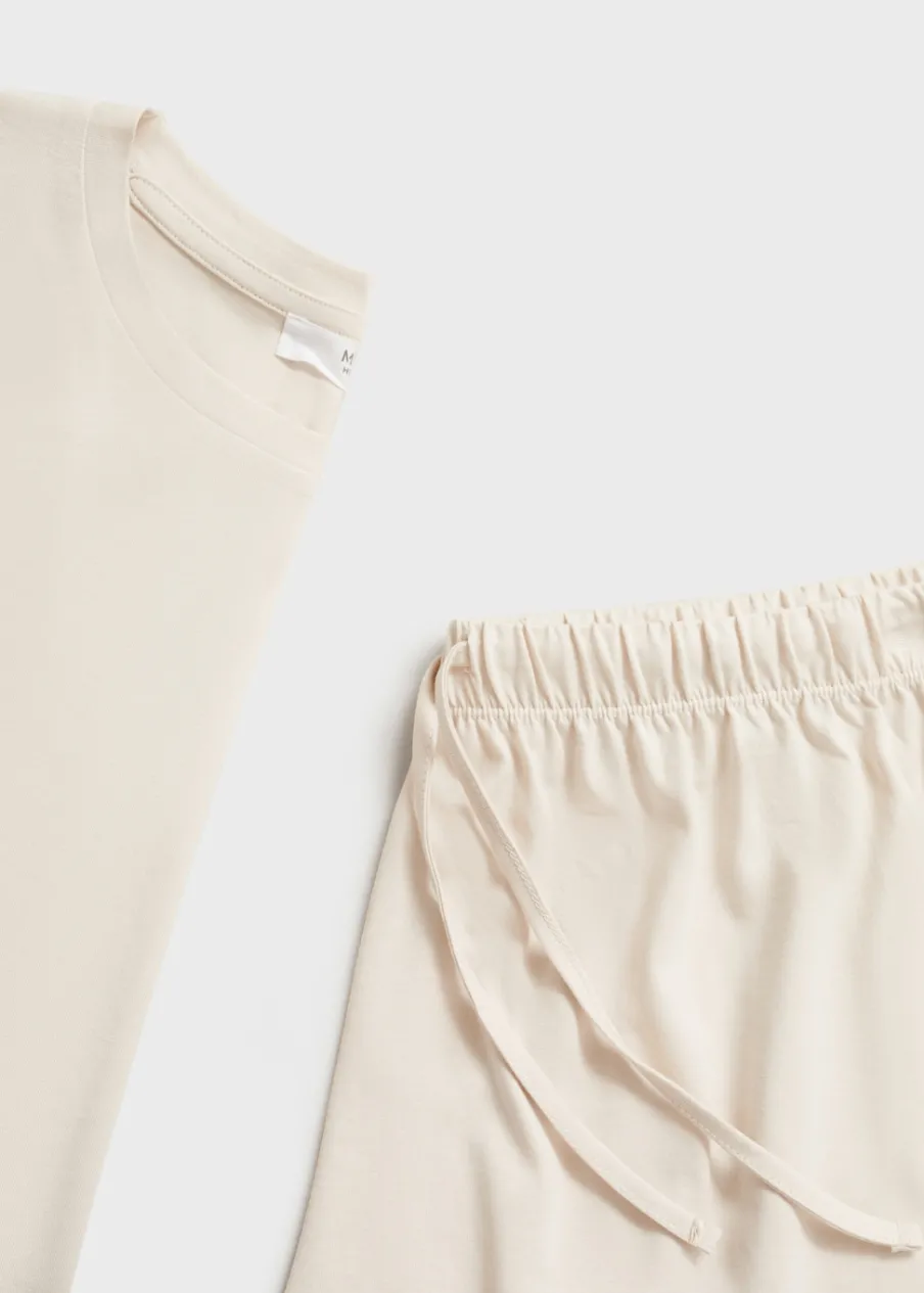 Zestaw piżamowy: koszulka i spodnie. Tkanina z 100% bawełny. Krótki rękaw. Krótkie spodenki. Okrągły dekolt.