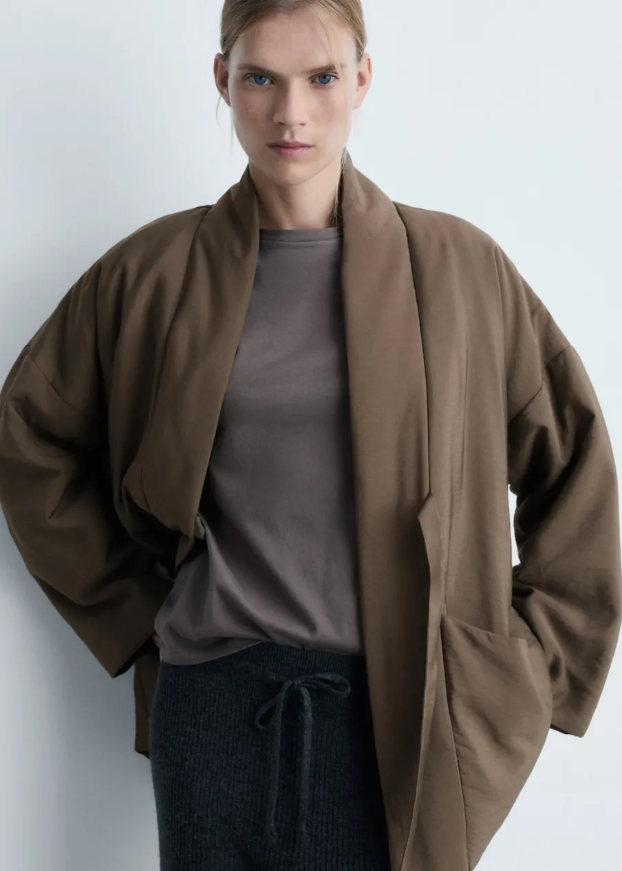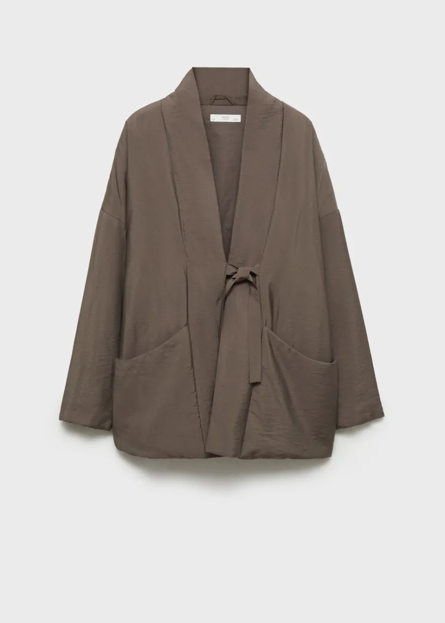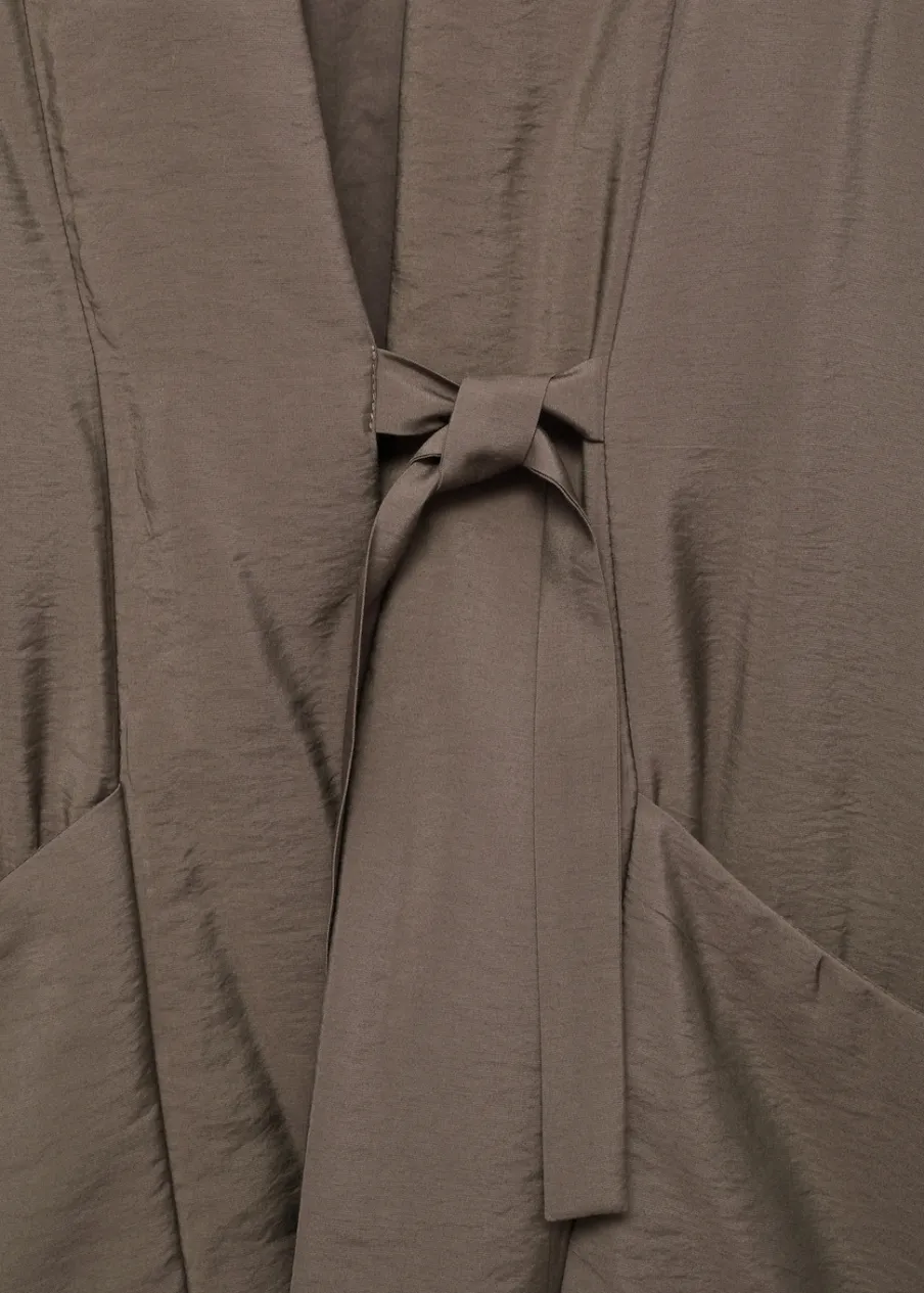 Satynowa tkanina. Model oversize. Model pikowany. Dekolt V. Długi rękaw. Dwie kieszenie nakładane z przodu. Duże kieszenie. Wiązanie z przodu.