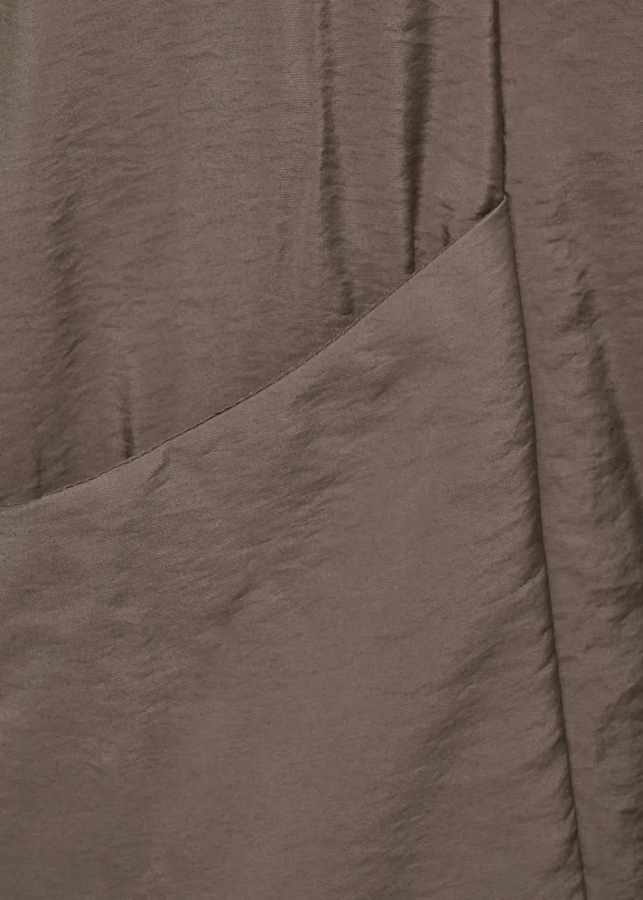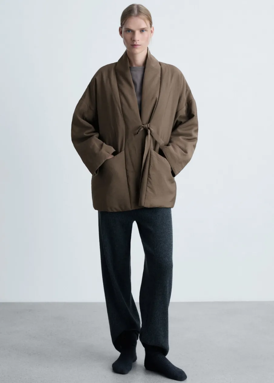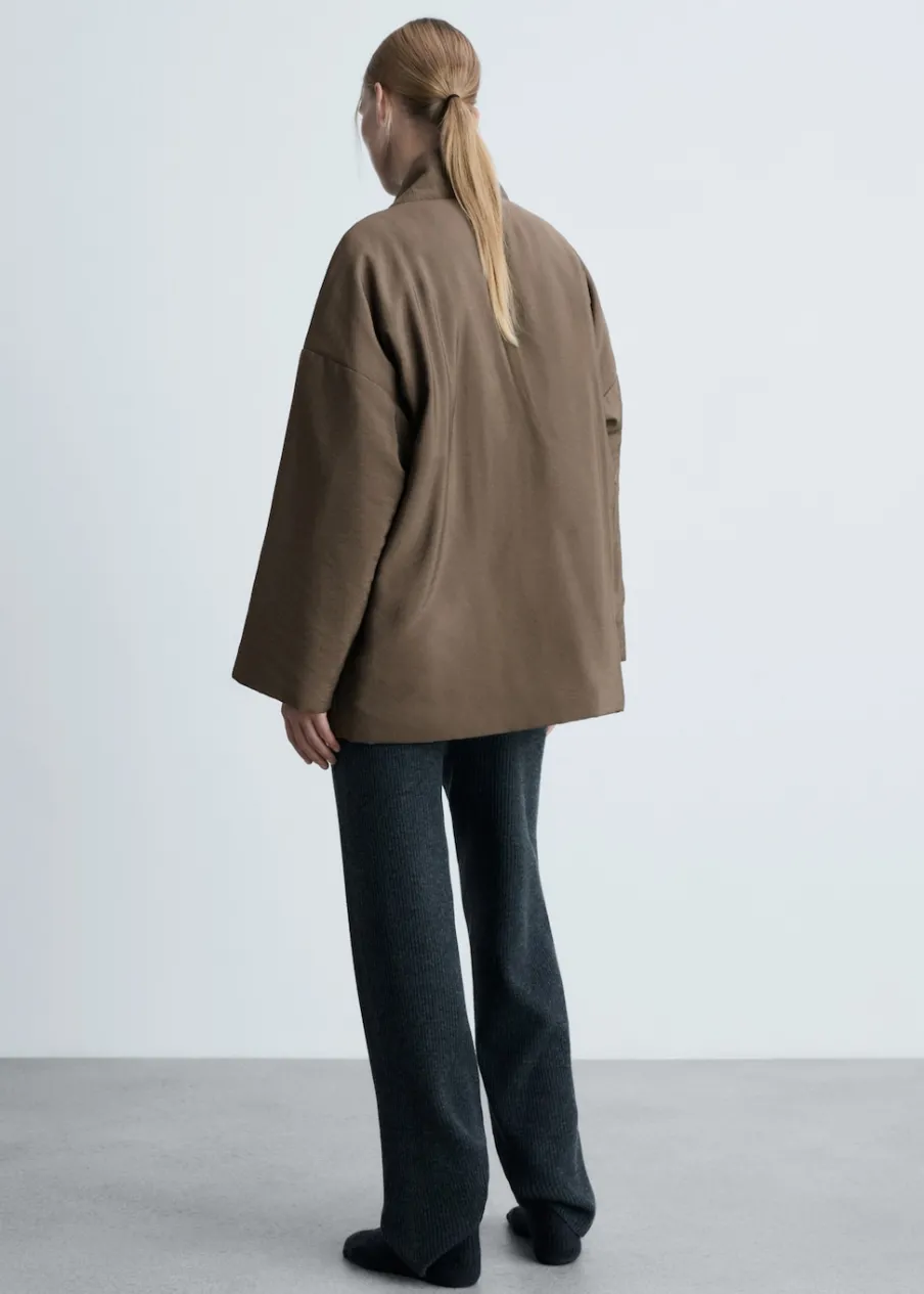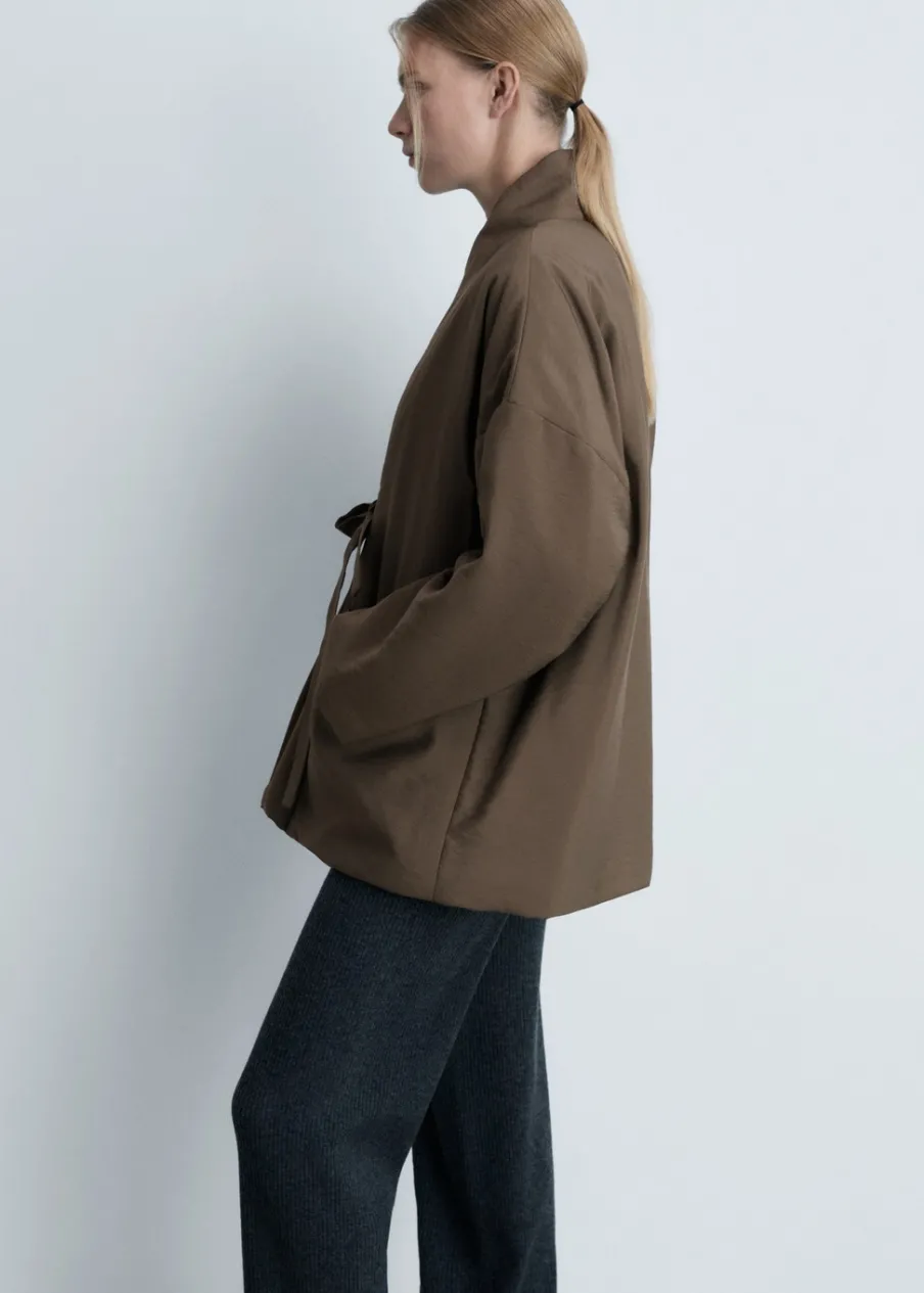 Satynowa tkanina. Model oversize. Model pikowany. Dekolt V. Długi rękaw. Dwie kieszenie nakładane z przodu. Duże kieszenie. Wiązanie z przodu.