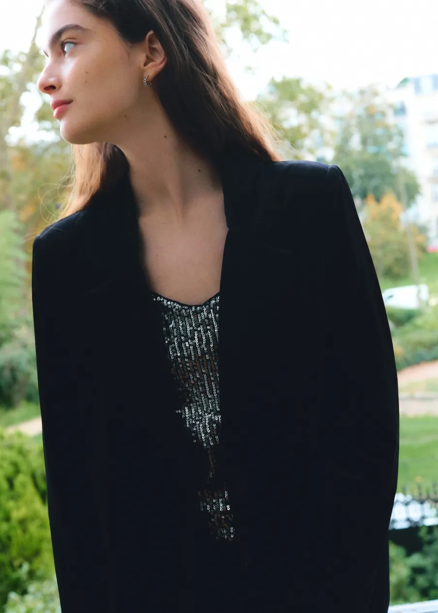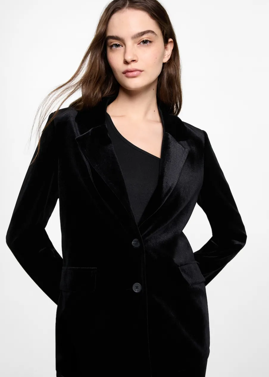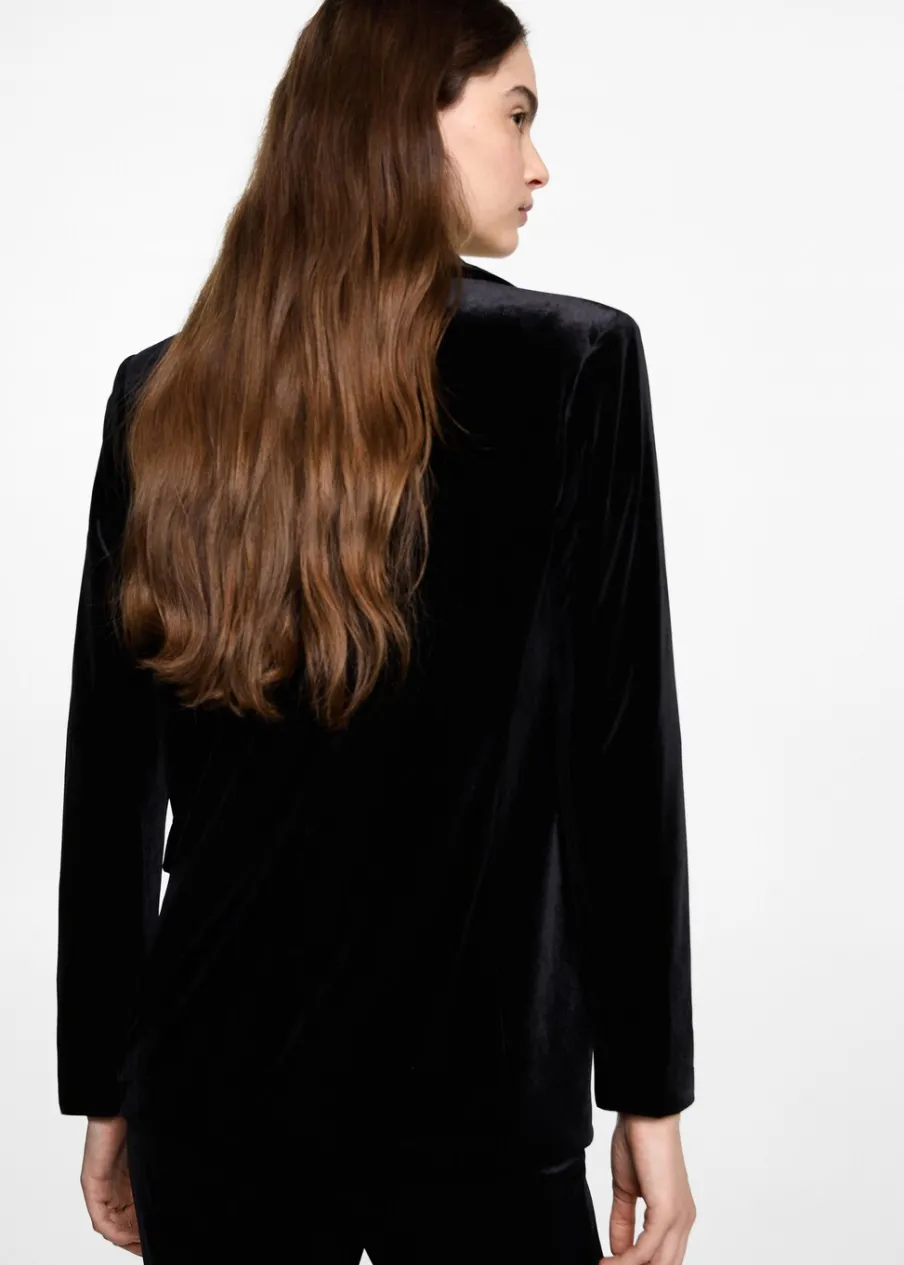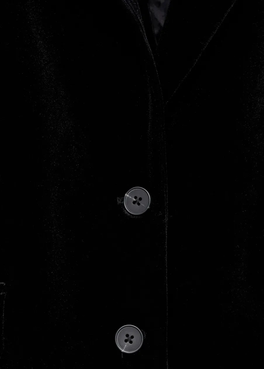 Kolekcja wieczorowa i imprezowa. Aksamitna tkanina. Model prosty. Klapy. Długi rękaw. Dwie kieszenie boczne. Zapięcie na guziki. Modelka ma 172 cm wzrostu i nosi rozmiar M.