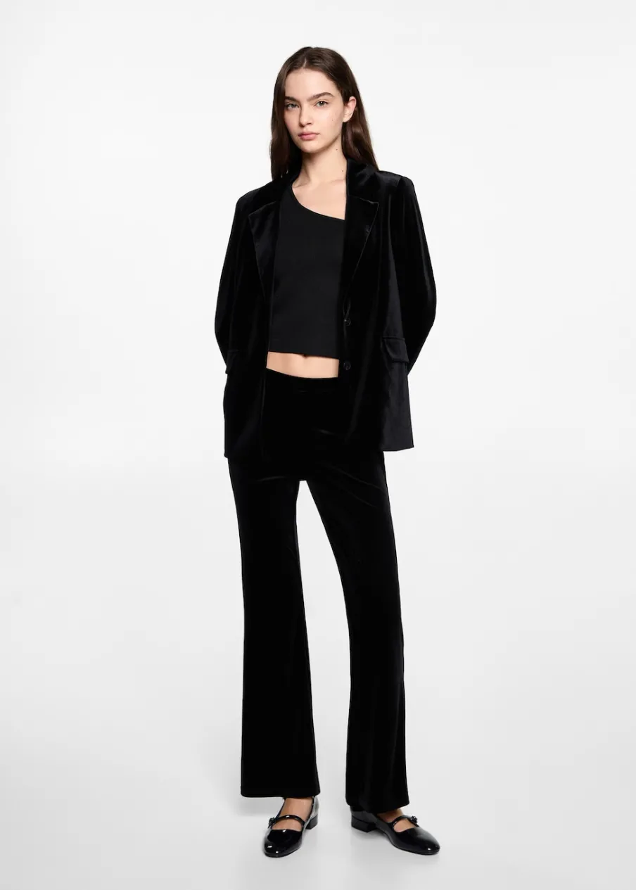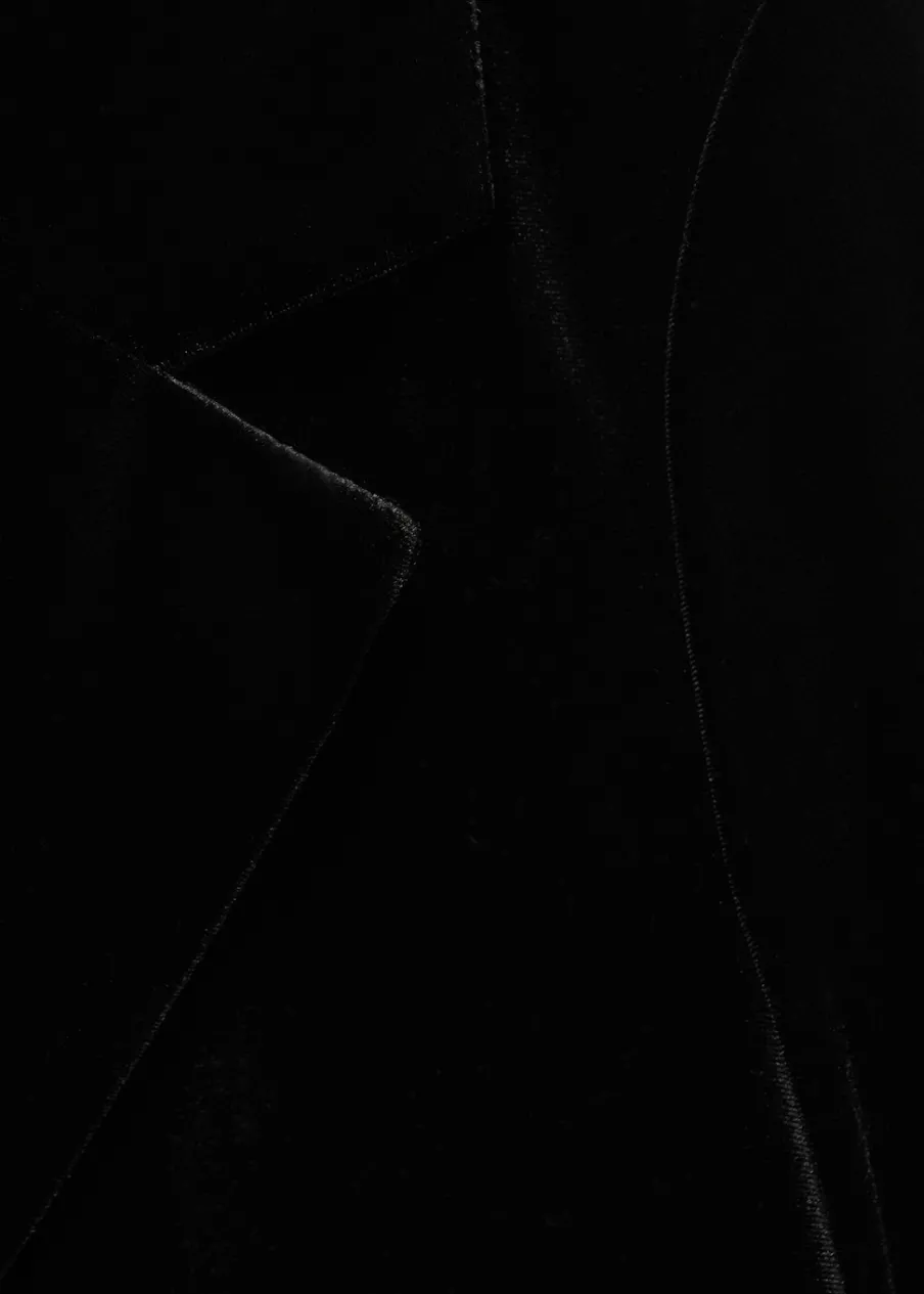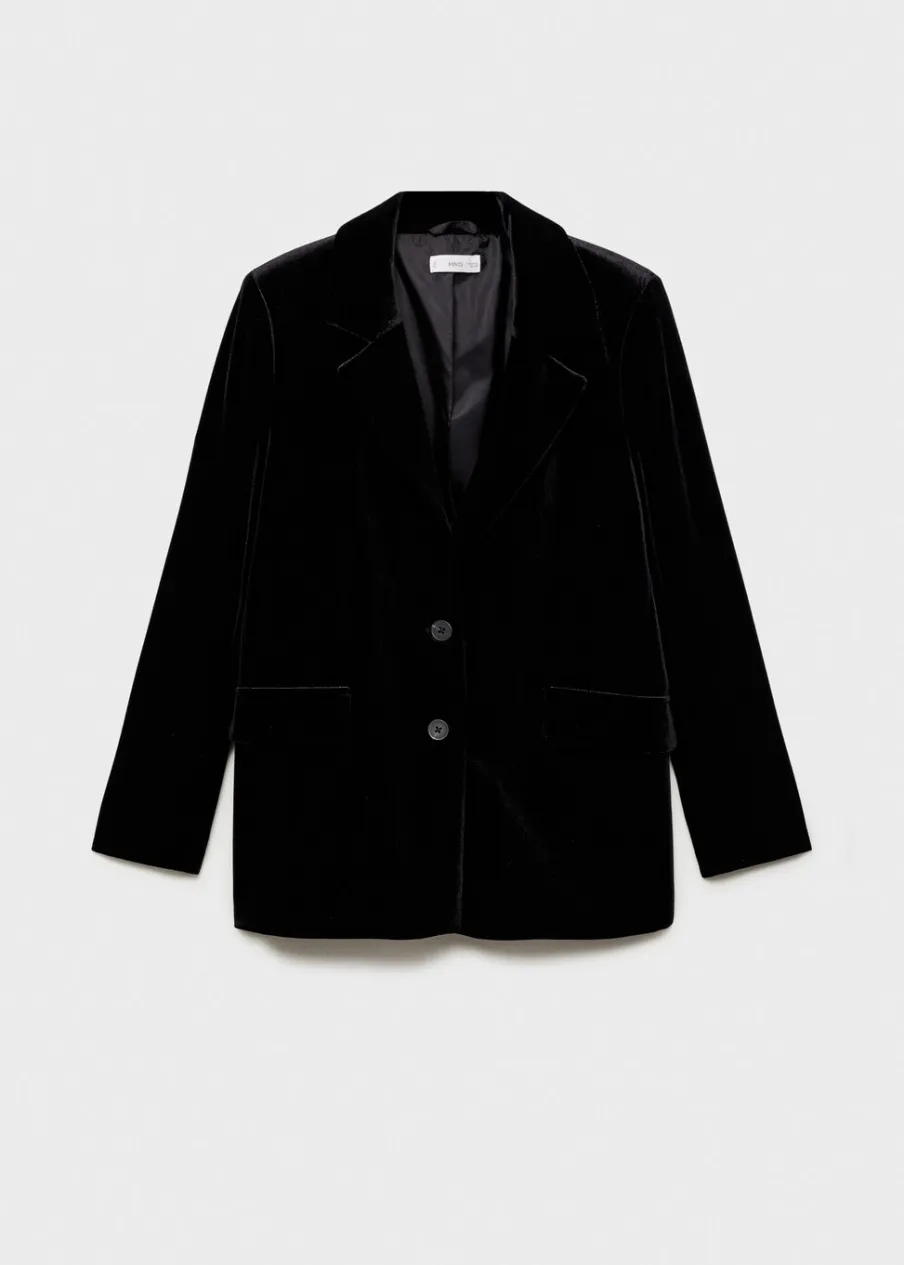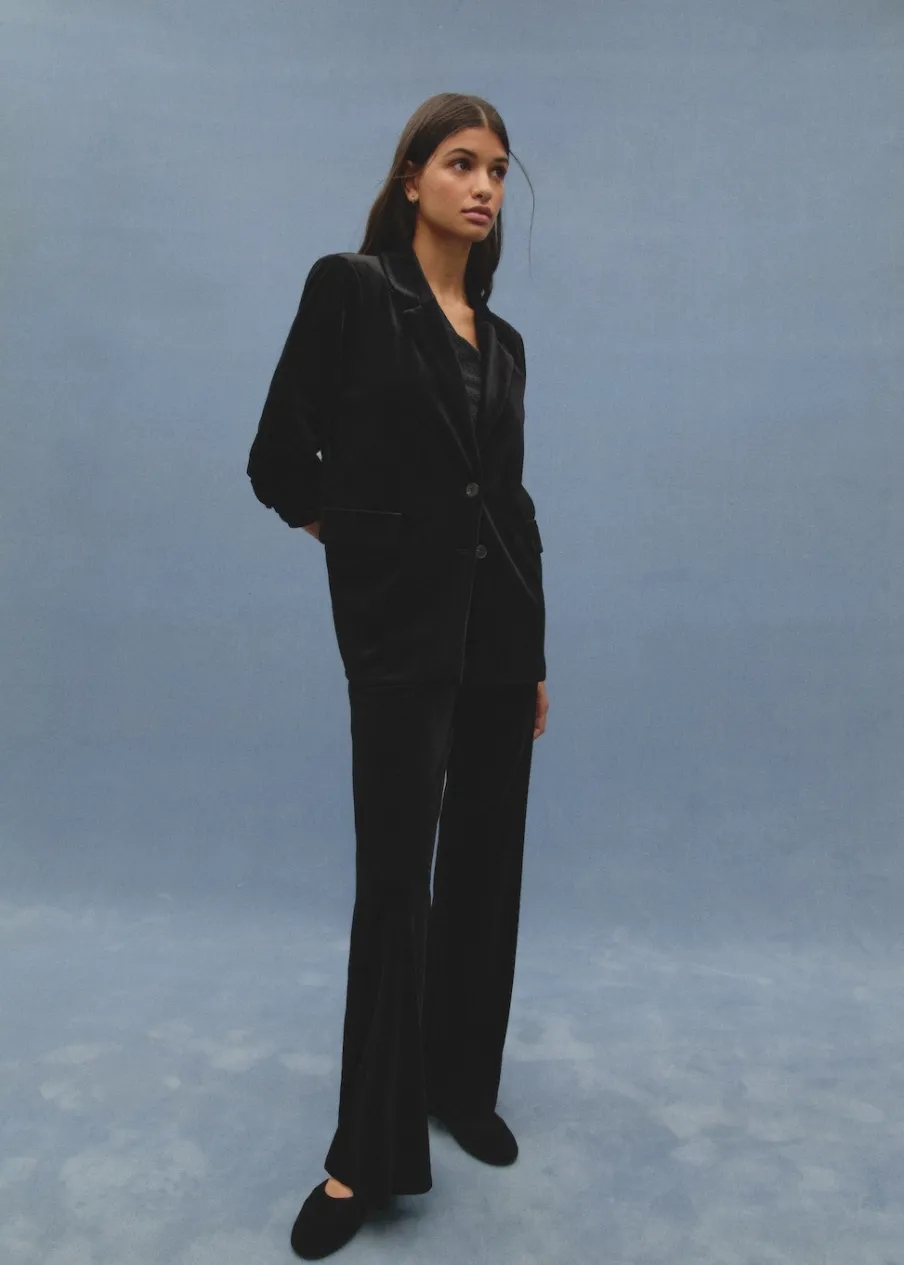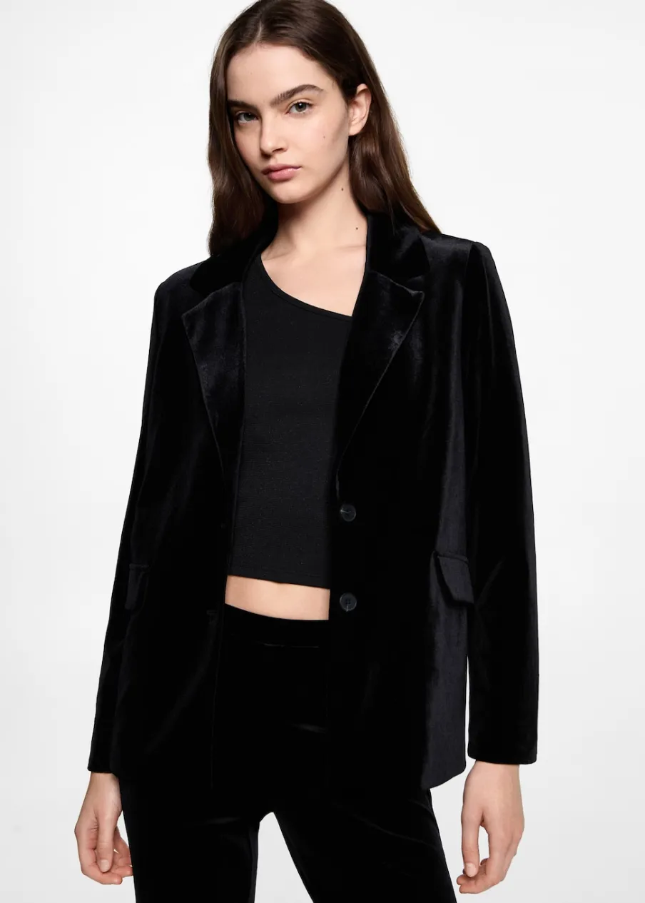 Kolekcja wieczorowa i imprezowa. Aksamitna tkanina. Model prosty. Klapy. Długi rękaw. Dwie kieszenie boczne. Zapięcie na guziki. Modelka ma 172 cm wzrostu i nosi rozmiar M.