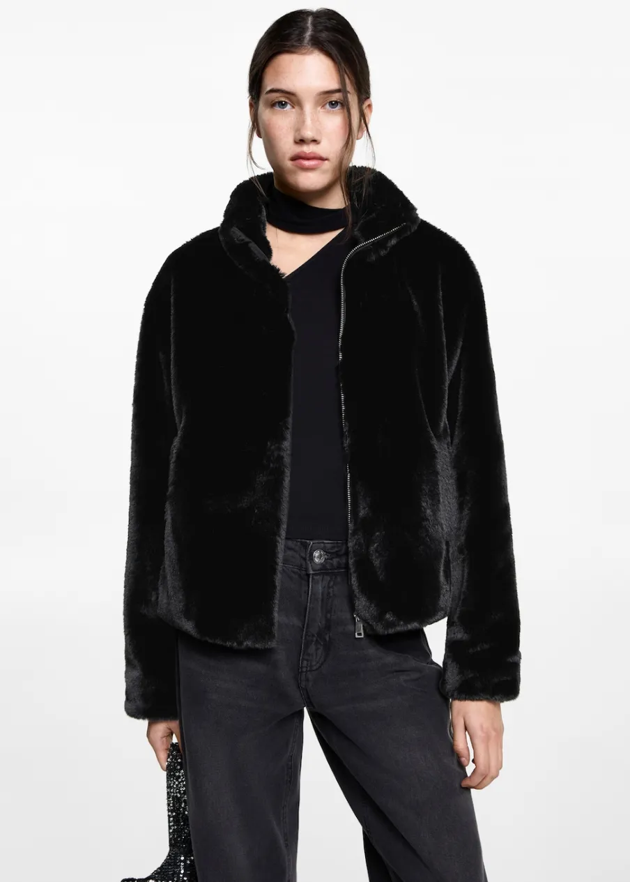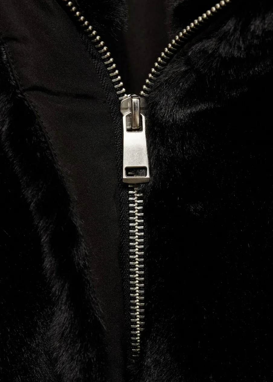 Futrzana tkanina. Fason o średniej długości. Długi rękaw. Golf. Dwie kieszenie boczne. Wewnętrzna podszewka. Zapięcie na suwak. Party Collection. Kolekcja wieczorowa i imprezowa.