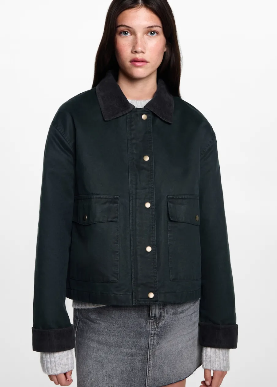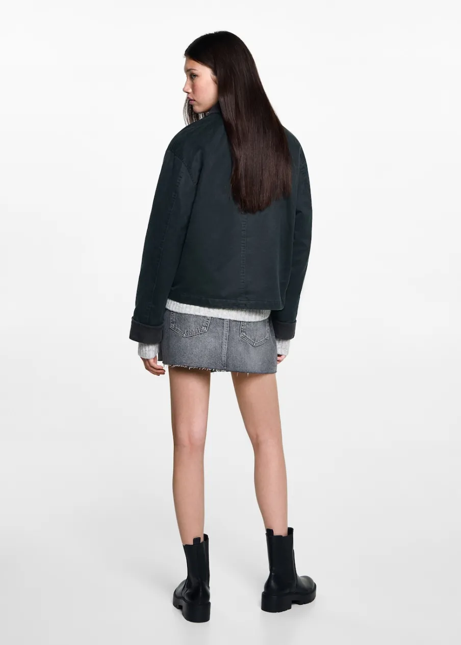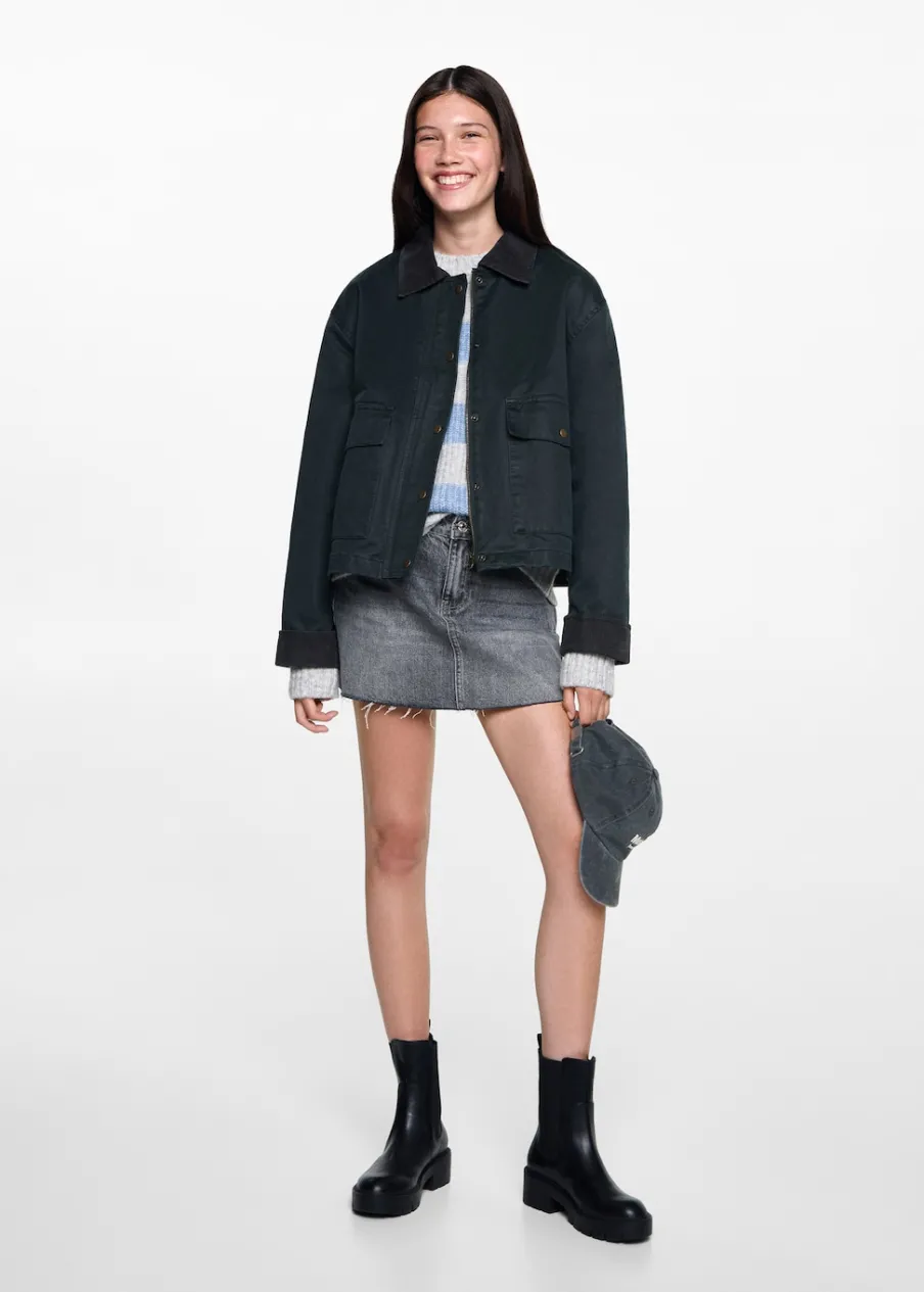 Tkanina z bawełną. Model prosty. Wstawki ze sztruksu. Krótki krój. Dwie kieszenie boczne. Zapięcie na suwak i guzik. Modelka ma 172 cm wzrostu i nosi rozmiar M. Powrót do szkoły.
