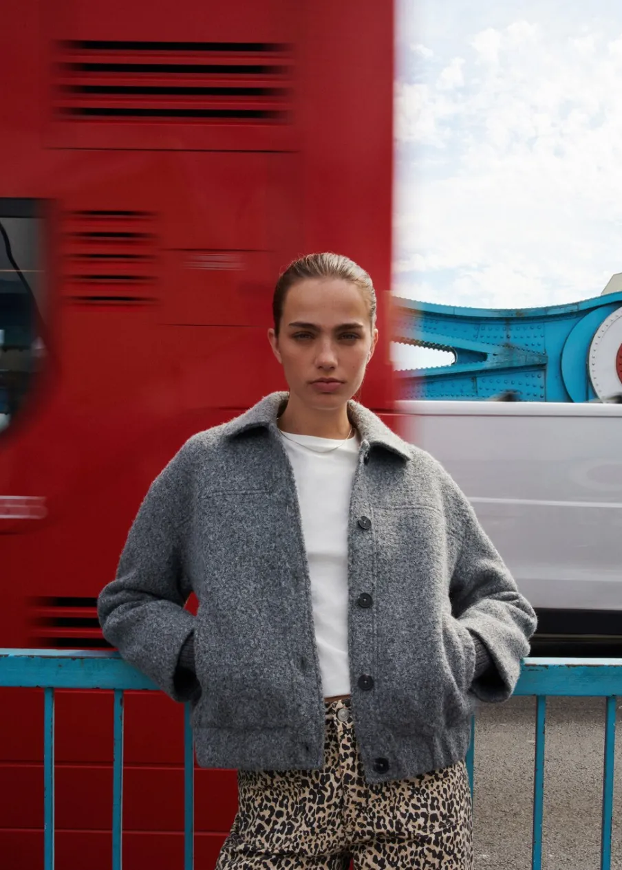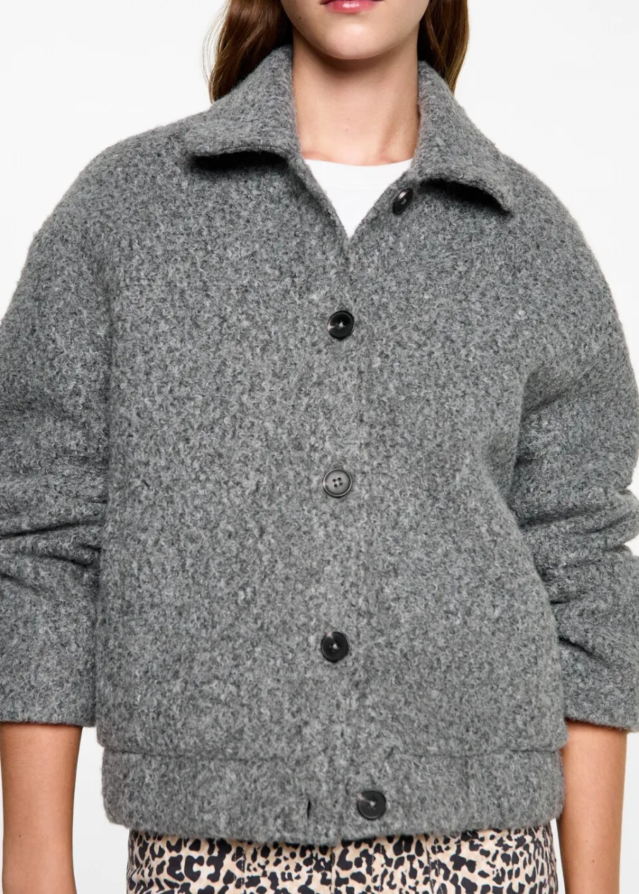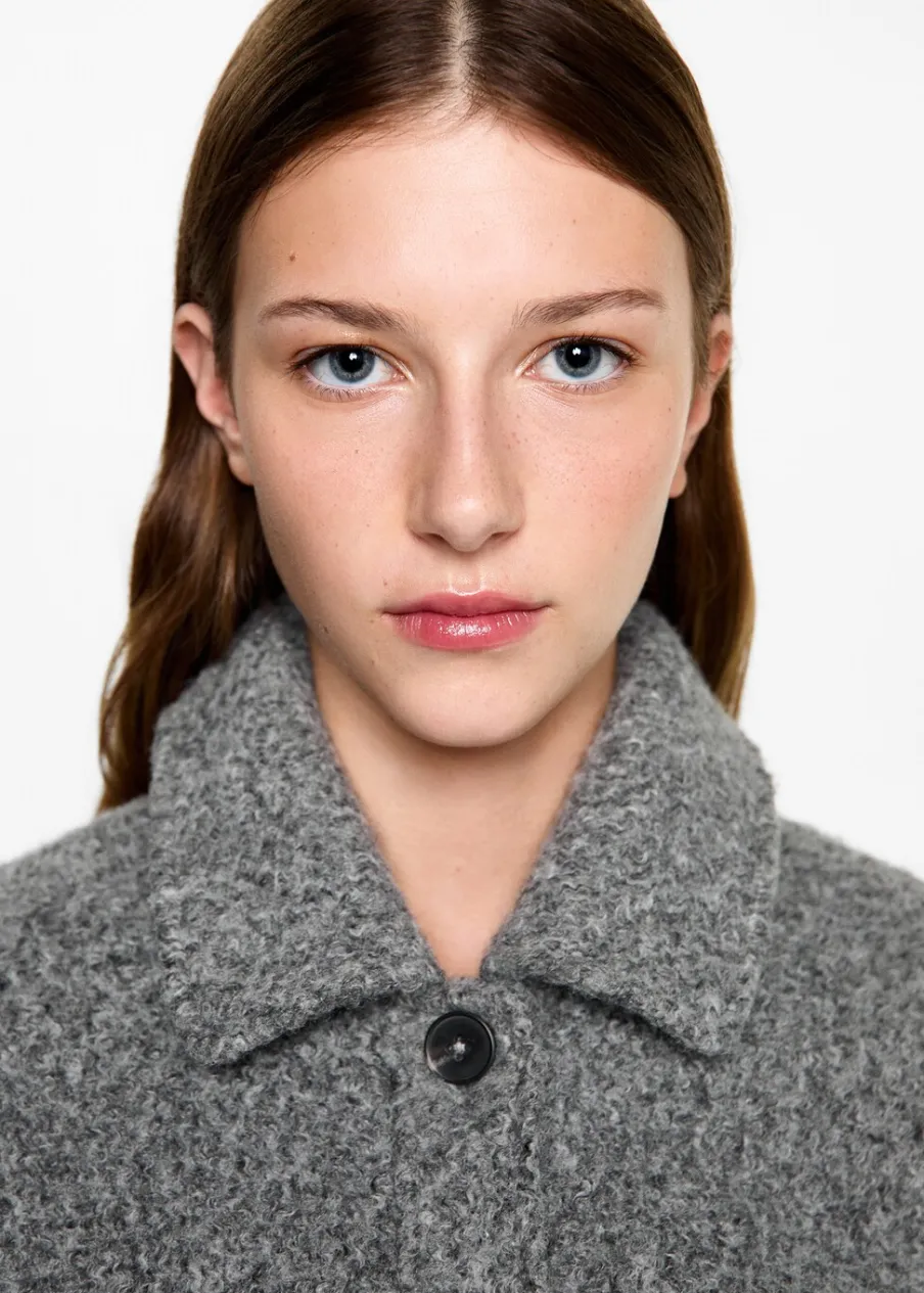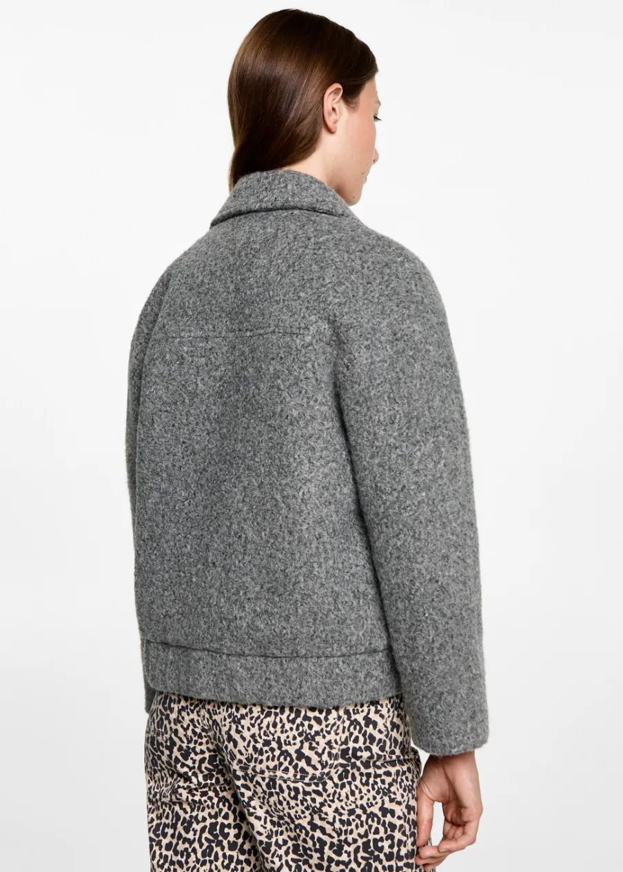 Powrót do szkoły. Krótki krój. Koszulowy kołnierz. Długi rękaw. Dwie kieszenie boczne. Zapięcie na guziki. Tkanina bouclé.