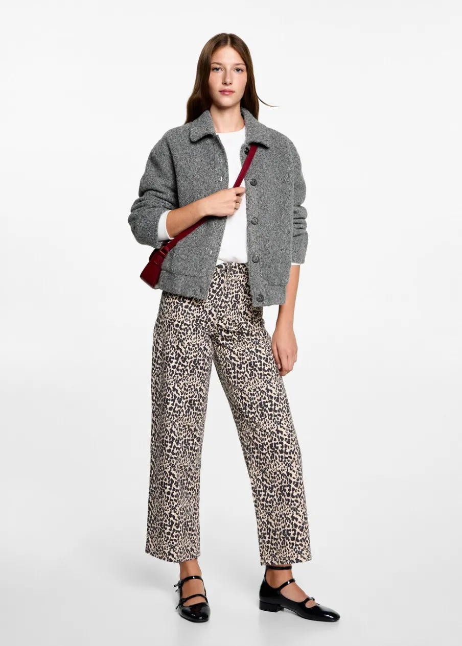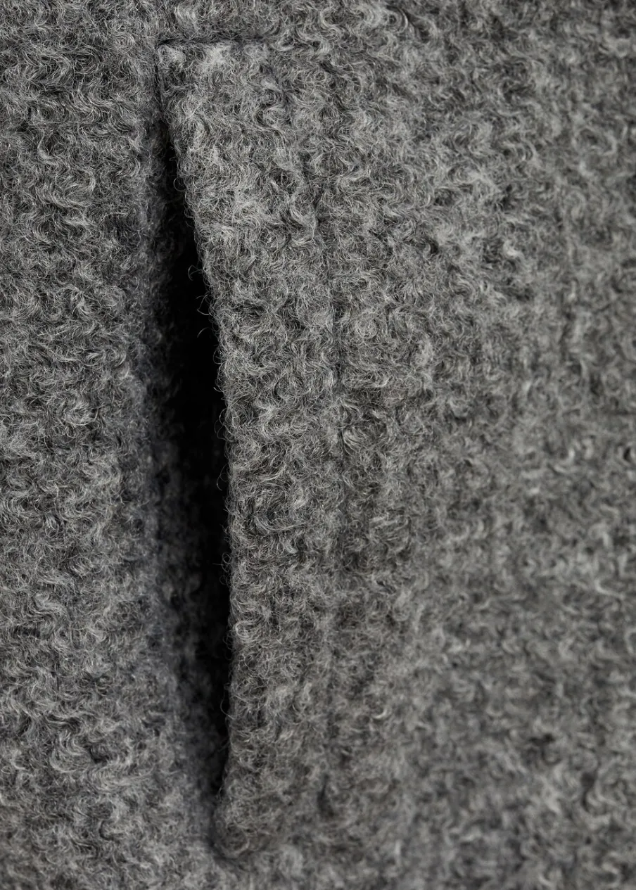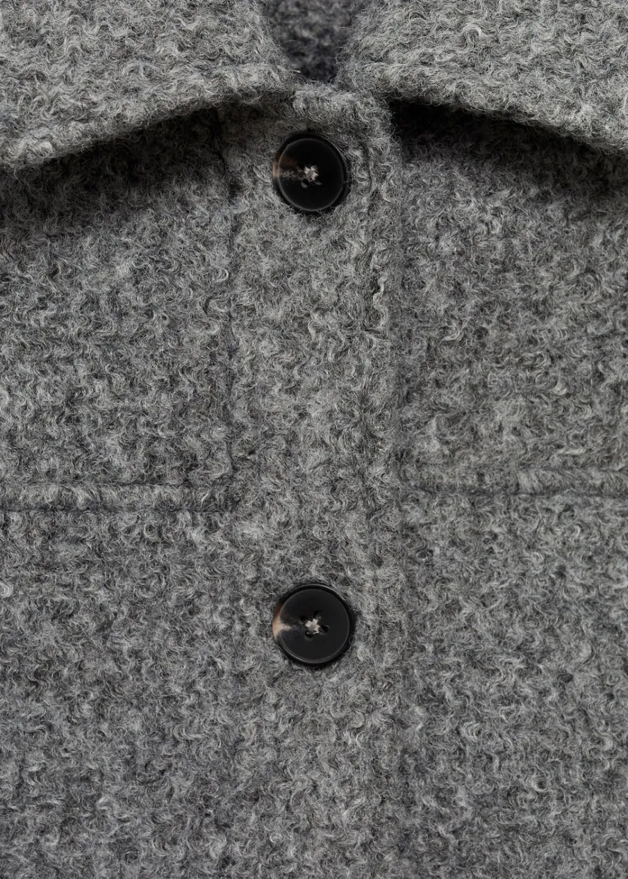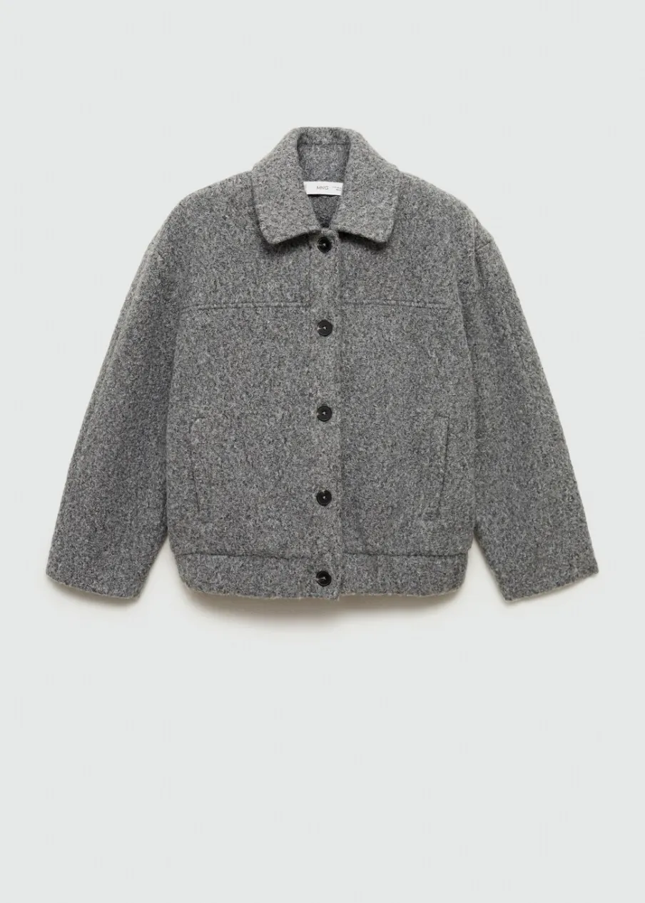Powrót do szkoły. Krótki krój. Koszulowy kołnierz. Długi rękaw. Dwie kieszenie boczne. Zapięcie na guziki. Tkanina bouclé.