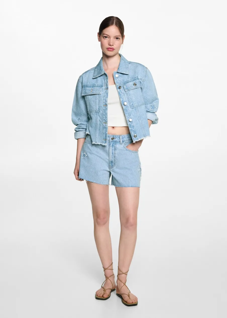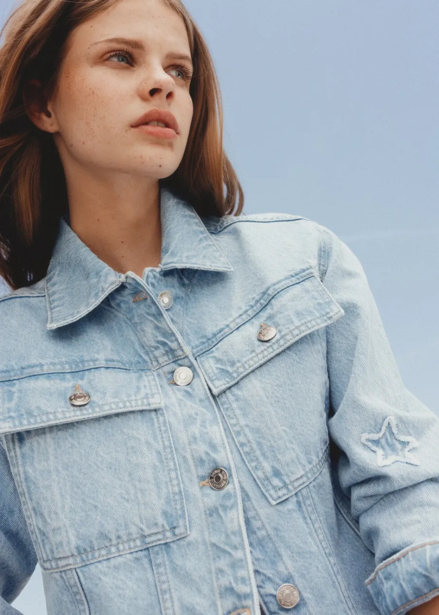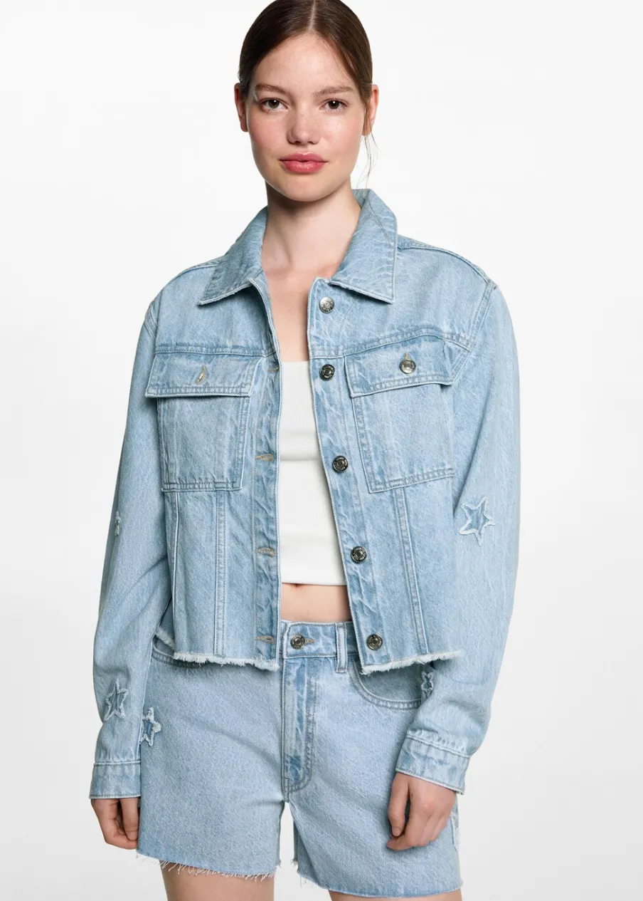 Tkanina bawełniana w dżinsowym stylu. Model prosty. Deseń crop. Haftowane gwiazdki. Deseń w gwiazdki. Dwie kieszenie z przodu. Koszulowy kołnierz. Długi rękaw. Zapięcie na guziki. Postrzępione wykończenia. Powrót do szkoły.