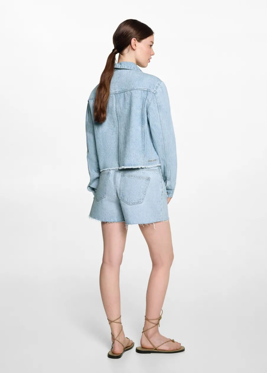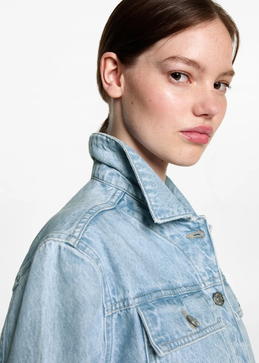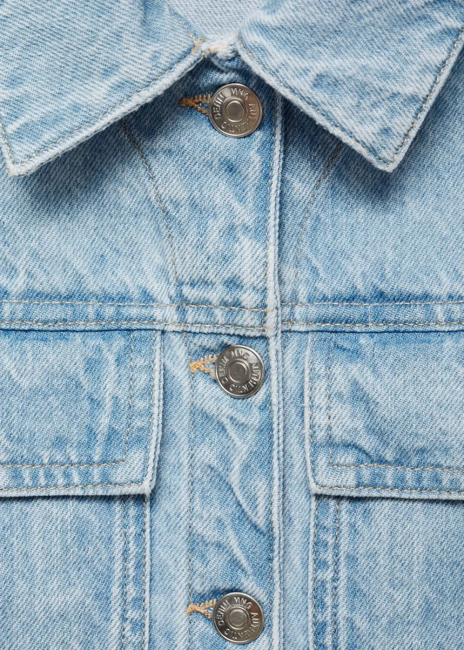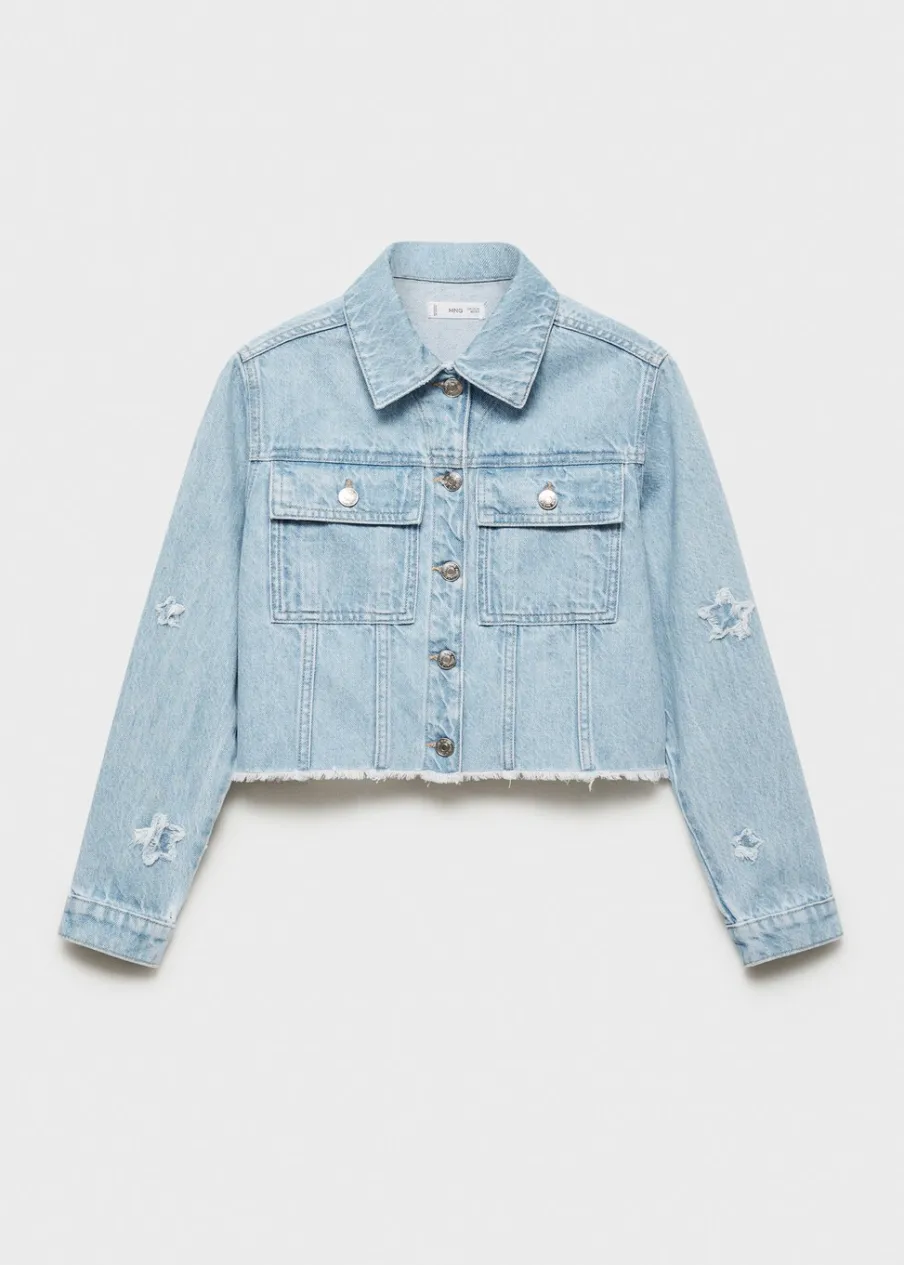 Tkanina bawełniana w dżinsowym stylu. Model prosty. Deseń crop. Haftowane gwiazdki. Deseń w gwiazdki. Dwie kieszenie z przodu. Koszulowy kołnierz. Długi rękaw. Zapięcie na guziki. Postrzępione wykończenia. Powrót do szkoły.
