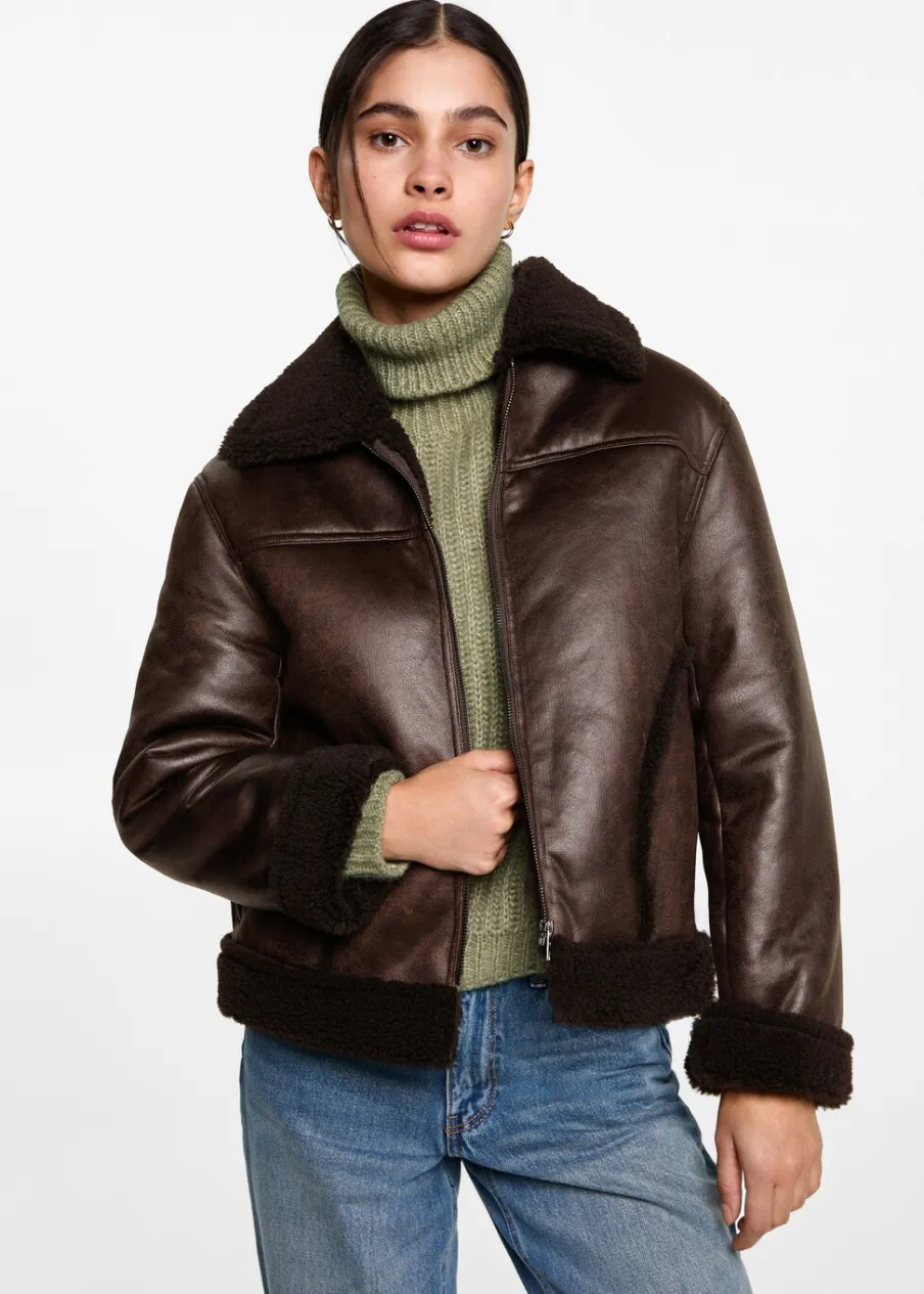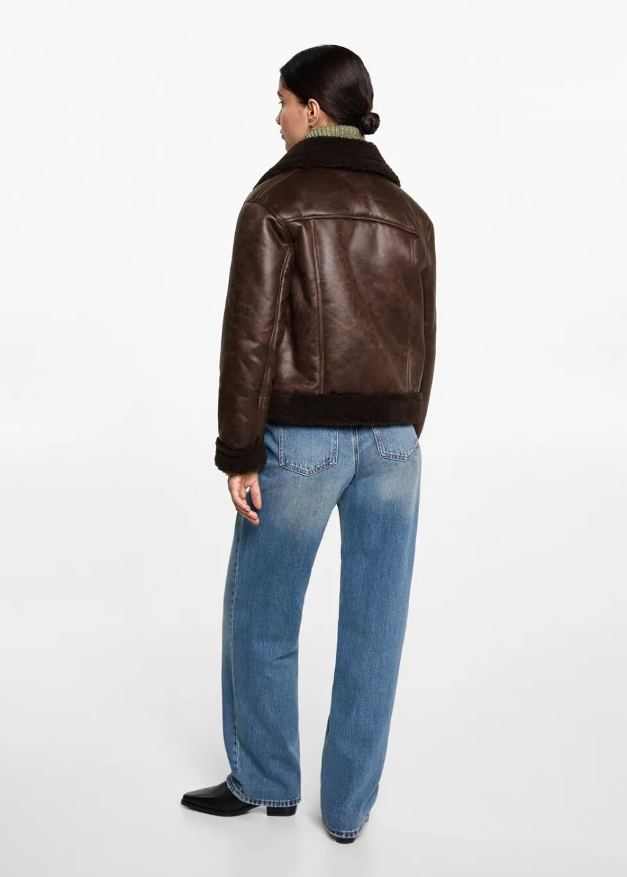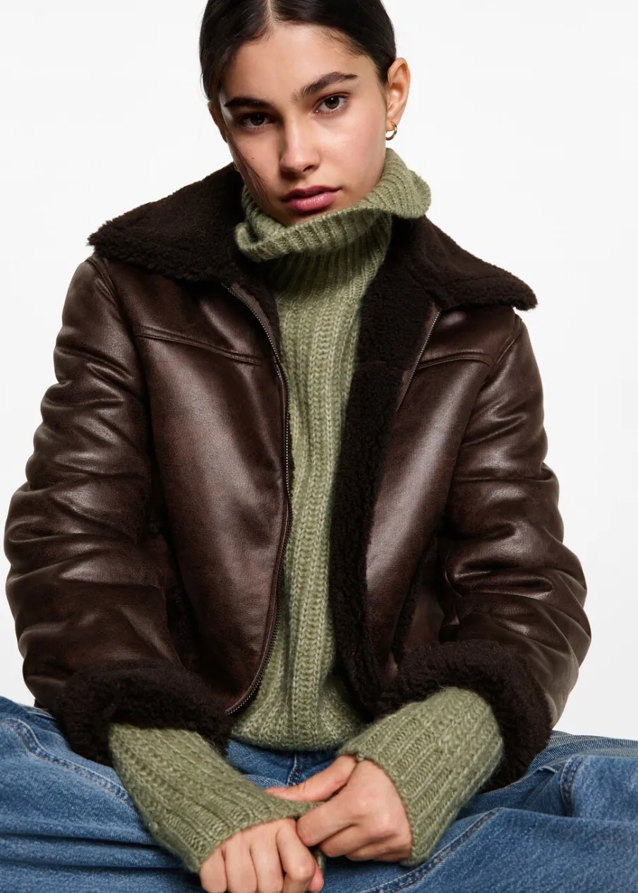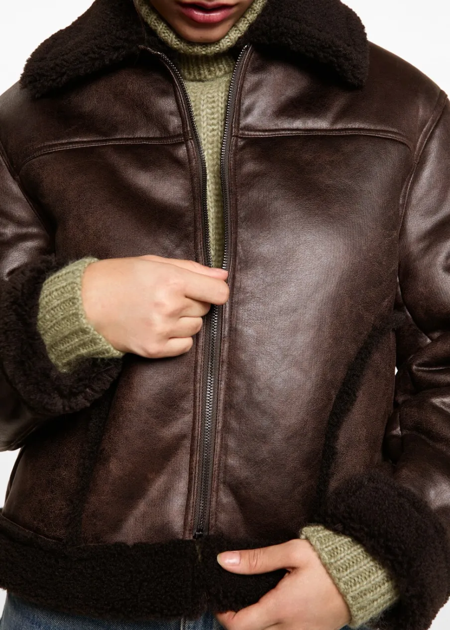 Efekt skóry. Model prosty. Koszulowy kołnierz. Futrzana podszewka z baranka. Długi rękaw. Dwie kieszenie boczne. Zapięcie na suwak. Modelka ma 172 cm wzrostu i nosi rozmiar M.