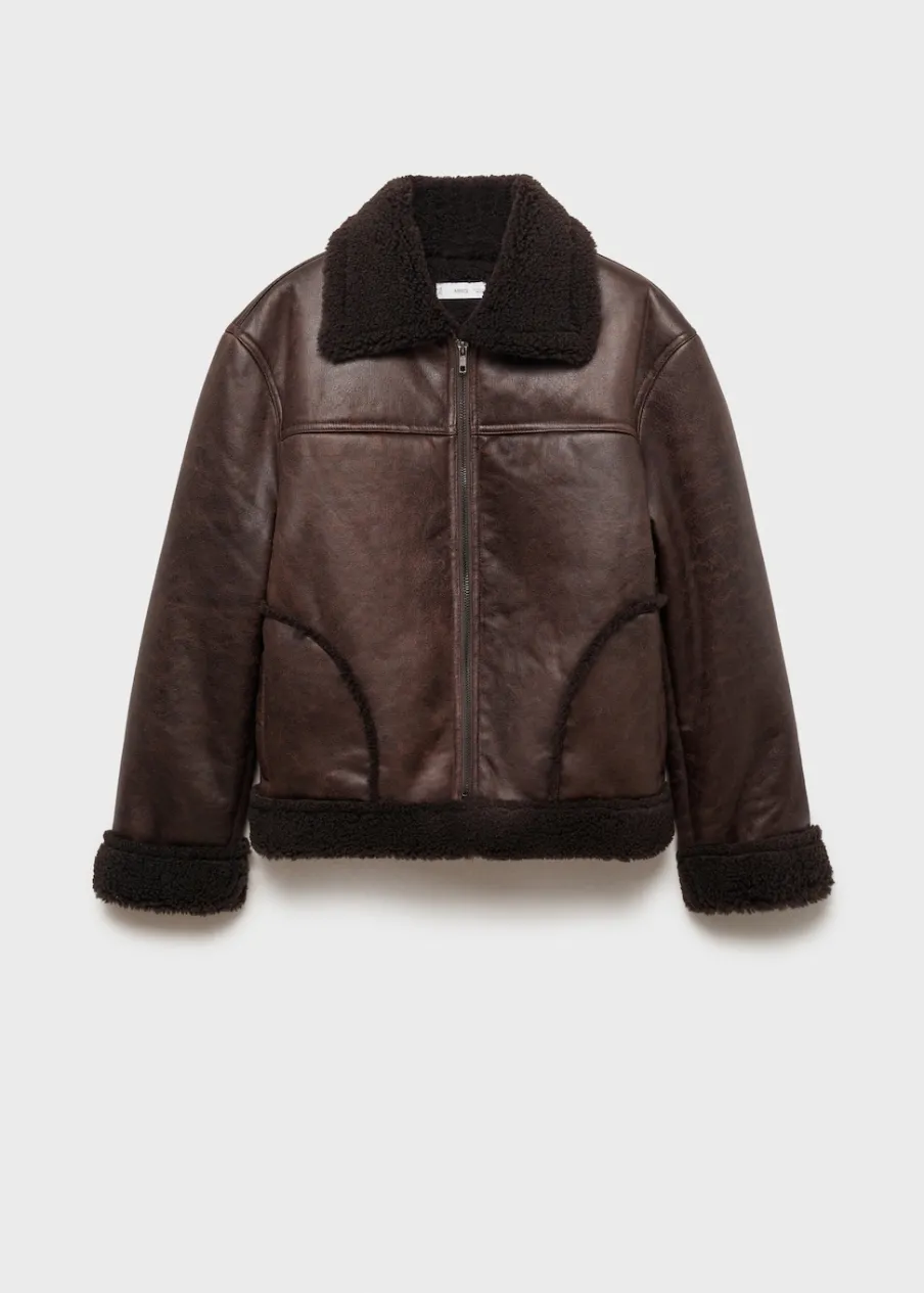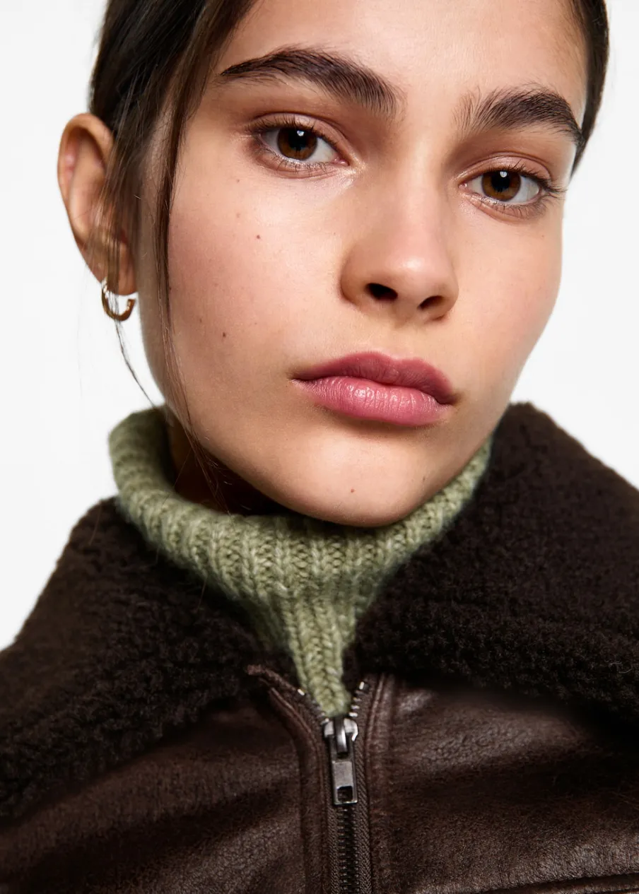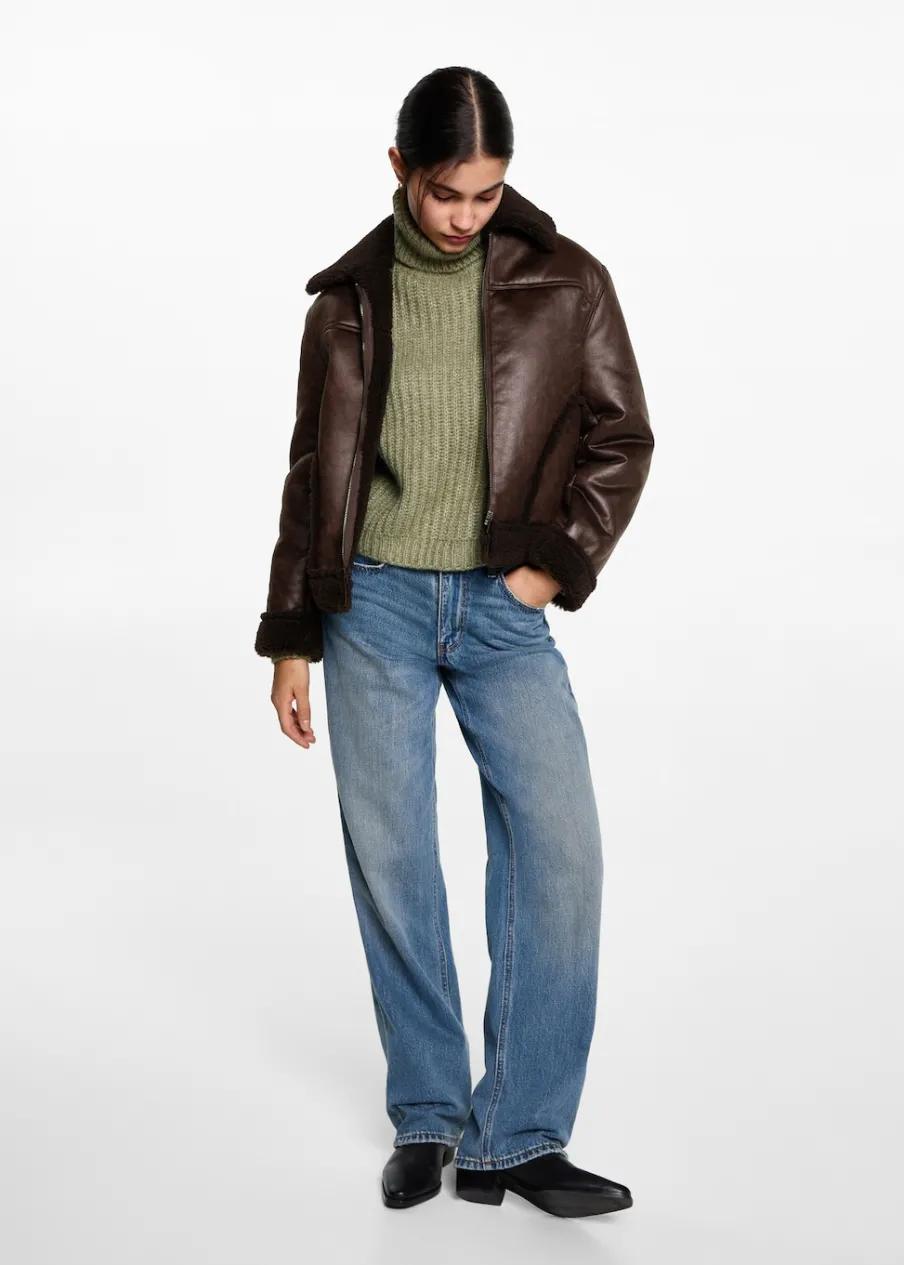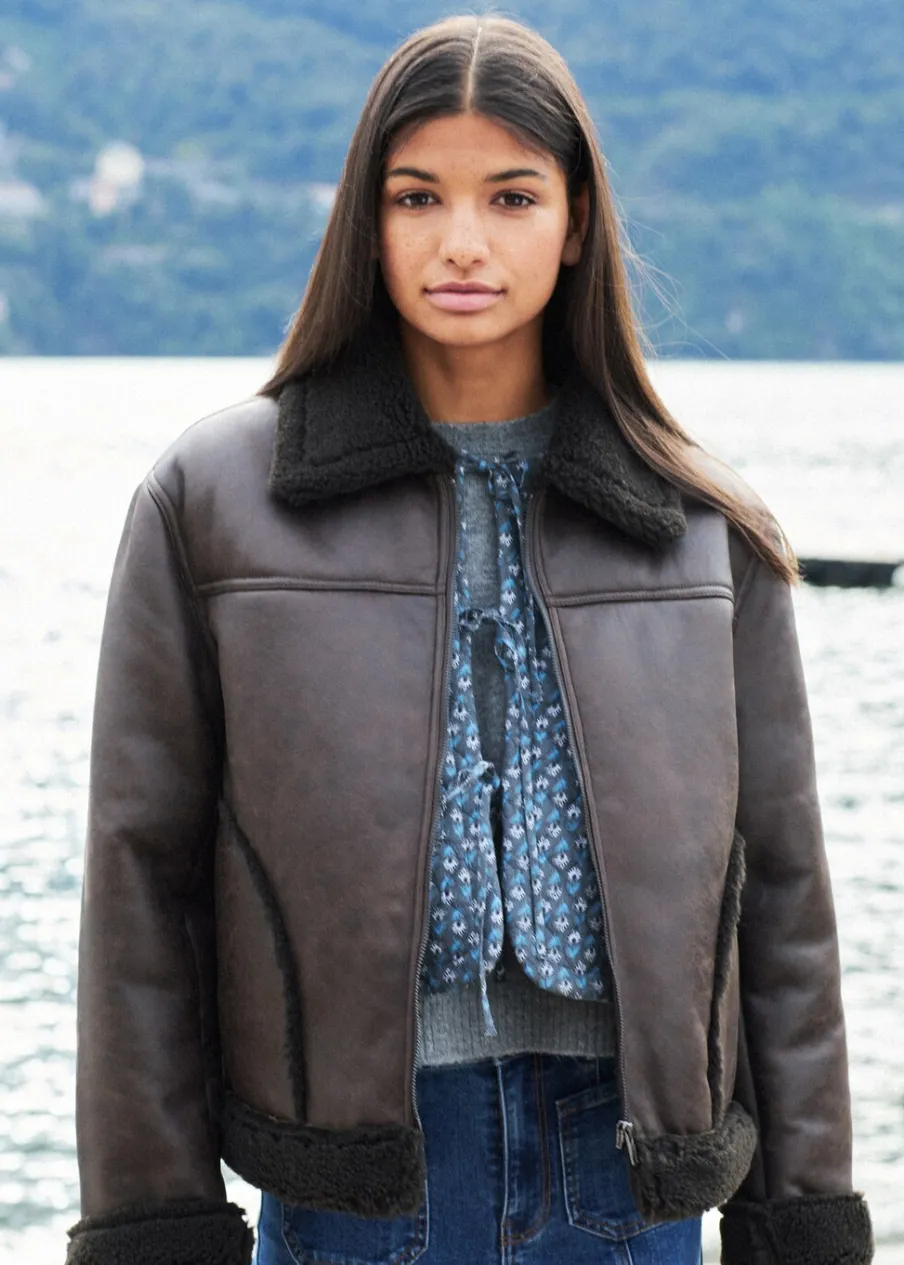 Efekt skóry. Model prosty. Koszulowy kołnierz. Futrzana podszewka z baranka. Długi rękaw. Dwie kieszenie boczne. Zapięcie na suwak. Modelka ma 172 cm wzrostu i nosi rozmiar M.