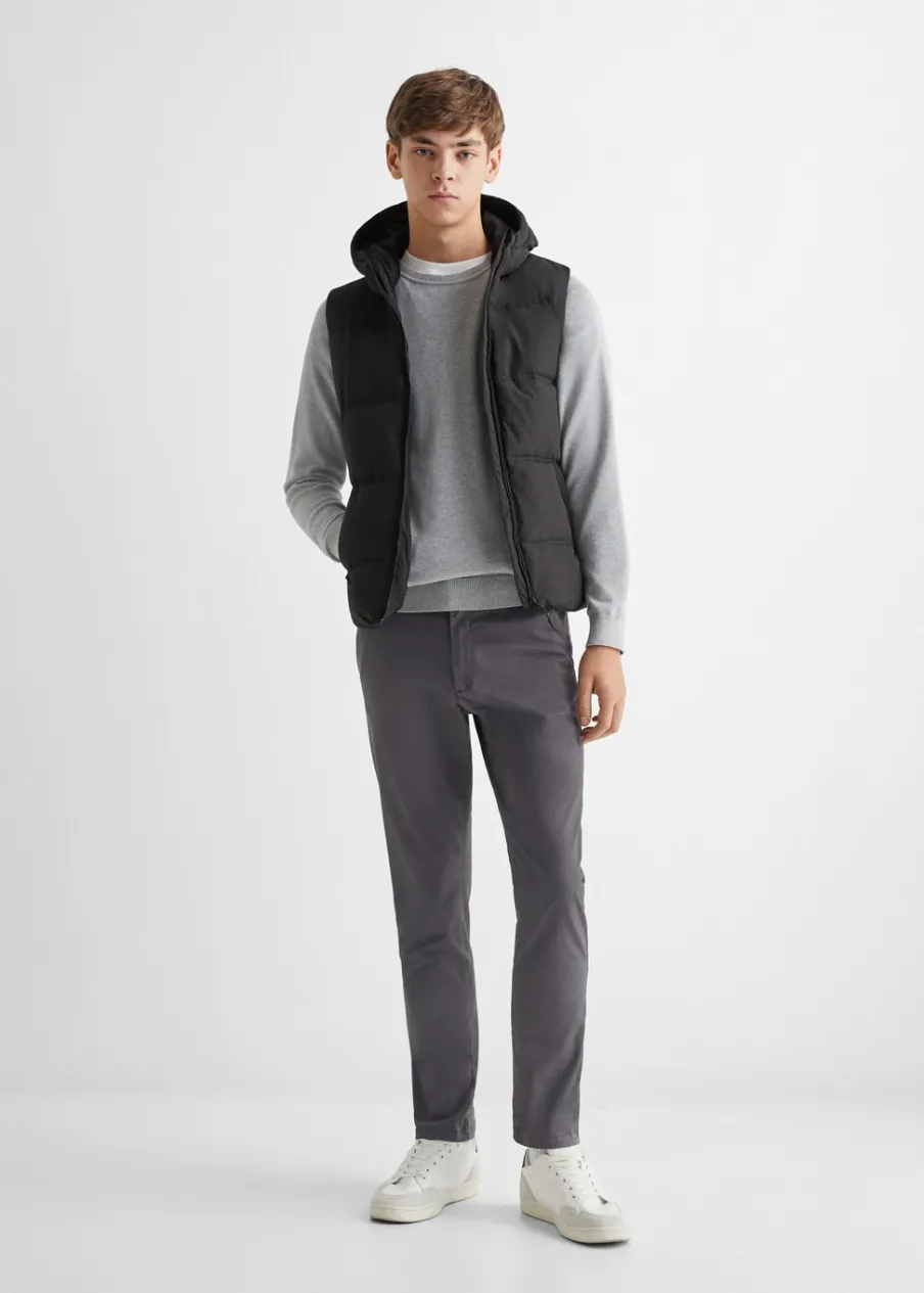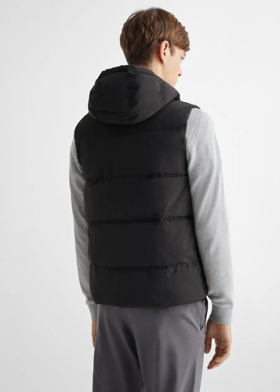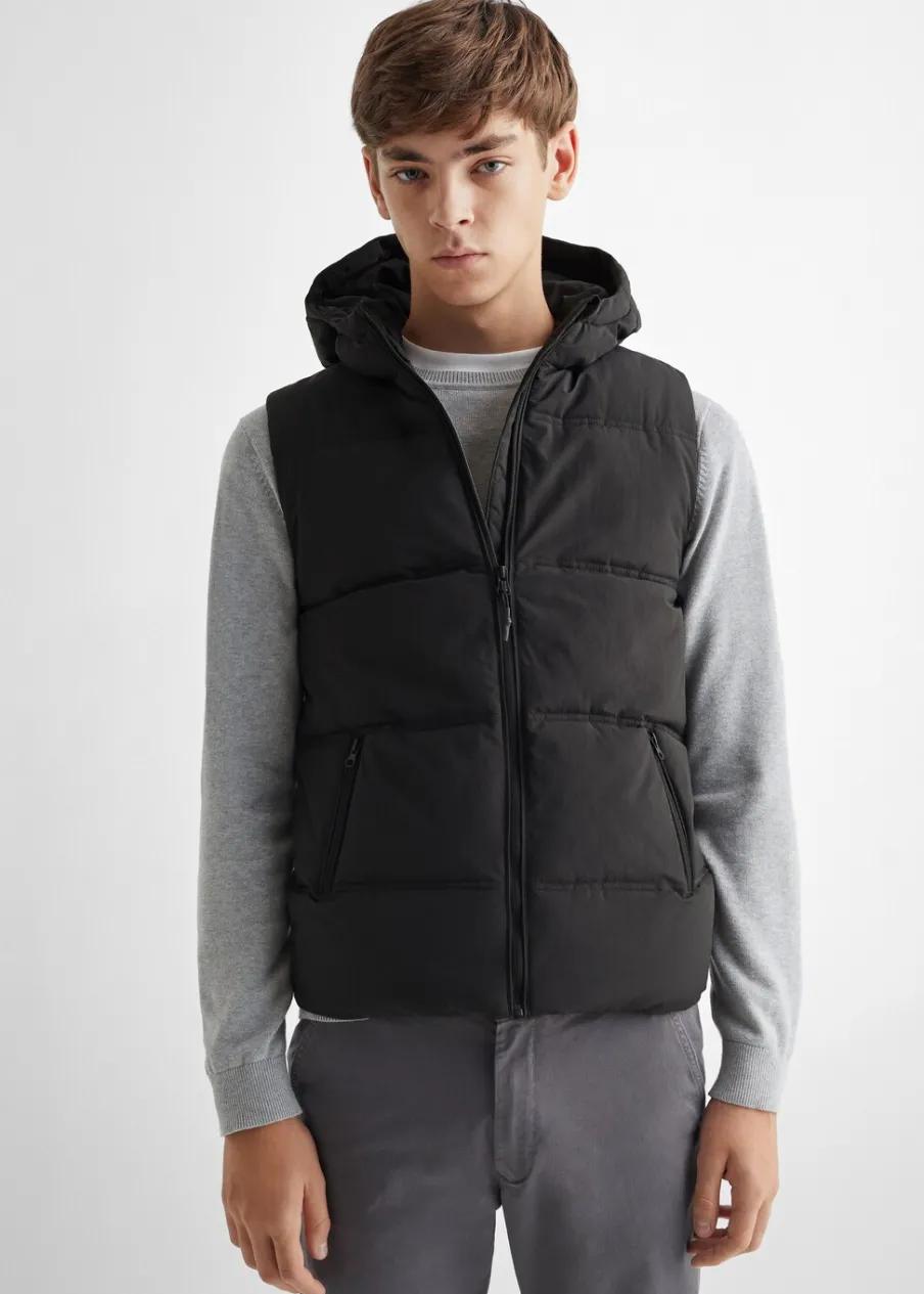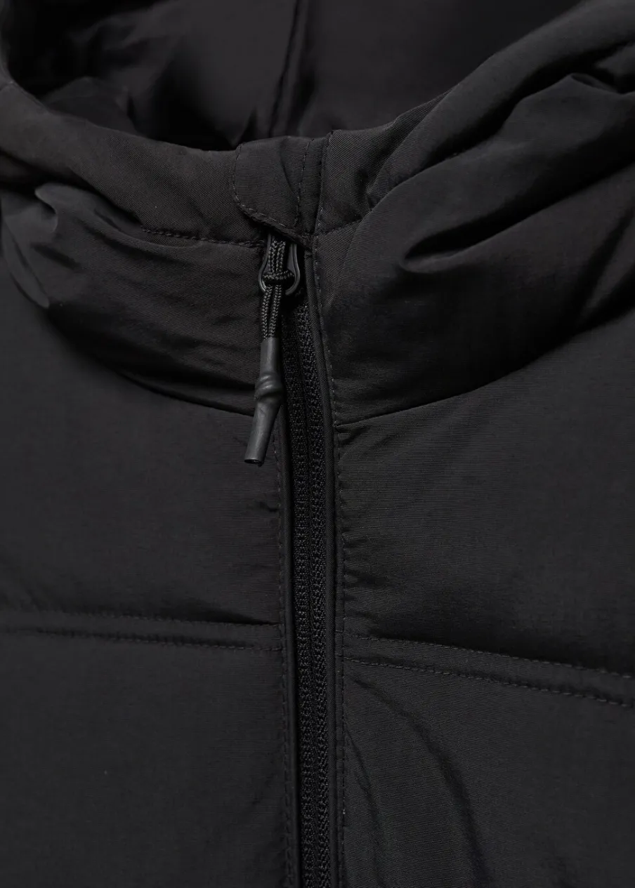 Model pikowany. Model długi. Model prosty. Z kapturem. Dwie kieszenie zapinane na suwak. Bez rękawów. Zapięcie na suwak.