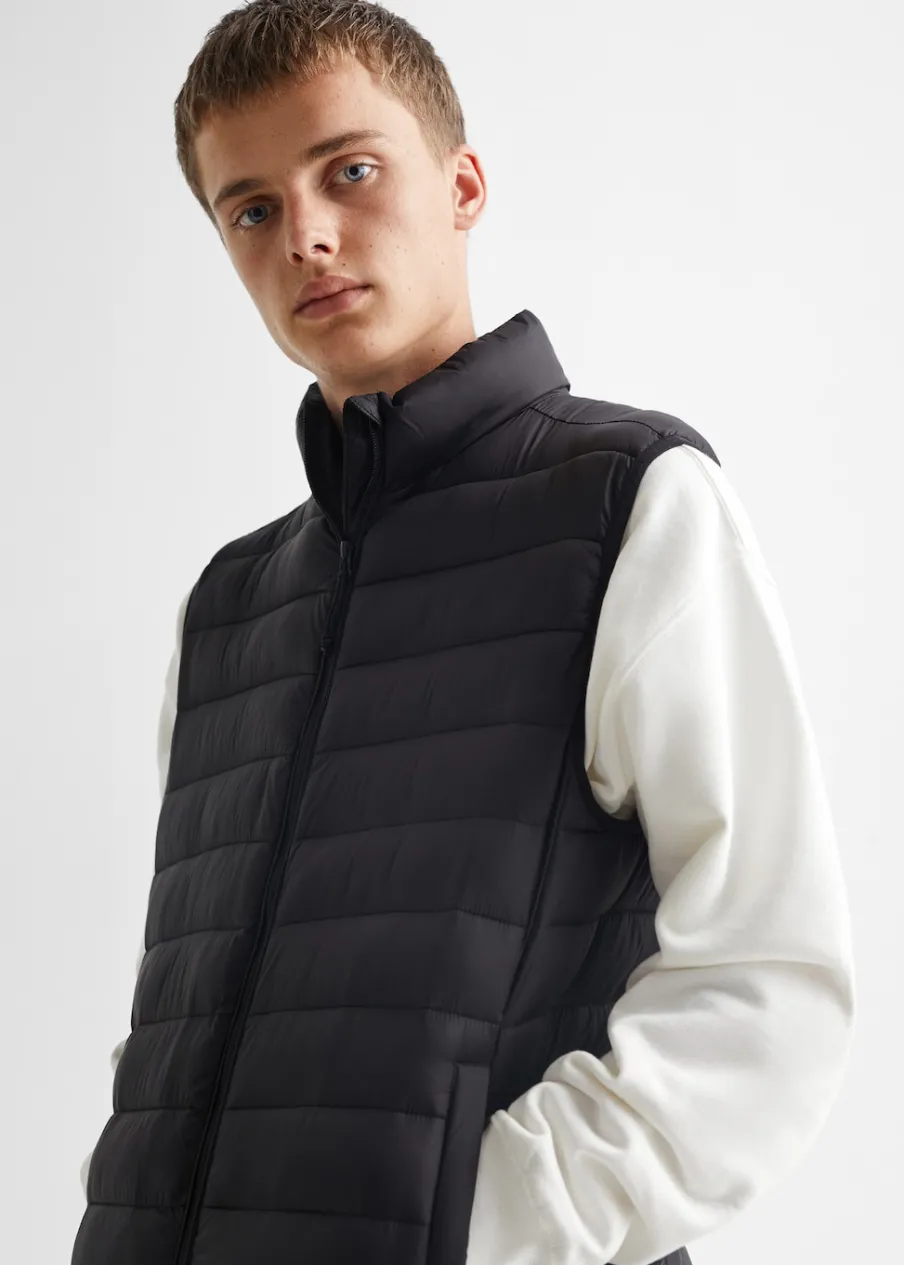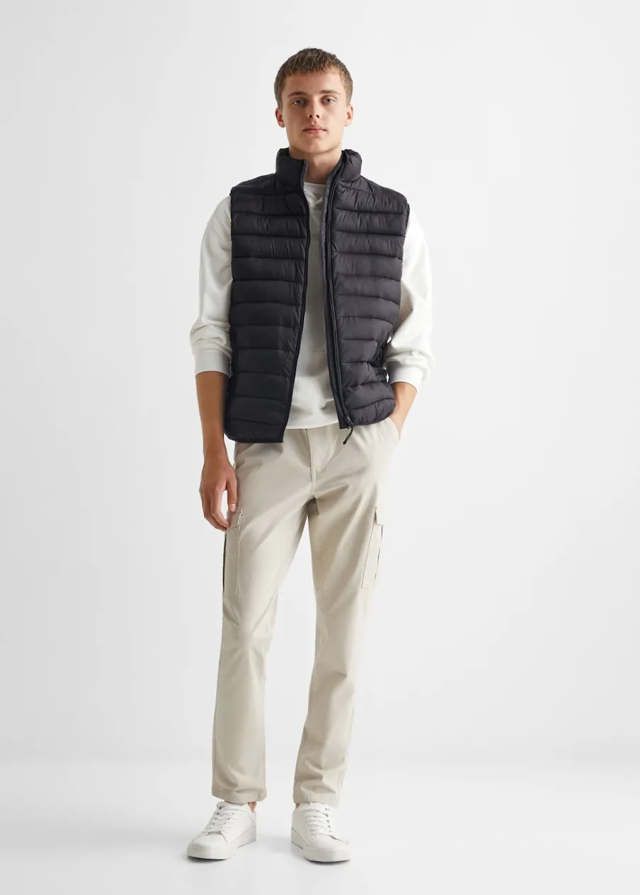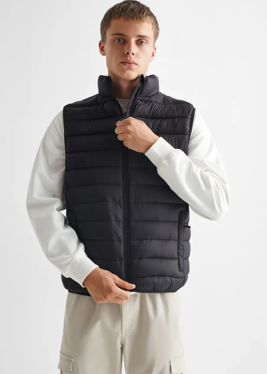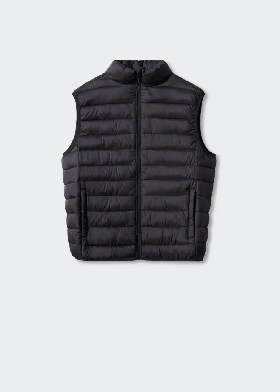 Model pikowany. Zapięcie z przodu. Model prosty. Model standardowy. Dwie kieszenie boczne z patką. Zapięcie na suwak. Dwie kieszenie z patką. Cienka tkanina. Okrągły dekolt. Bez rękawów.