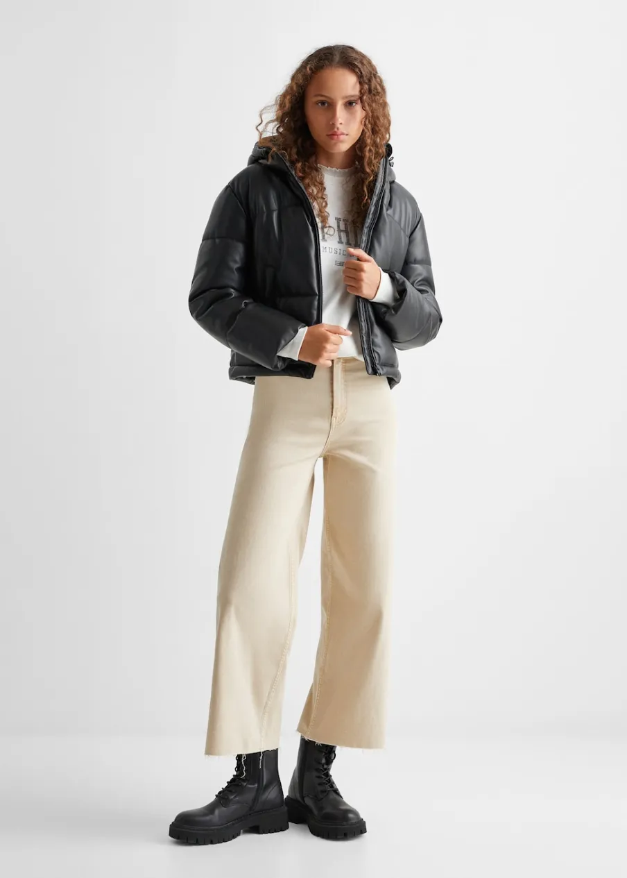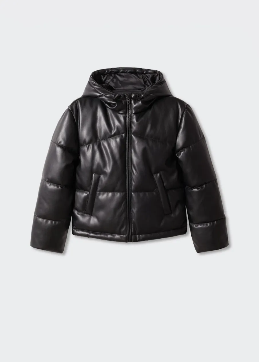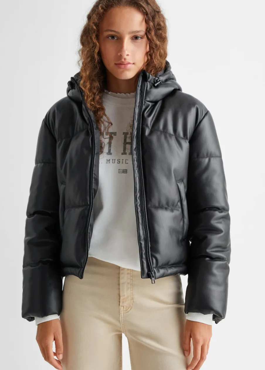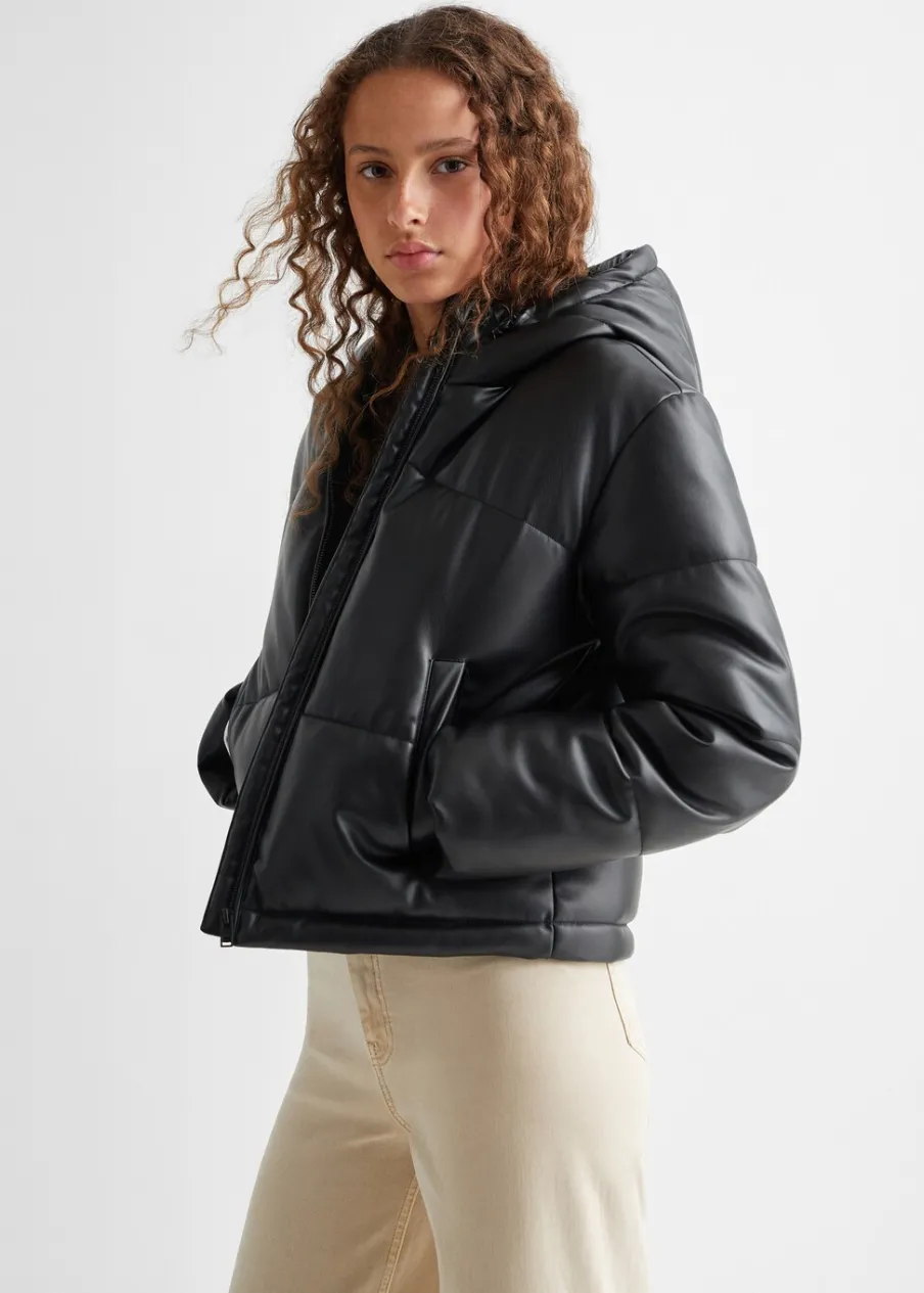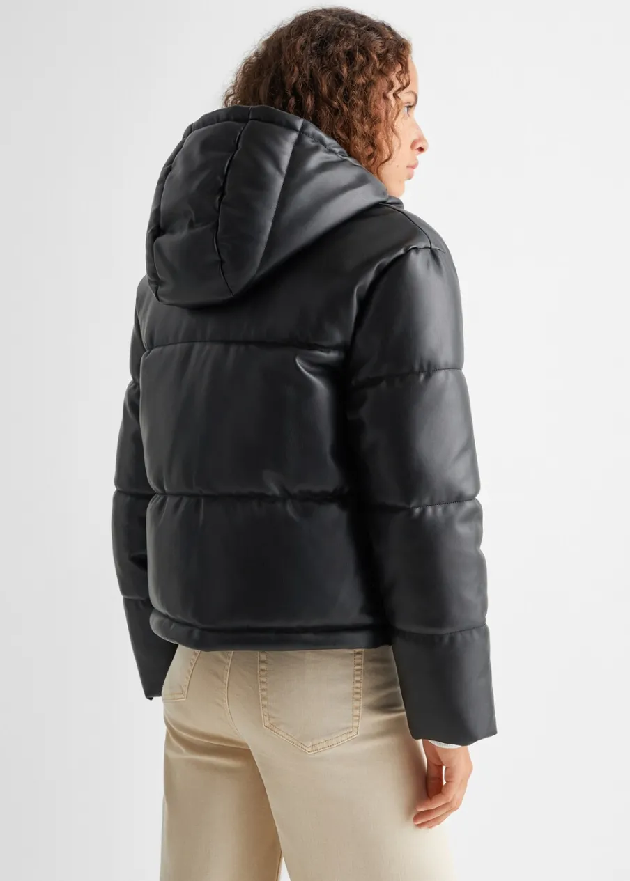 Efekt skóry, model pikowany, krótki krój, prosty krój, kaptur, zapięcie na suwak, zapięcie z przodu, długi rękaw, modelka ma 172 cm wzrostu i nosi rozmiar M.