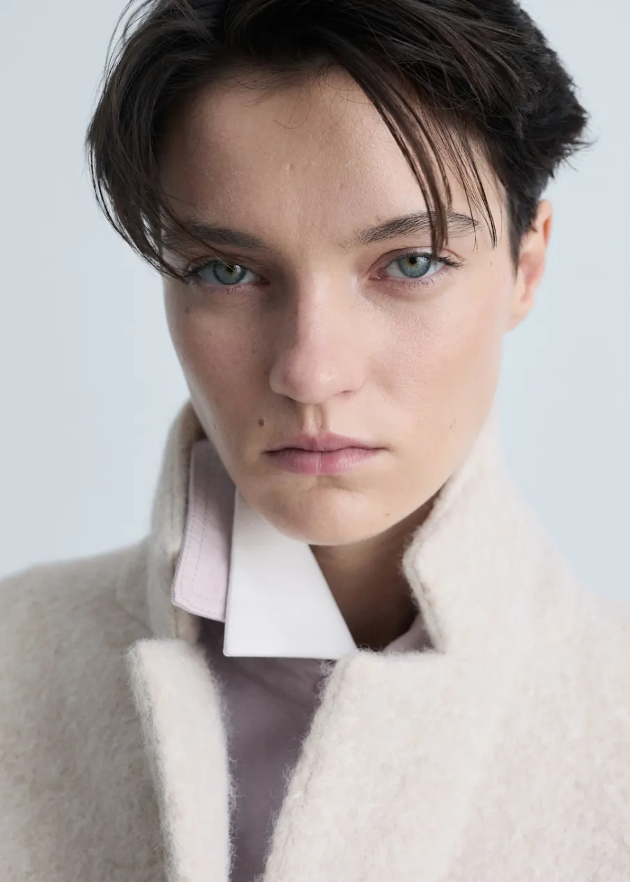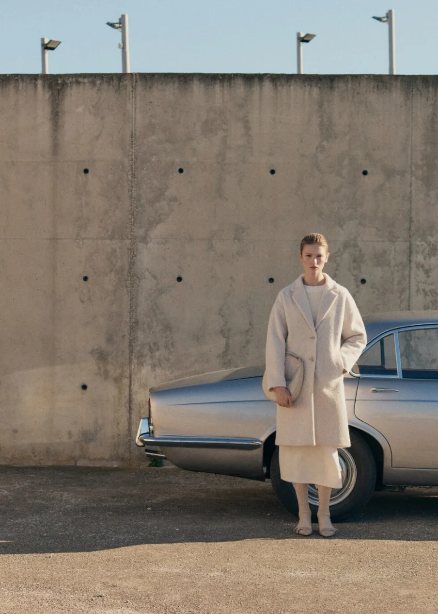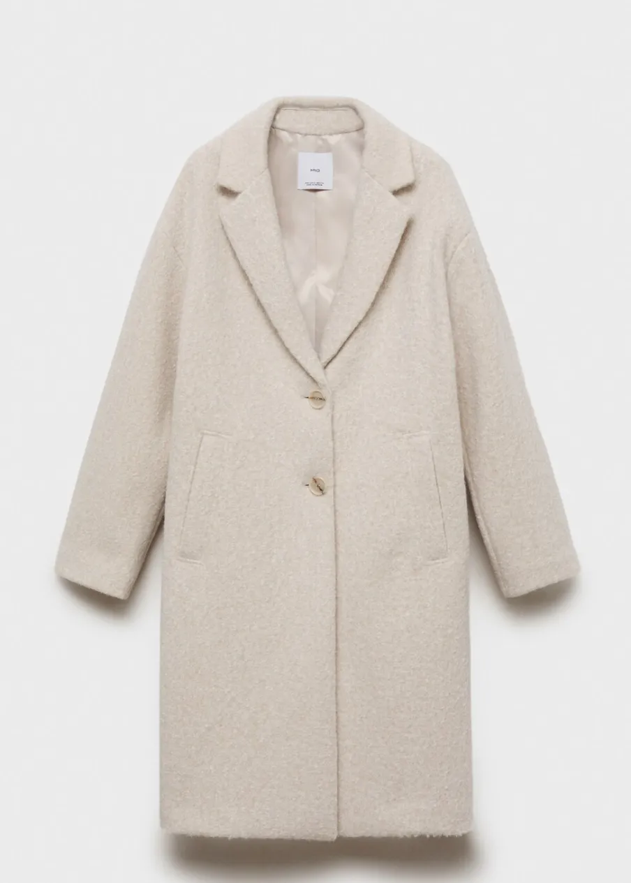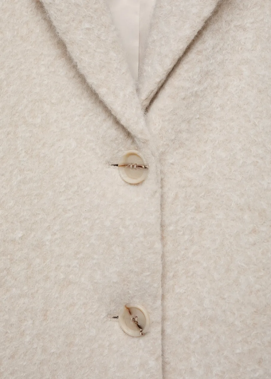 Tkanina bouclé. Model oversize. Model długi. Dekolt w szpic z kołnierzykiem. Długi rękaw. Klapy z nacięciem. Zapięcie na guziki z przodu. Wewnętrzna podszewka.