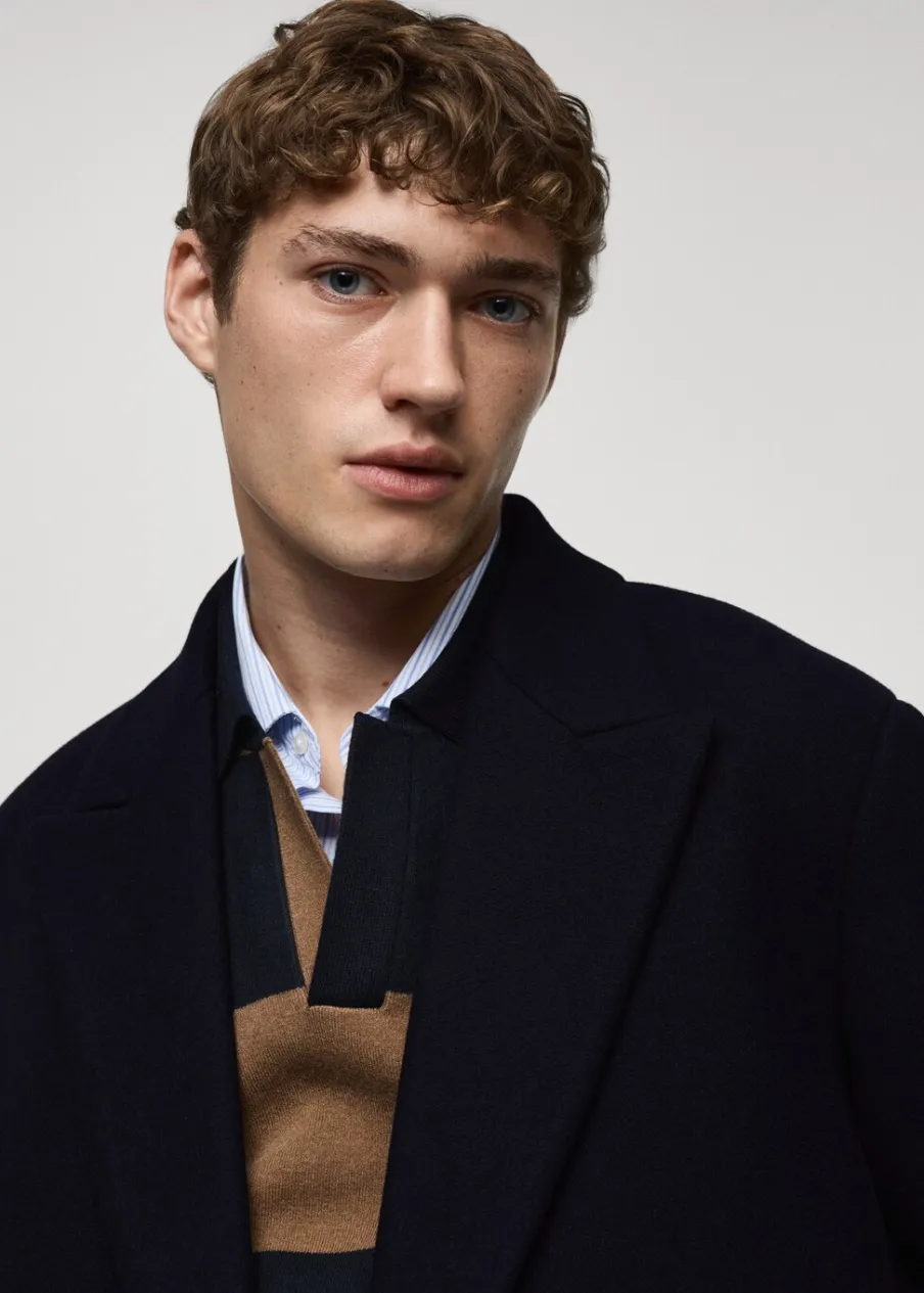 Relaxed fit. Tkanina mieszanka wełny. Model długi. Dwurzędowe zapięcie. Wewnętrzna podszewka. Zapinane mankiety. Klapy otwarte. Model ma 185 cm wzrostu i nosi rozmiar M.