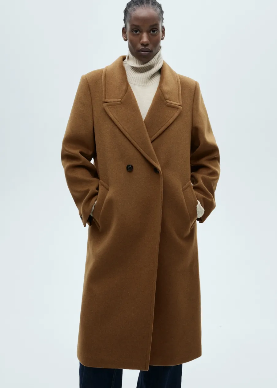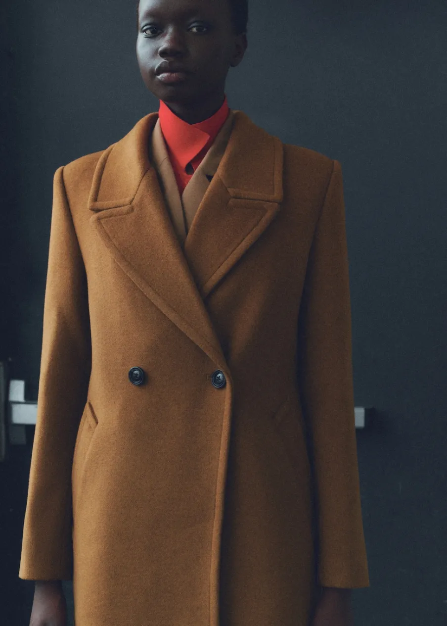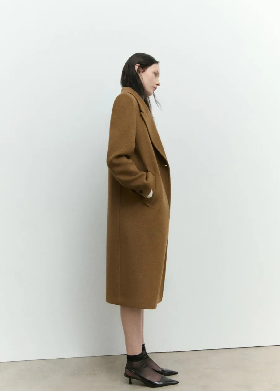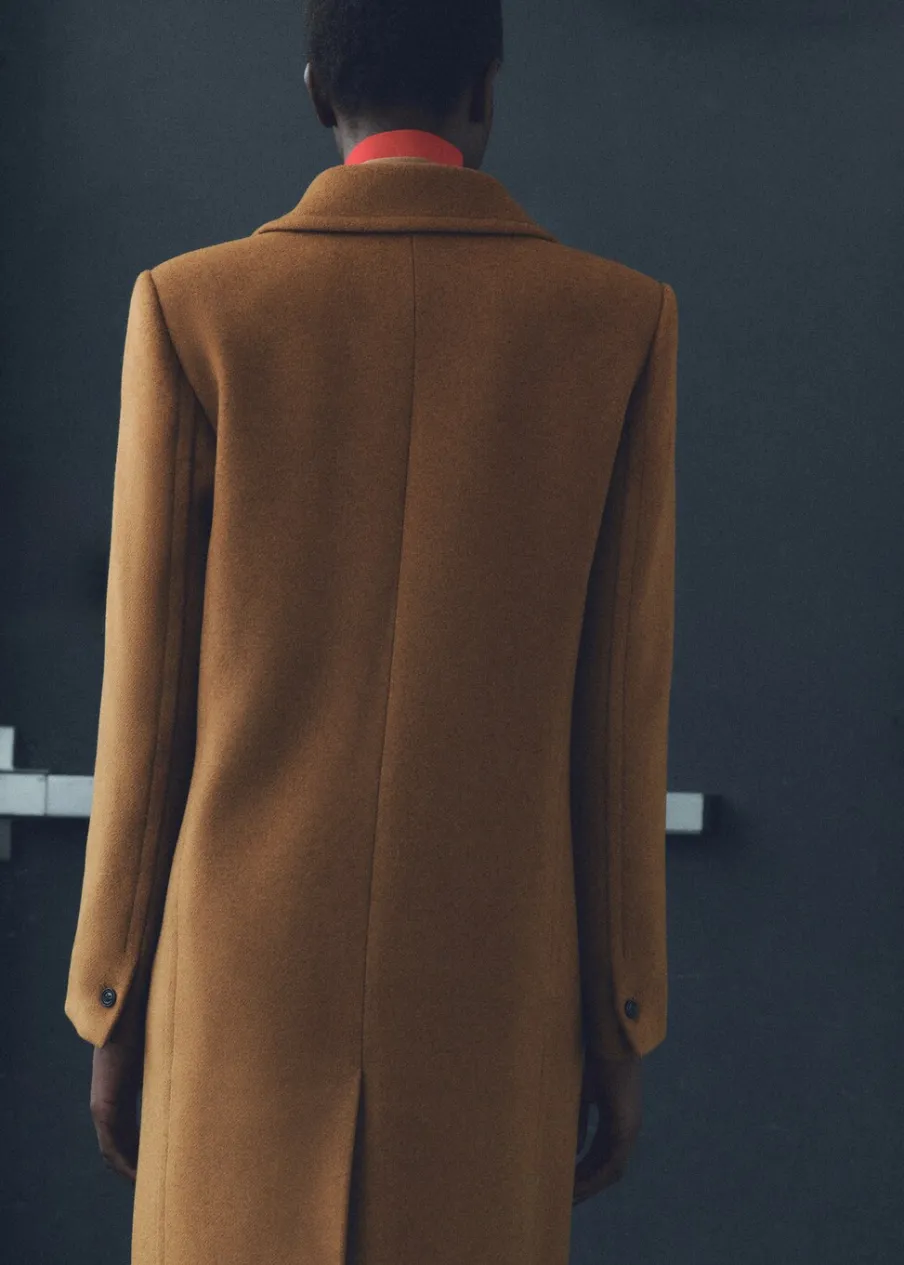 Tkanina mieszanka wełny. Ciężka struktura. Model prosty. Model długi. Nacięte klapy. Dekolt w szpic z kołnierzykiem. Klapy z nacięciem. Długi rękaw. Dwie wpuszczane kieszenie boczne. Dwurzędowe zapięcie. Tylko podszewka.
