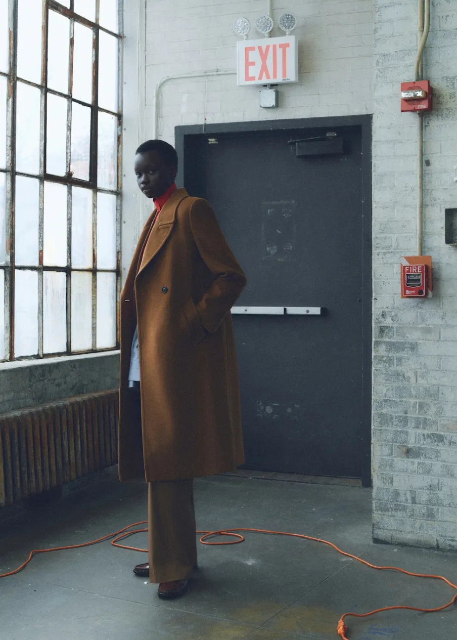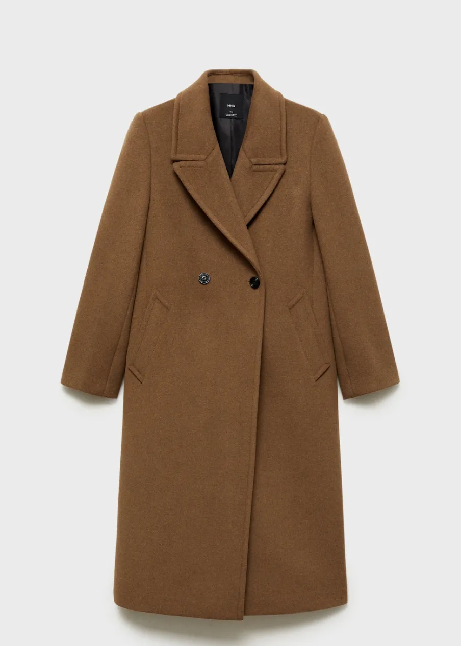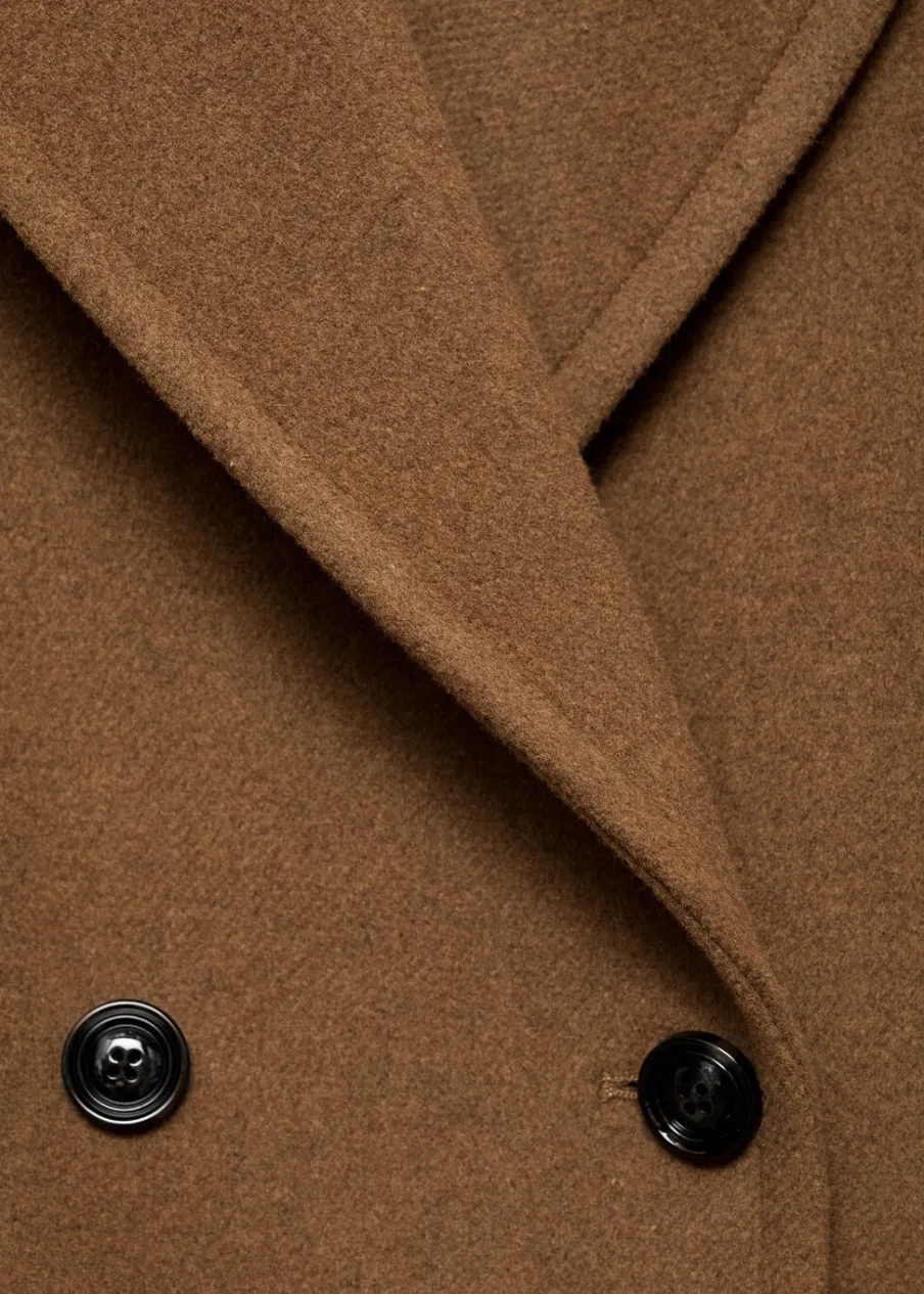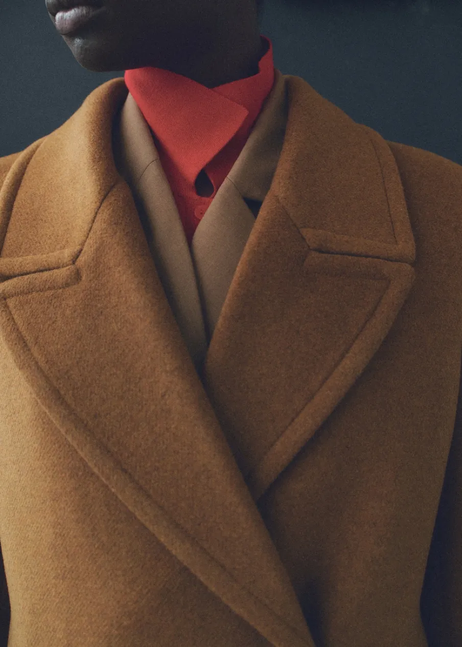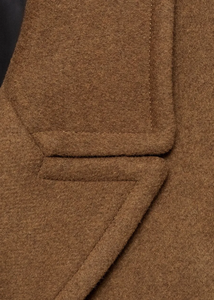 Tkanina mieszanka wełny. Ciężka struktura. Model prosty. Model długi. Nacięte klapy. Dekolt w szpic z kołnierzykiem. Klapy z nacięciem. Długi rękaw. Dwie wpuszczane kieszenie boczne. Dwurzędowe zapięcie. Tylko podszewka.