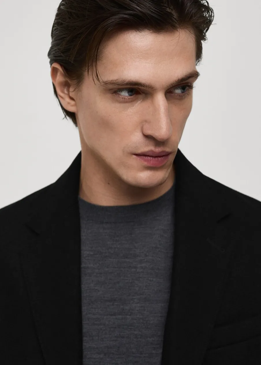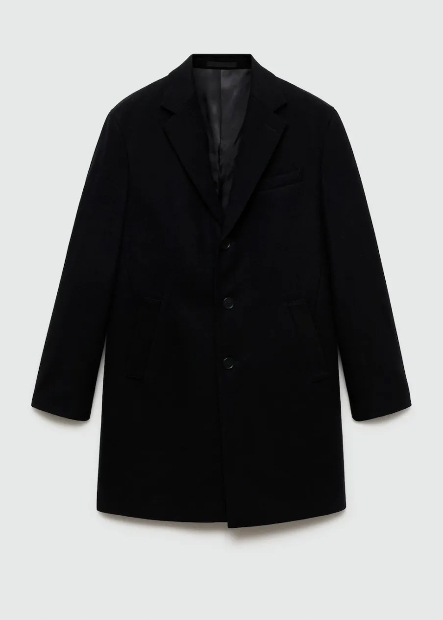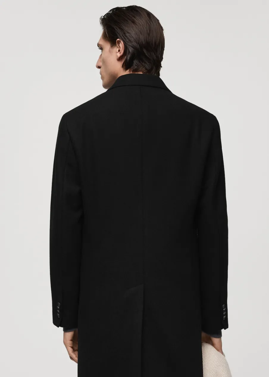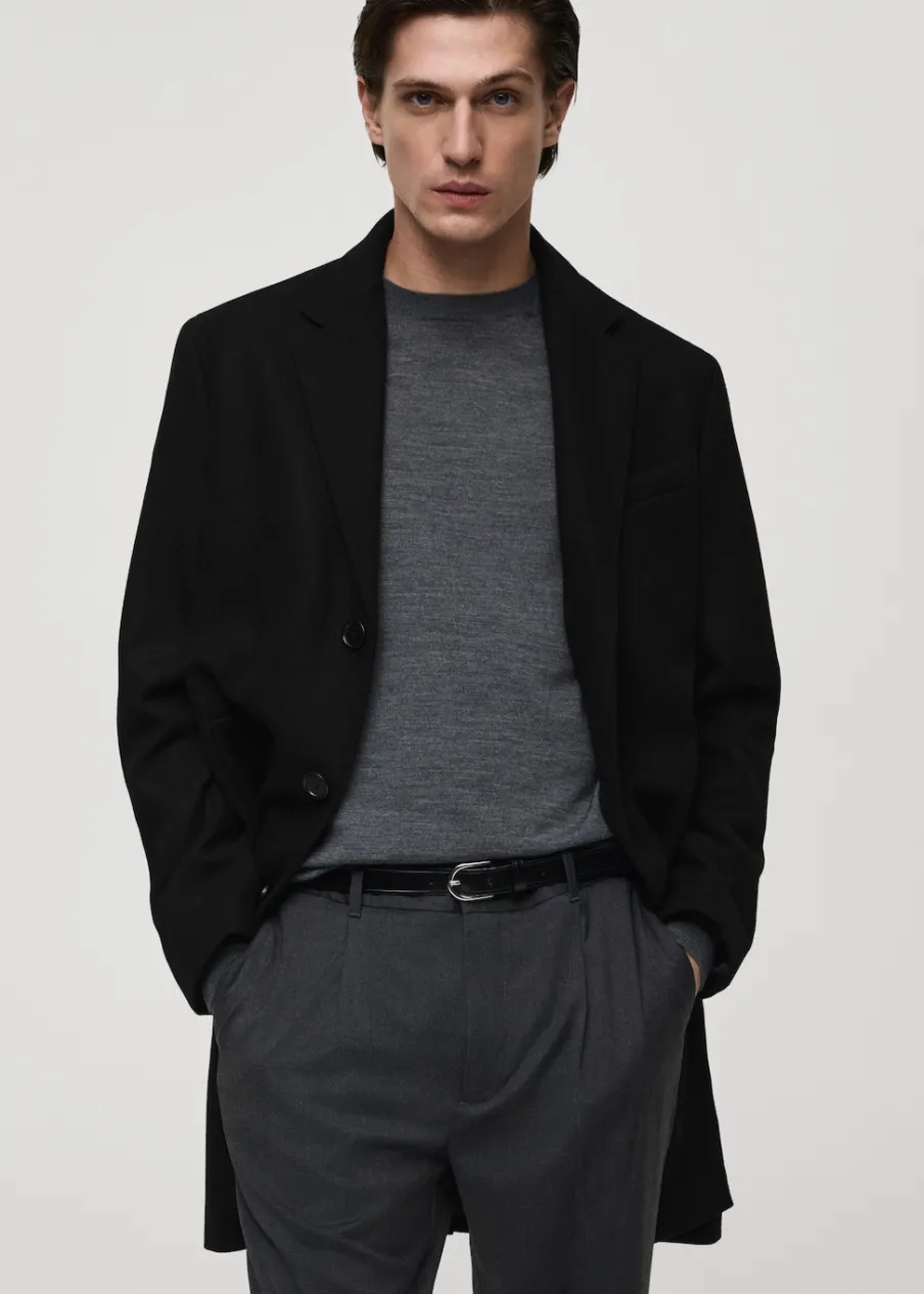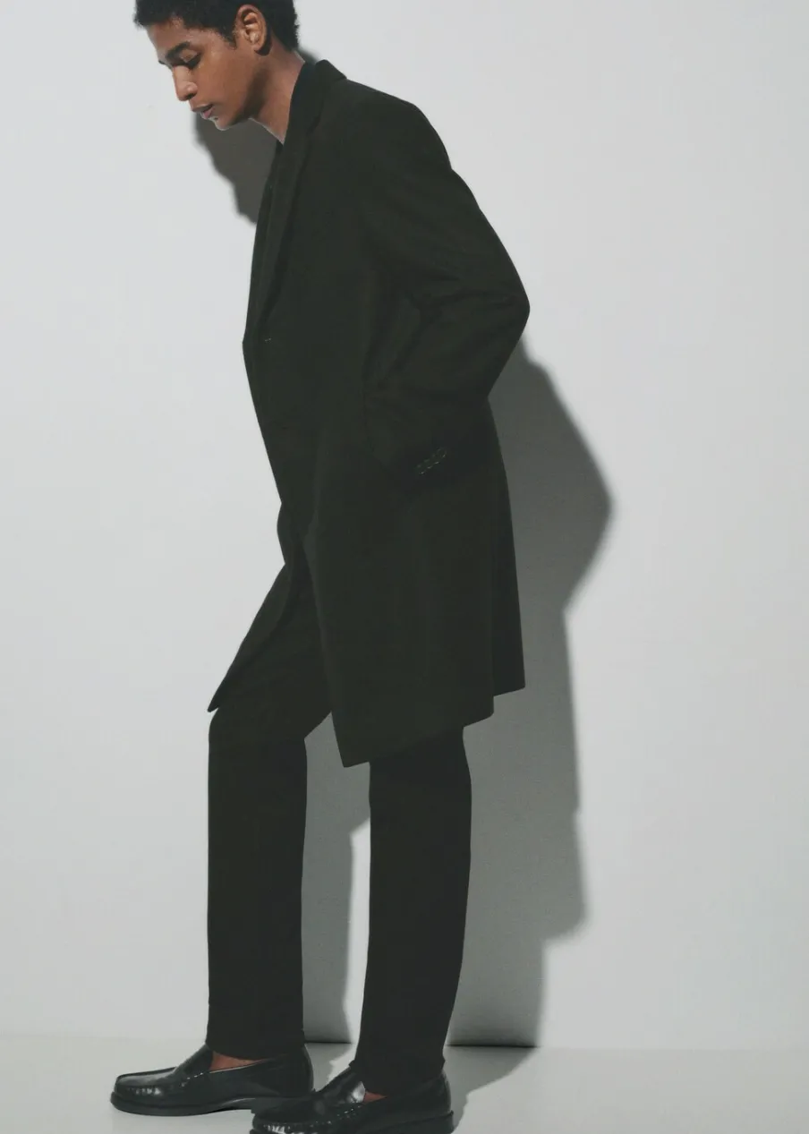 ESSENTIALS: Made to last. Tkanina mieszana z recyklowanej wełny. Slim-fit. Model długi. Klapy z nacięciem. Długi rękaw z guzikami na mankietach. Wewnętrzna podszewka. Dwie kieszenie wewnętrzne. Dwie wpuszczane kieszenie boczne. Kieszeń wpuszczana na piersi. Rozcięcie z tyłu u dołu. Model ma 187 cm wzrostu i nosi rozmiar M. Usztywniany kołnierz z klapami.