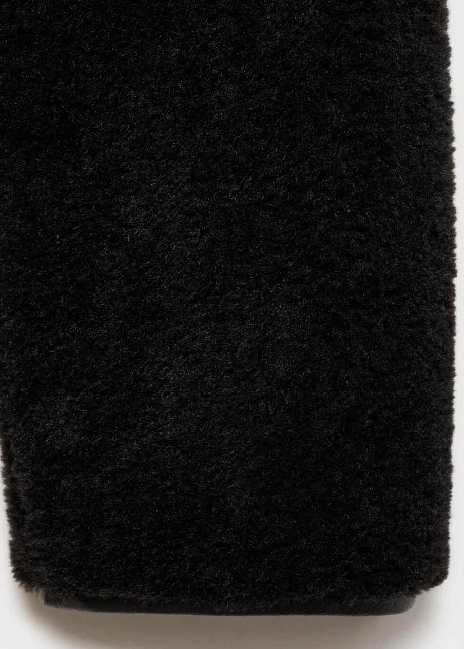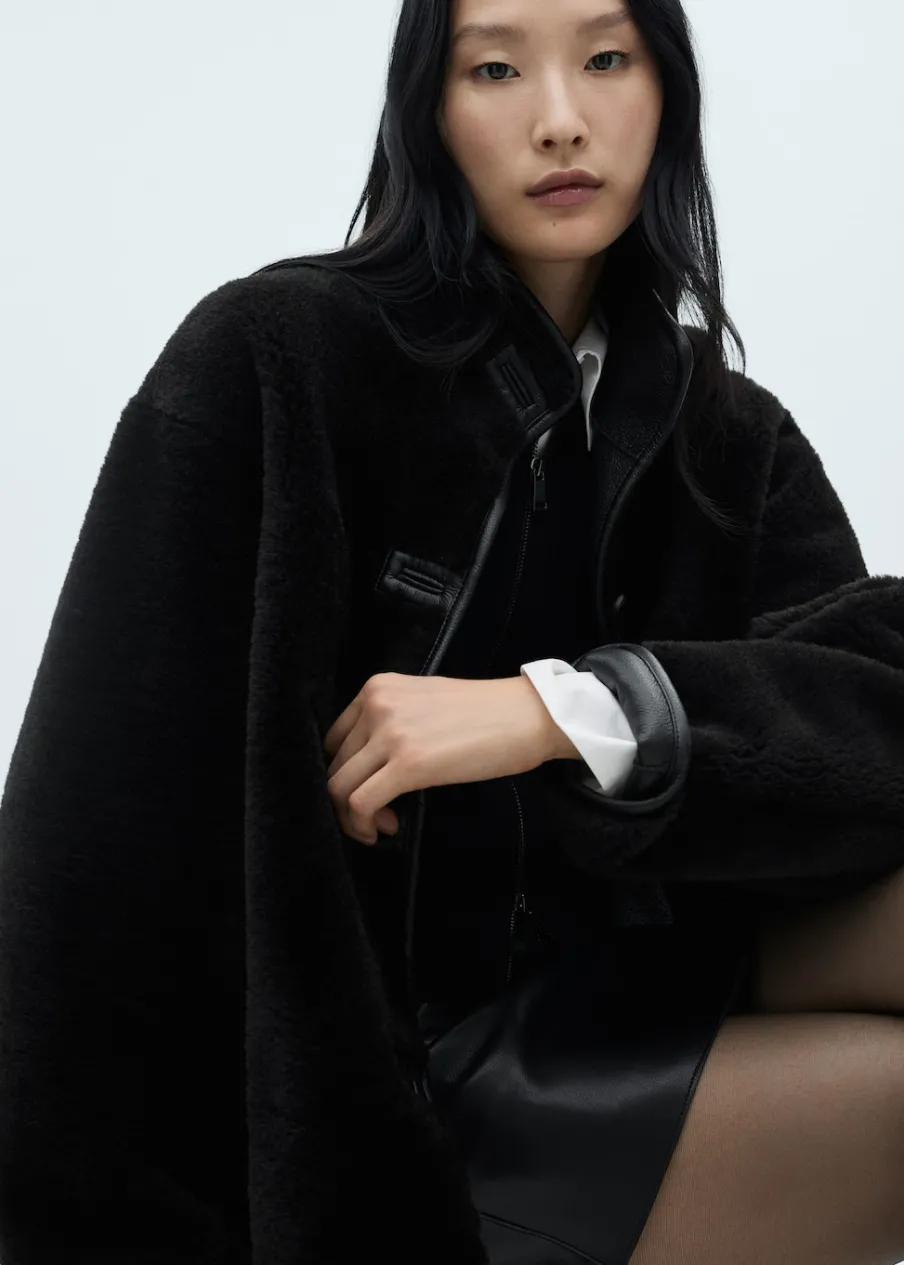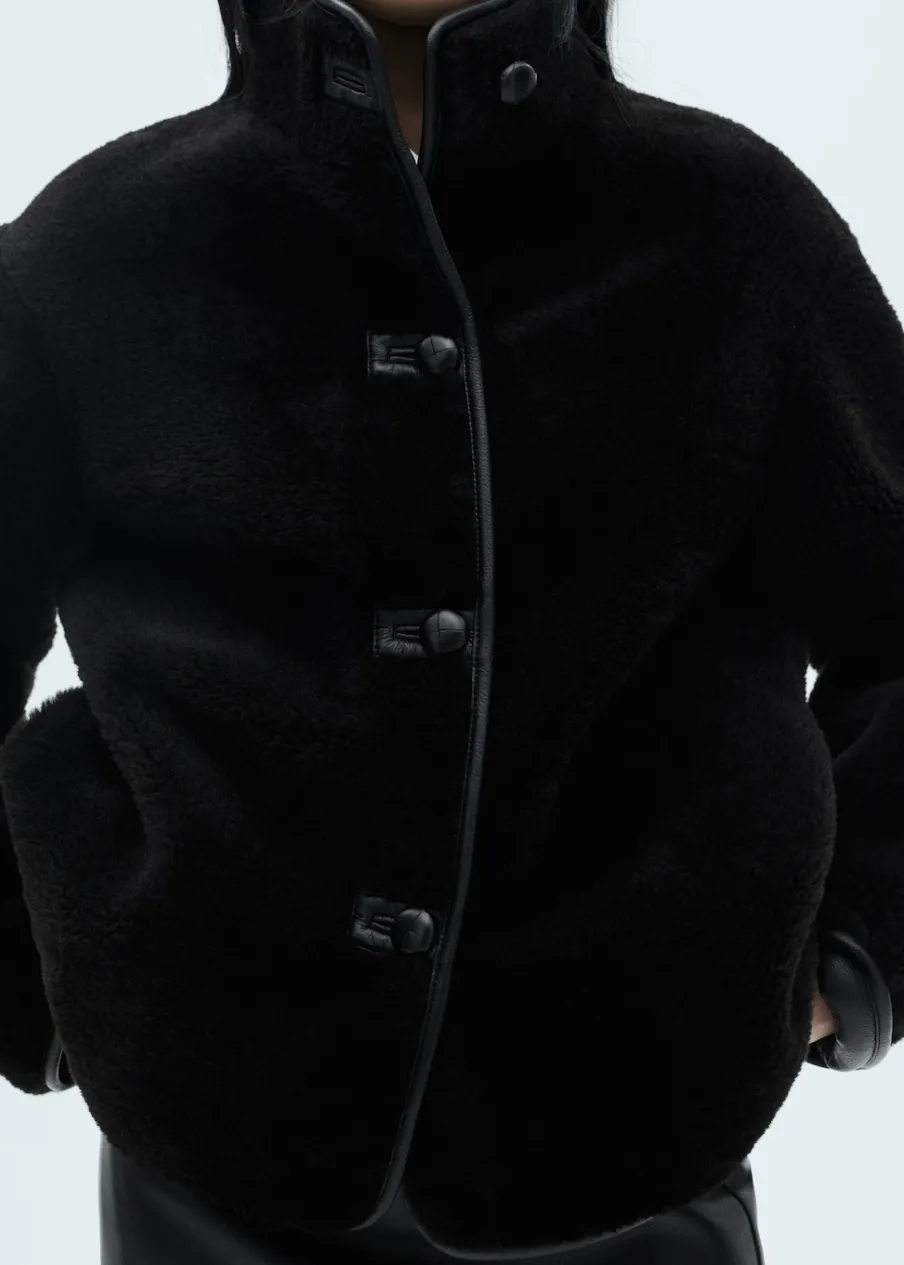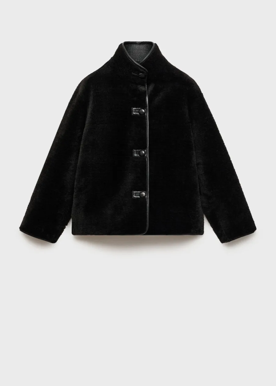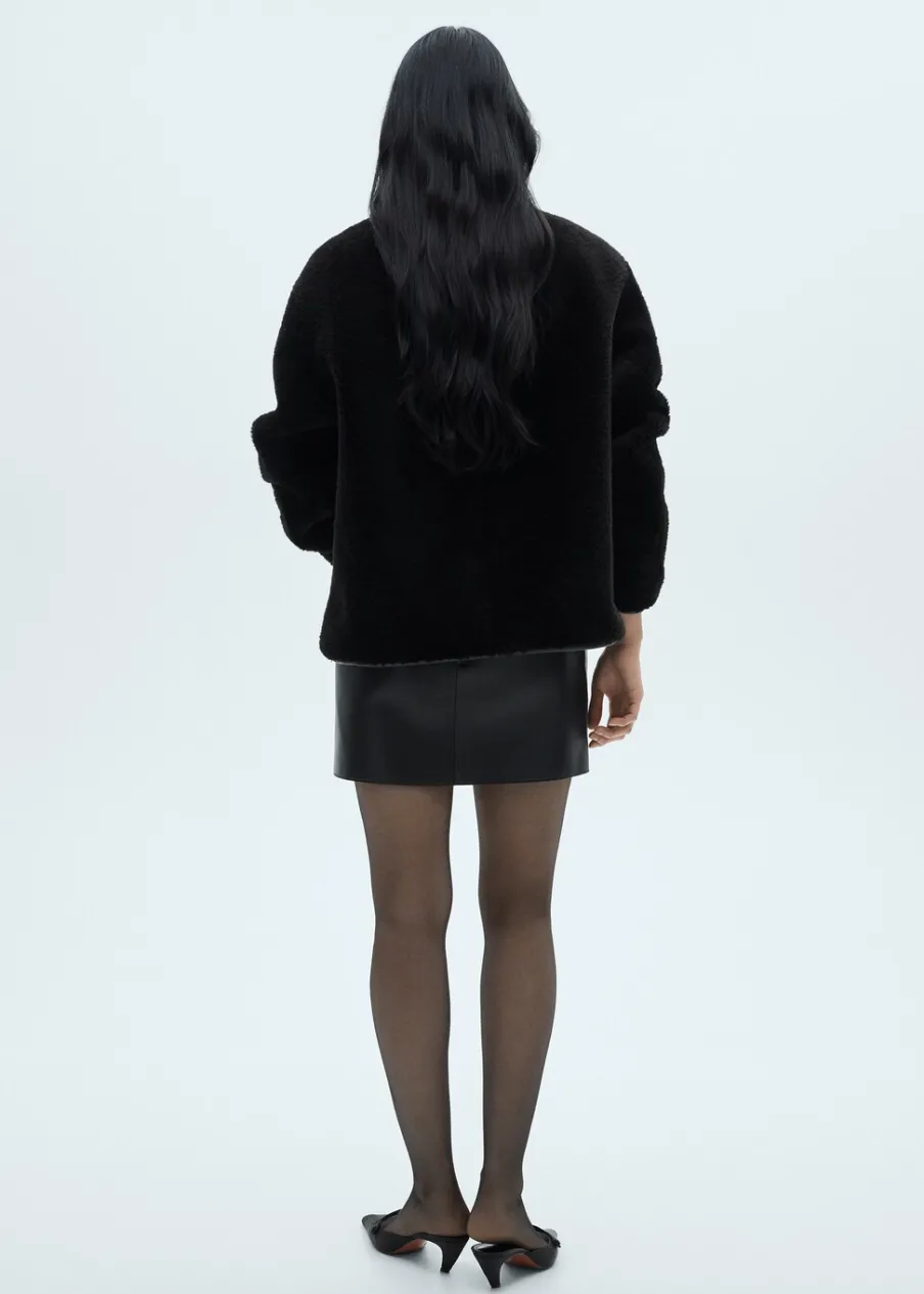 Szőrme, egyenes szabású modell, túlméretezett modell, magas gallér, hosszú ujj, két első zseb, gomb rögzítés, belső bélés.