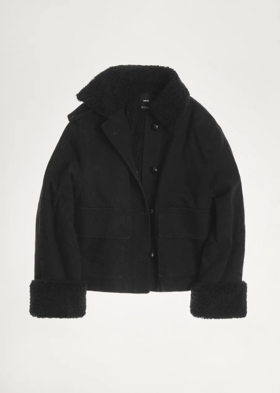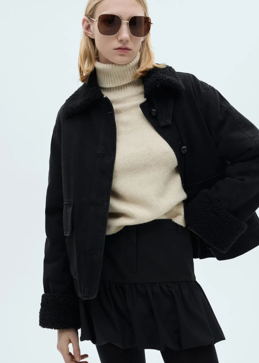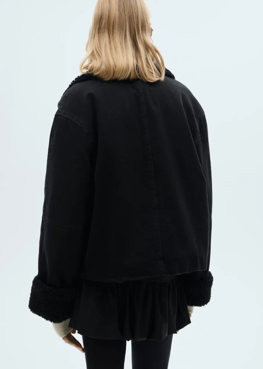 Tkanina bawełniana w dżinsowym stylu. Tkanina efekt owczej skóry. Model dwustronny. Model standardowy. Koszulowy kołnierz. Długi rękaw. Dwie kieszenie z klapą naszyte z przodu. Zapięcie z przodu na guziki. Wewnętrzna podszewka. Model prosty.