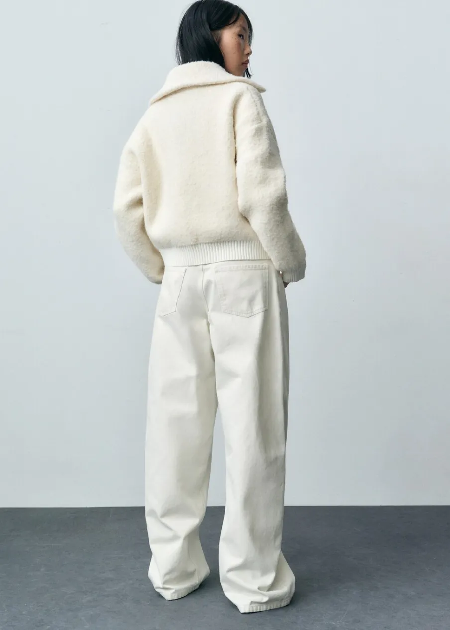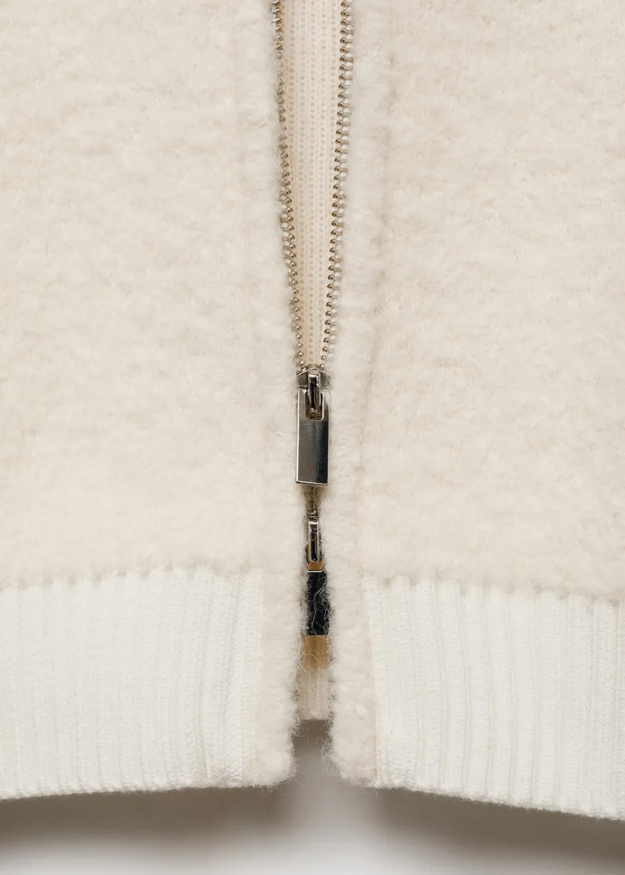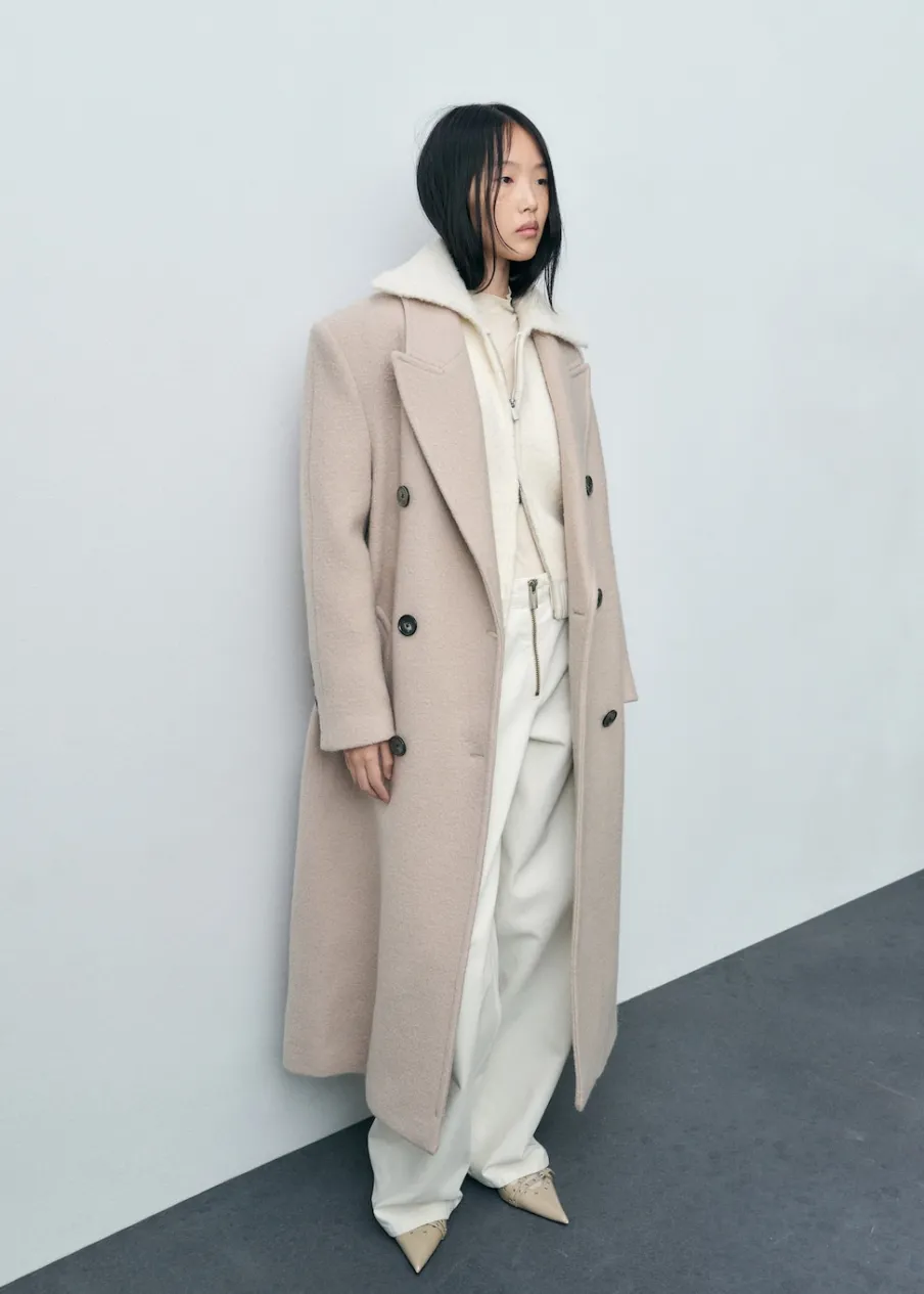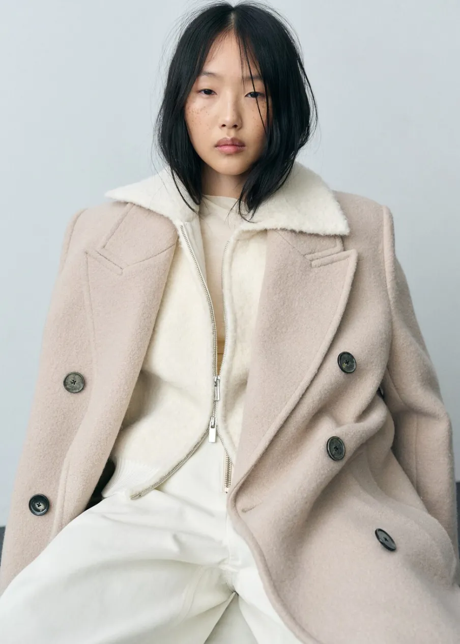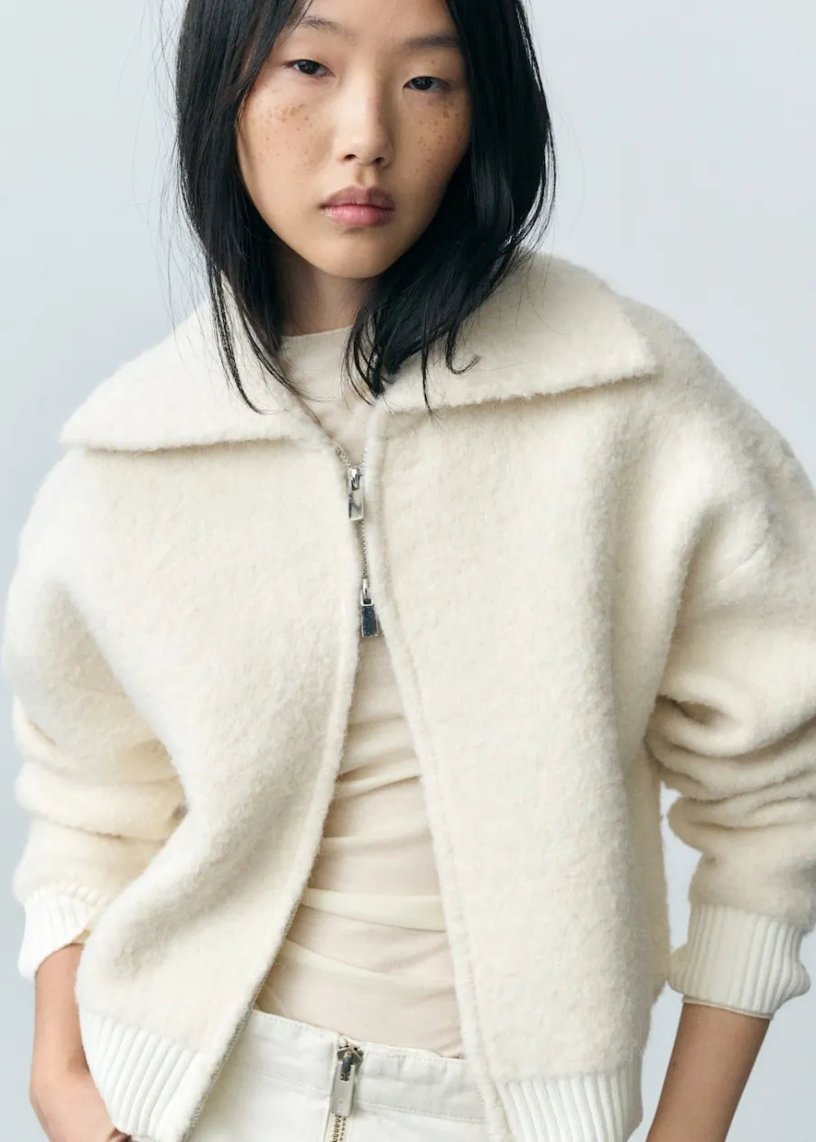 Tkanina mieszanka wełny. Tkanina bouclé. Tkanina z grubej dzianiny. Model oversize. Fason o średniej długości. Szeroki kołnierz z klapami. Długi rękaw z elastycznymi mankietami. Kontrastowe ściągaczowe wykończenia. Zapięcie na zamek z przodu.
