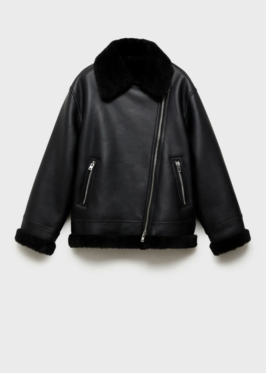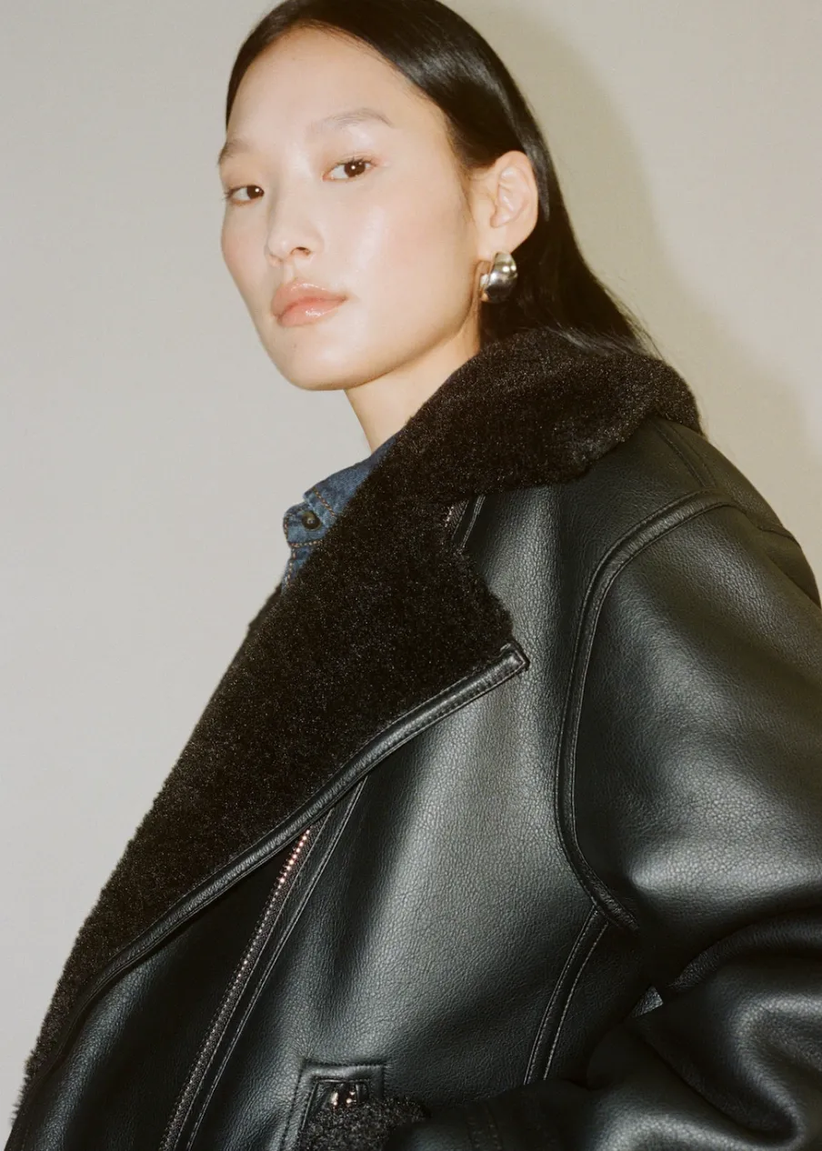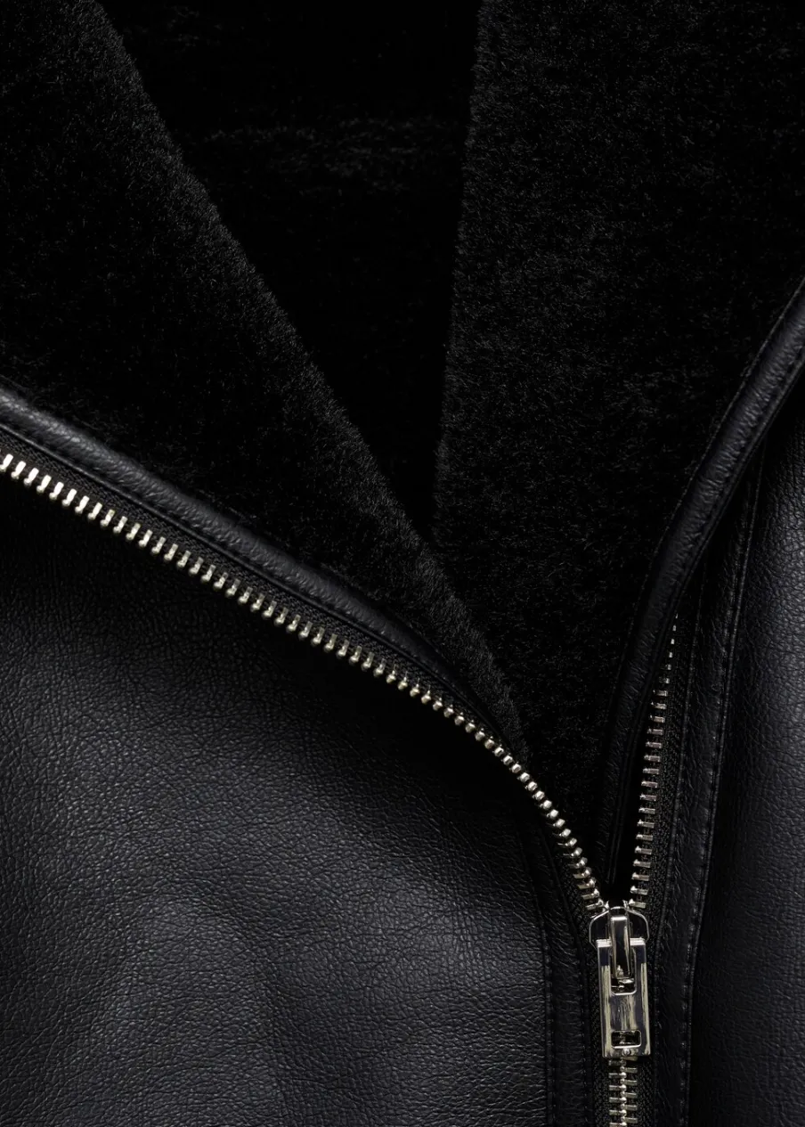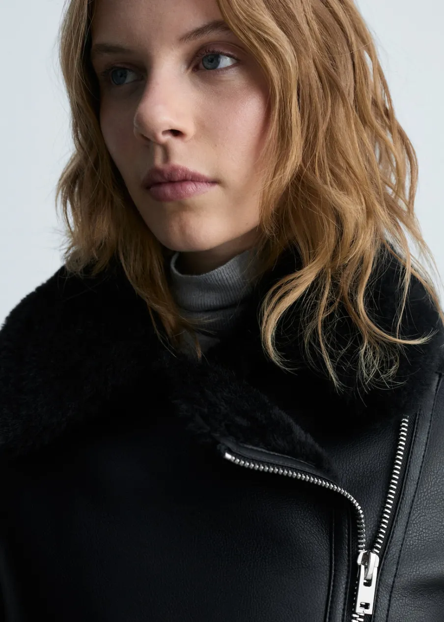 Efekt skóry. Ciężka struktura. Model dwustronny. Model biker. Model prosty. Kołnierz z klapami. Futrzany kołnierz. Długi rękaw. Zapięcie z przodu na suwak. Dwie kieszenie na zamek z boku. Futrzana podszewka z baranka. Wykończenia z baranka.