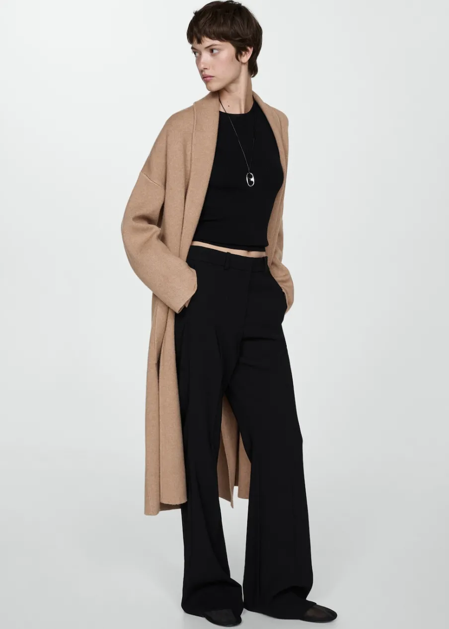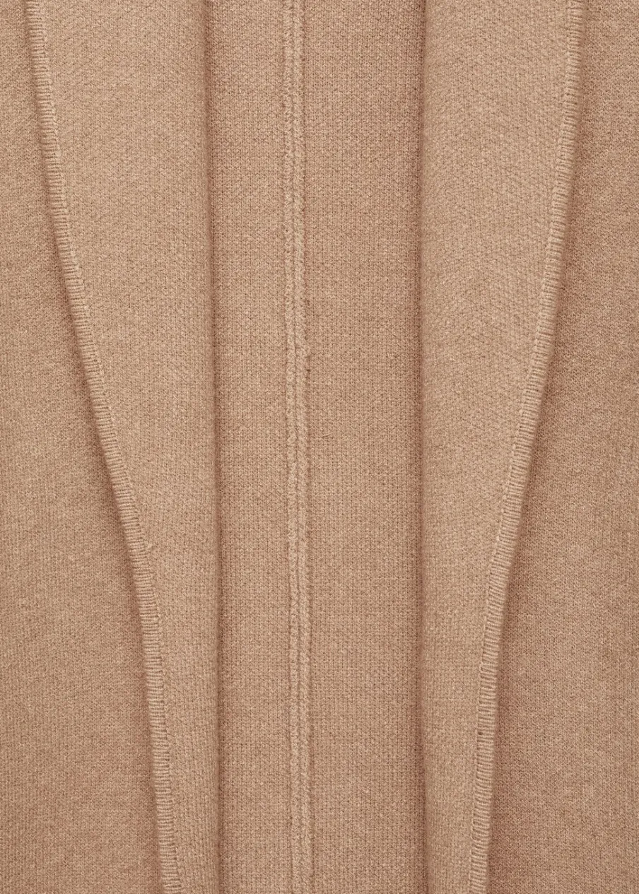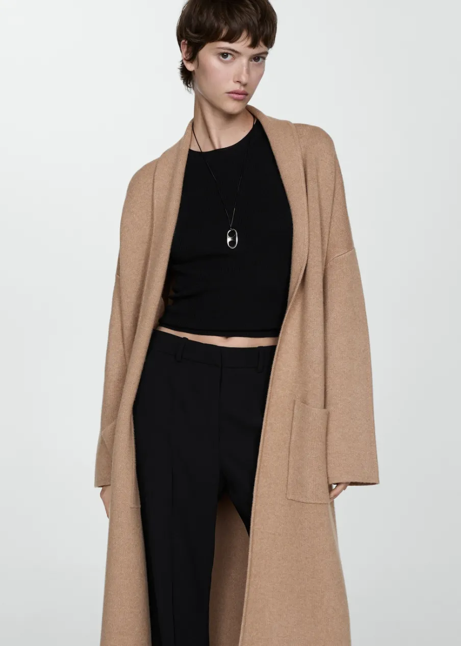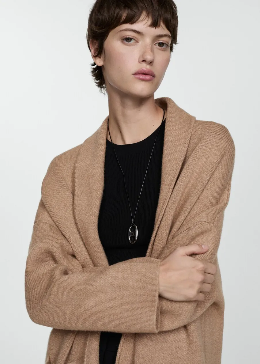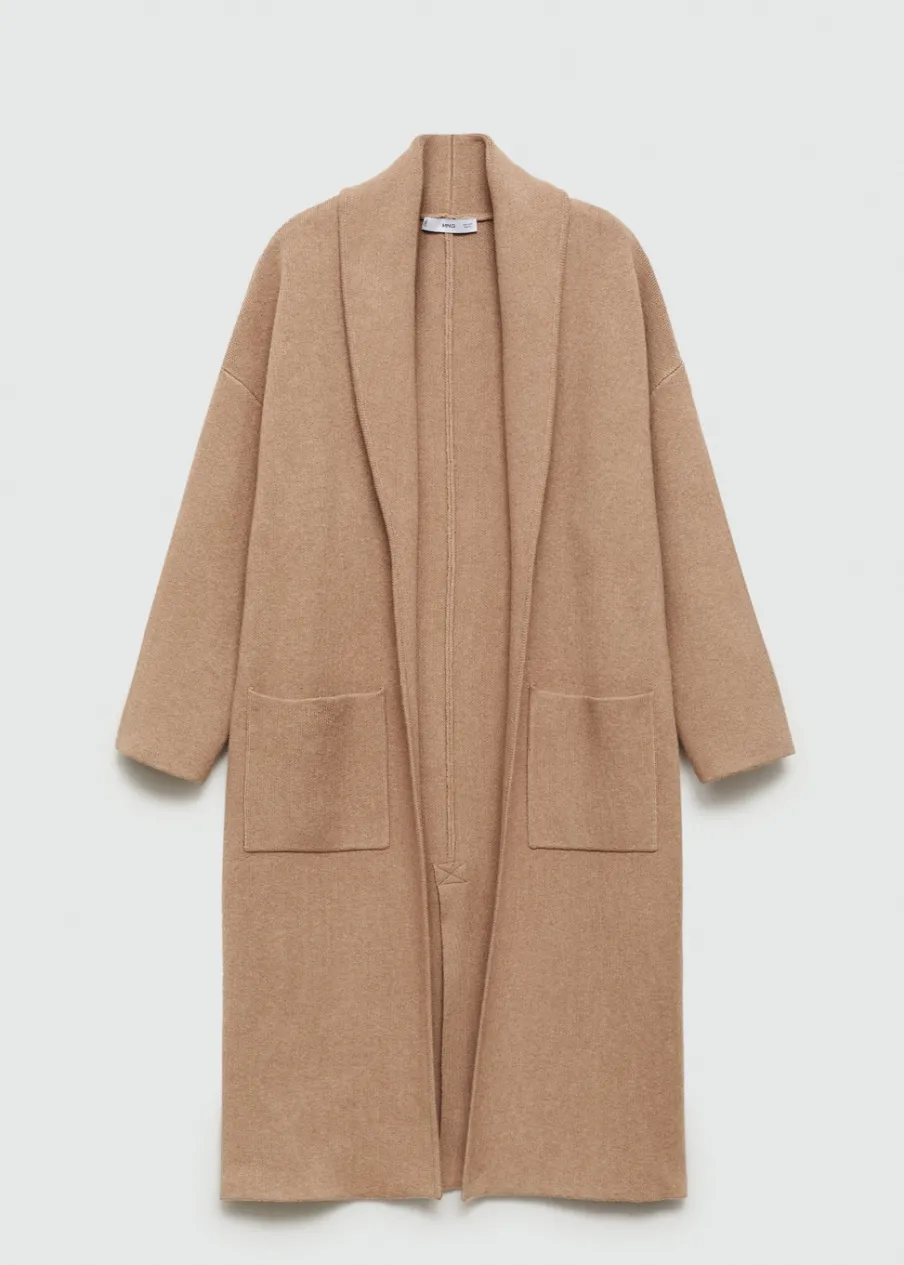 Dzianinowa tkanina. Dzianina średniej grubości. Model oversize. Fason o średniej długości. Klapy. Otwarty dekolt. Długi rękaw. Dwie kieszenie nakładane z przodu. Bez zapięcia.