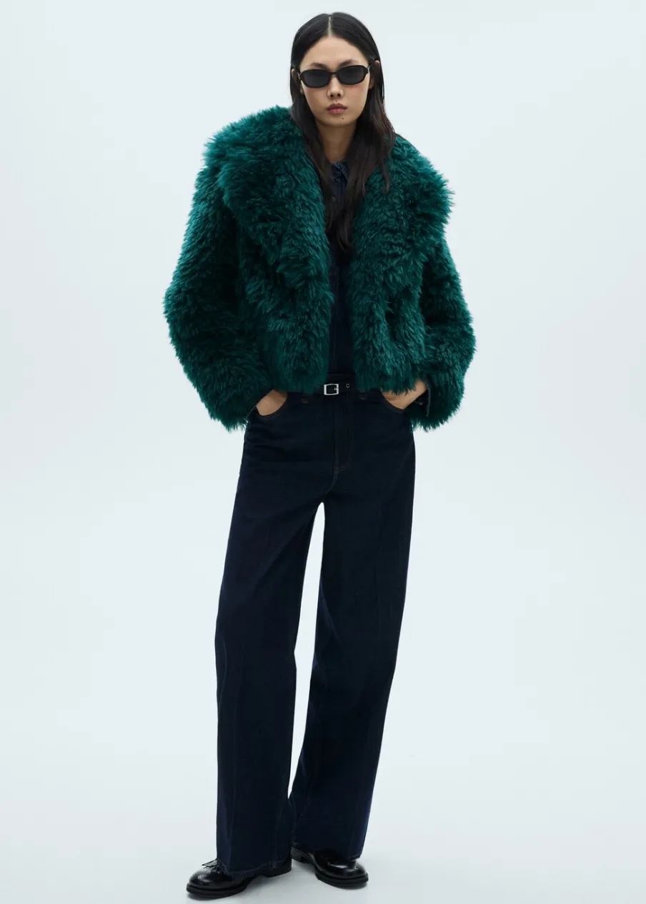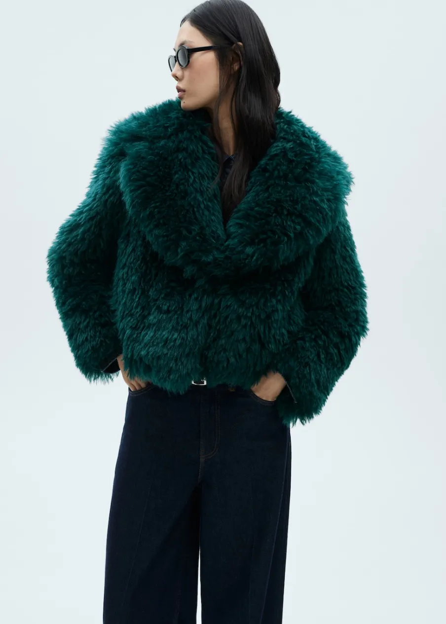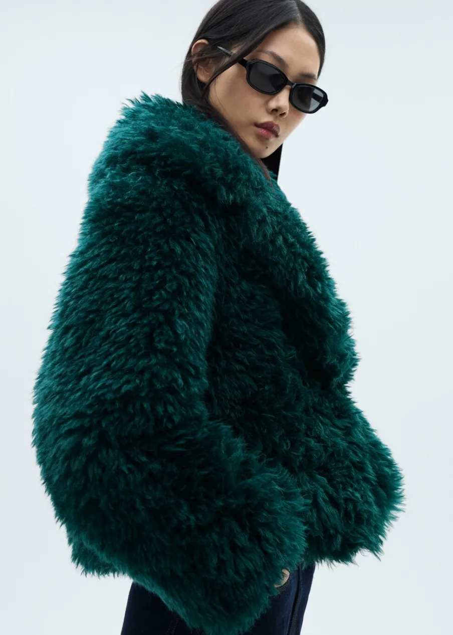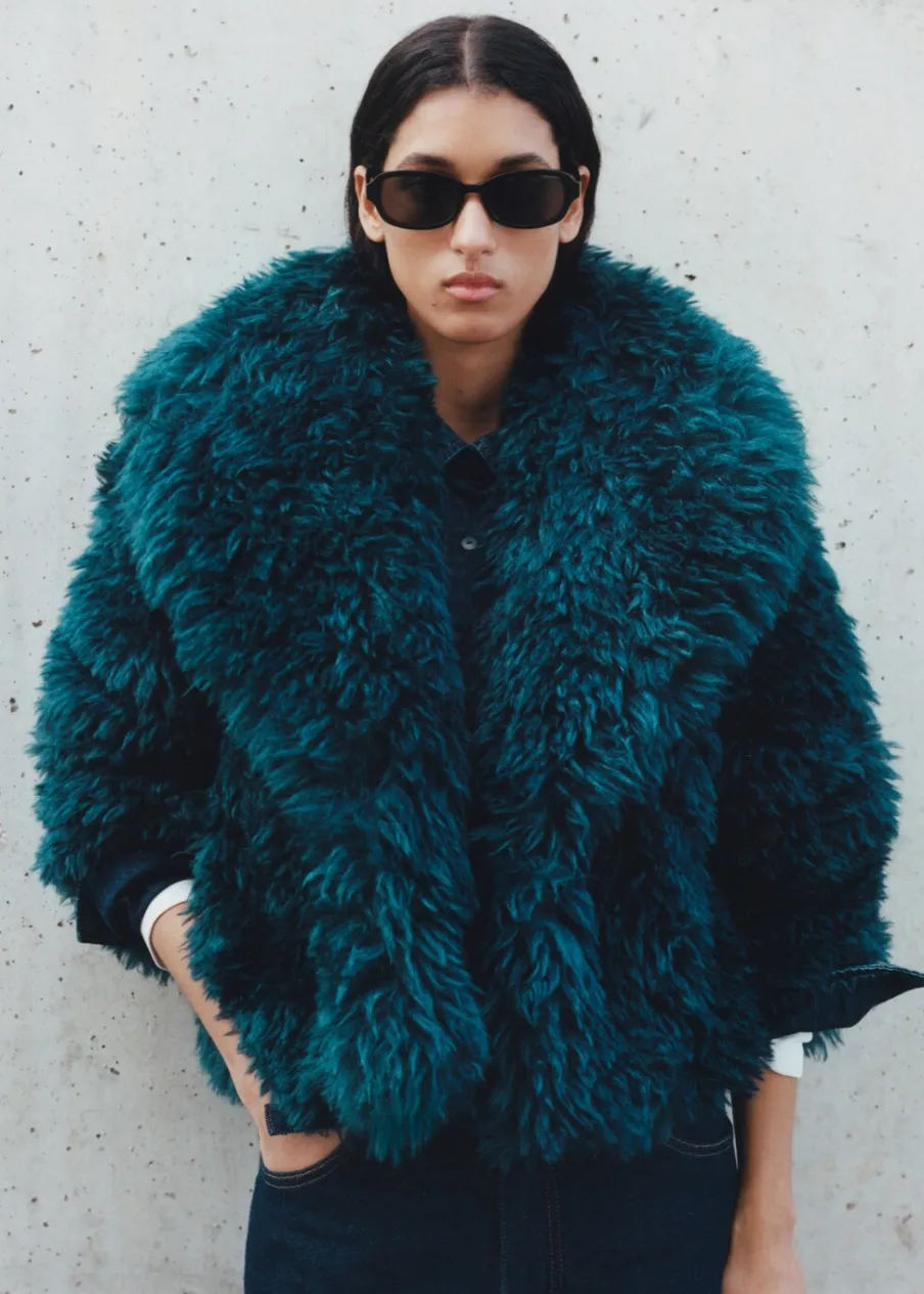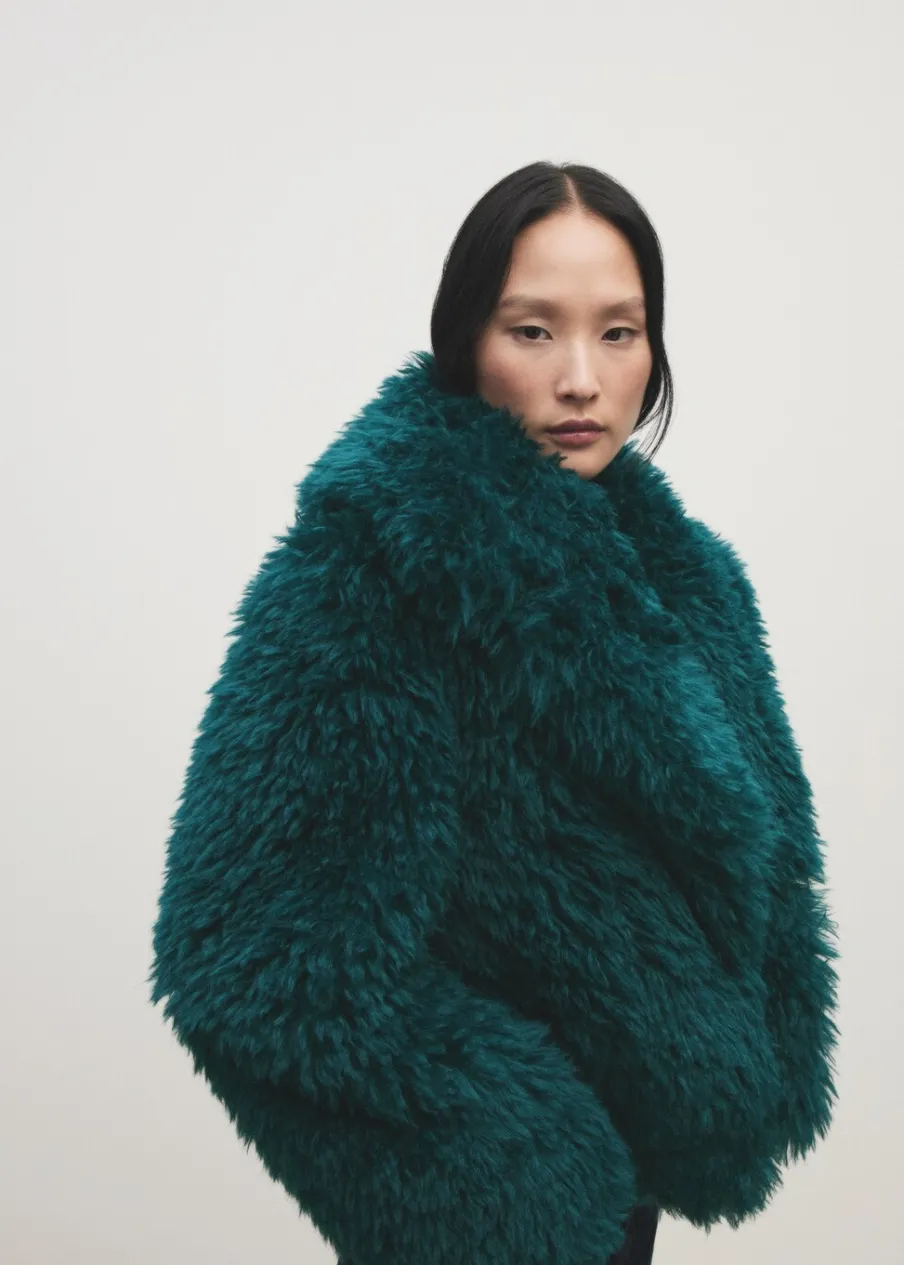Włochata tekstura. Ciężka struktura. Dekolt w szpic z kołnierzykiem. Długi rękaw. Dwie wpuszczane kieszenie boczne. Zapięcie na haftki z przodu. Tylko podszewka.