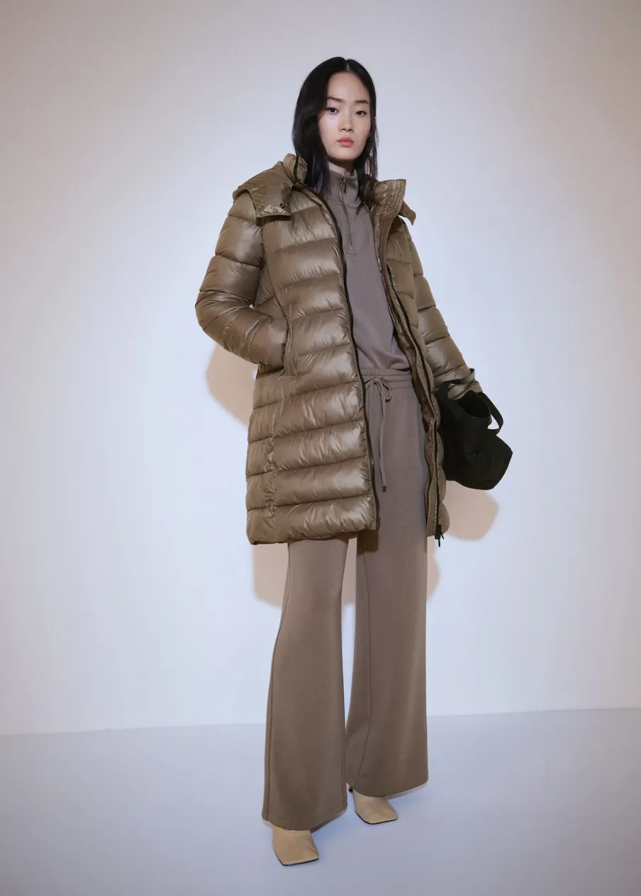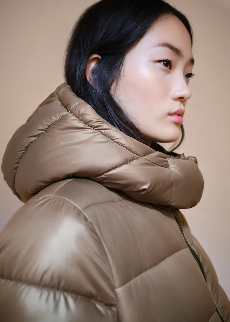 Nylonowa tkanina. Model prosty. Model pikowany. Model długi. Golf. Z kapturem. Długi rękaw. Dwie kieszenie boczne. Zapięcie na suwak i guziki. Wewnętrzna podszewka. Modelka ma 175 cm wzrostu i nosi rozmiar S/36. Water Repellent: trwałe wykończenie tego modelu chroni przed lekkim deszczem, odpycha cząsteczki wody i krople deszczu.