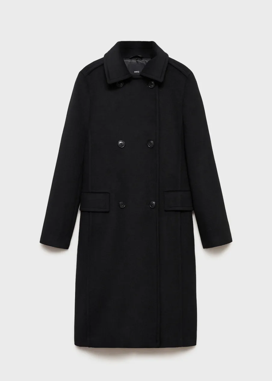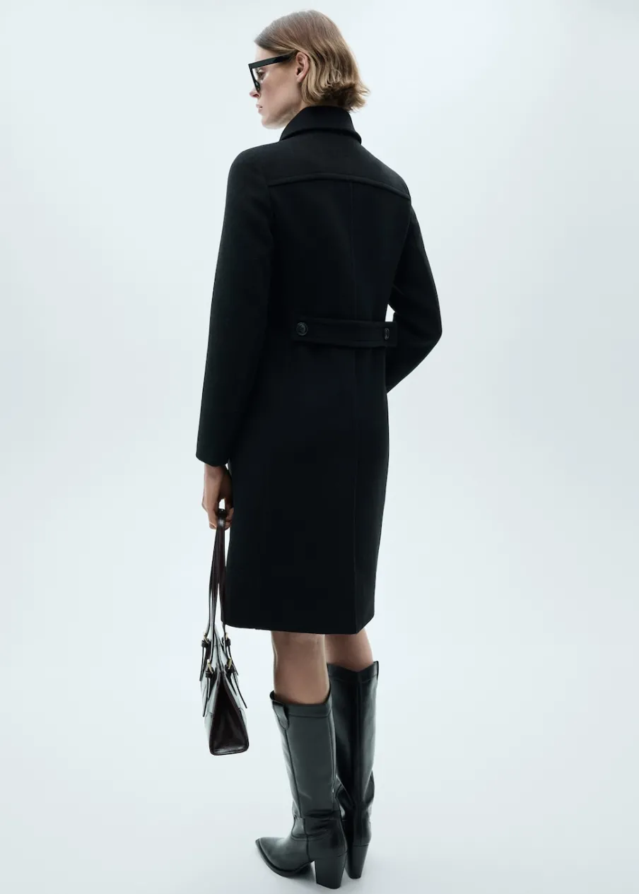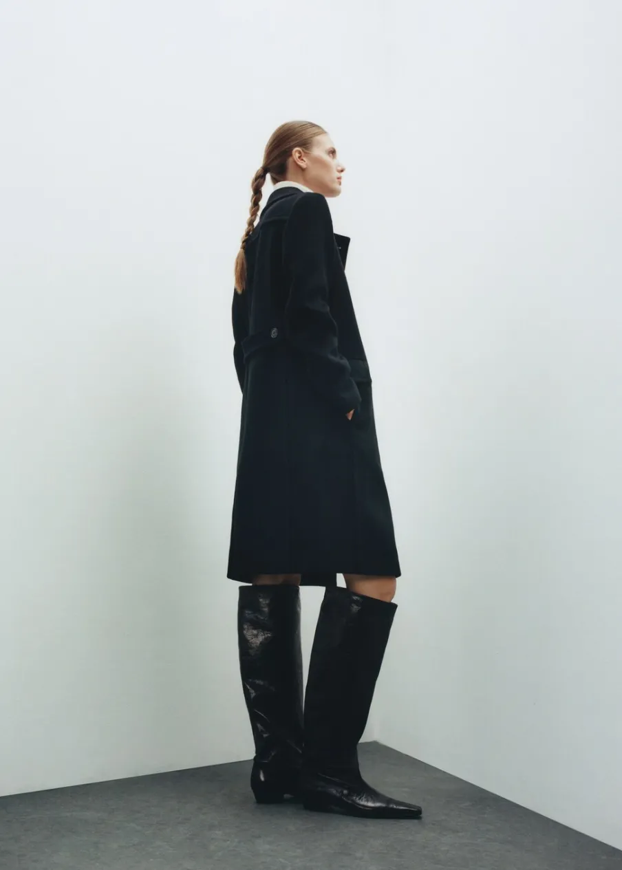 Tkanina mieszanka wełny. Slim-fit. Model prosty. Fason o średniej długości. Ciężka struktura. Dekolt z listwą. Długi rękaw. Dwie kieszenie z przodu z wypustkami i patką. Dwurzędowe zapięcie. Wewnętrzna podszewka.