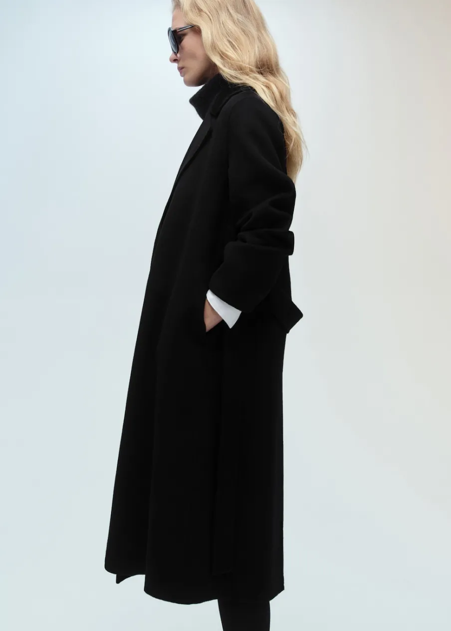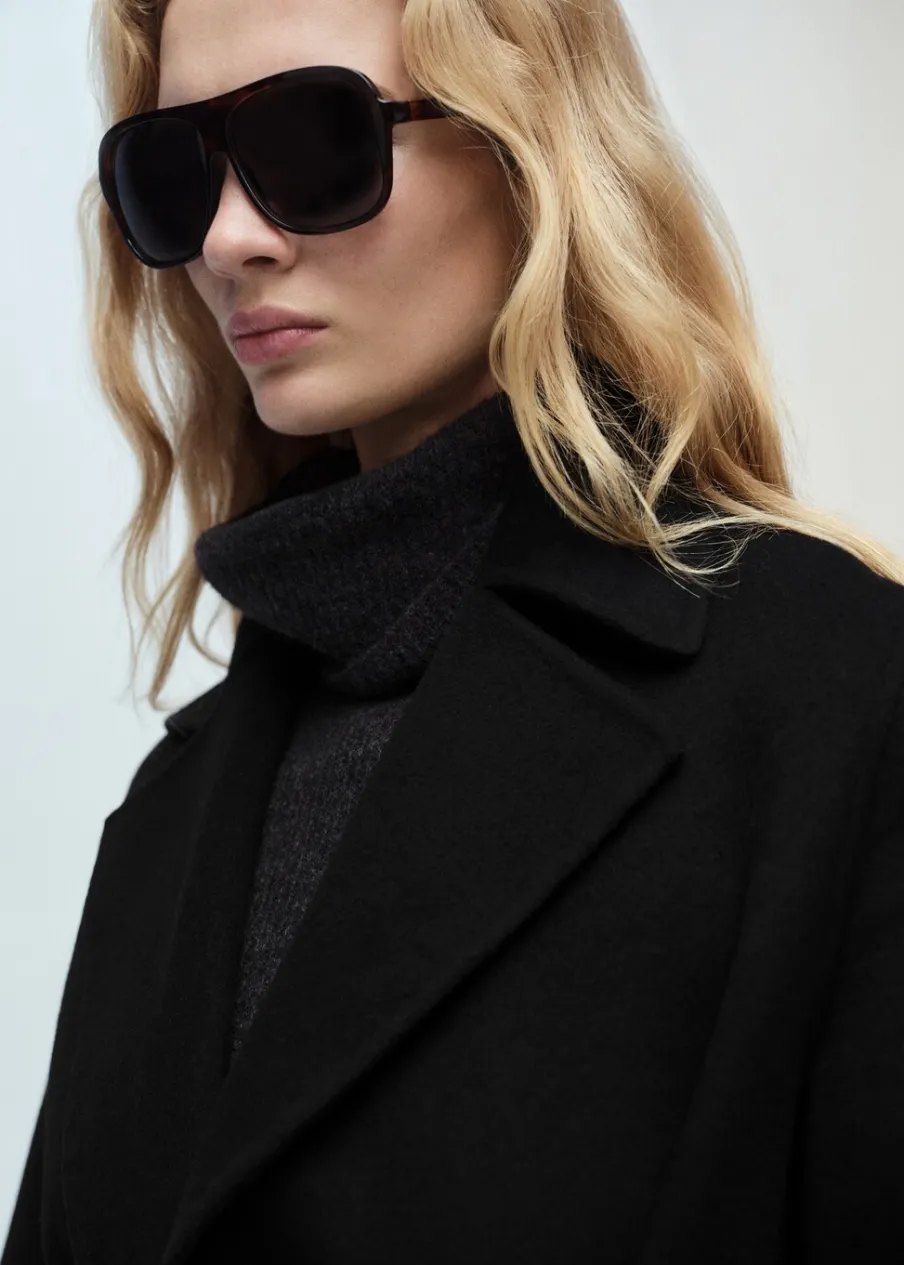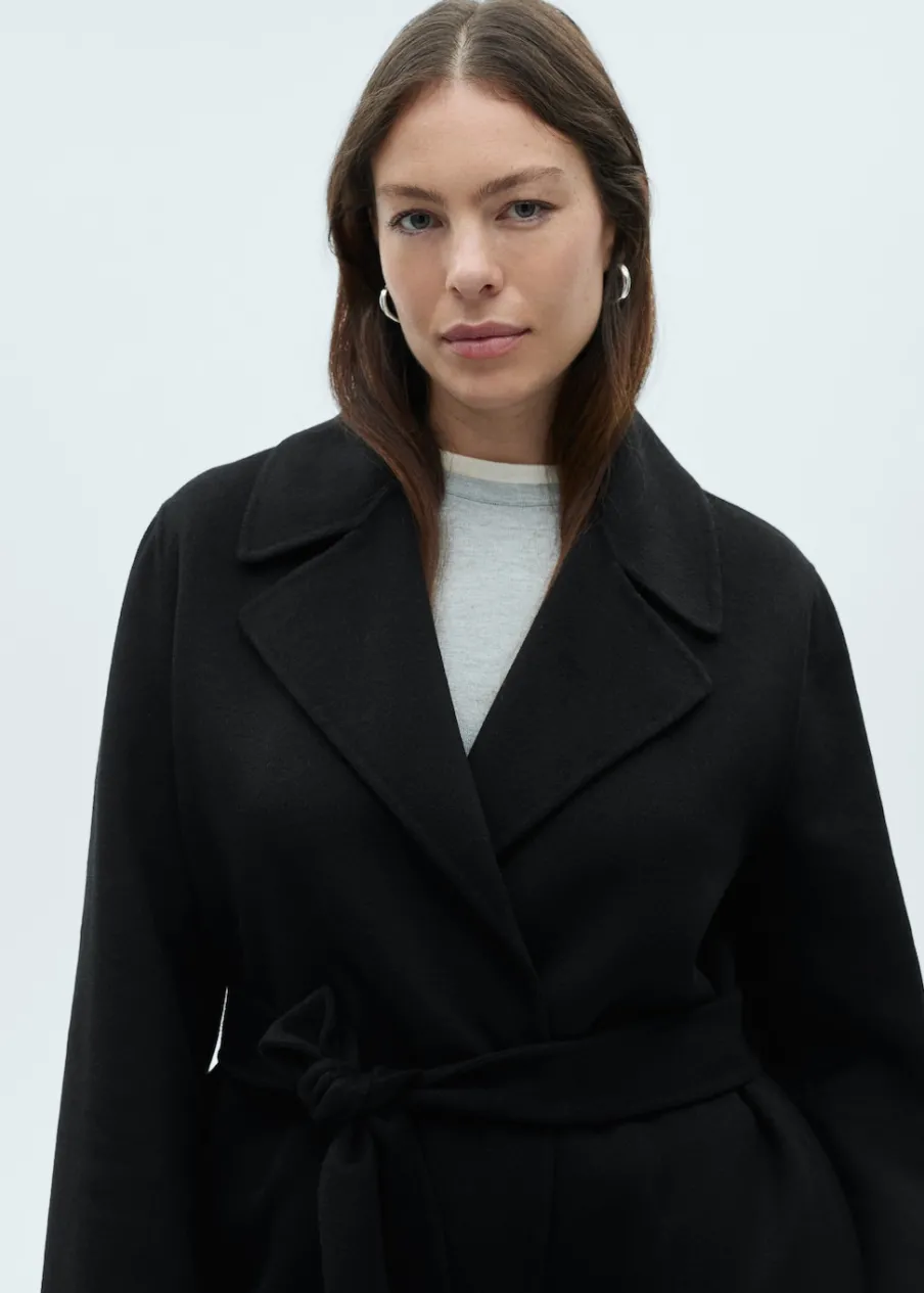Újrahasznosított kevert gyapjú, túlméretezett modell, közepes dizájn, hajtókás V-nyak, hosszú ujj, két első zseb, levehető öv, hátul sliccelt alj, irodai lookok, a modell 1,81 cm magas és S/36 méretet visel.
