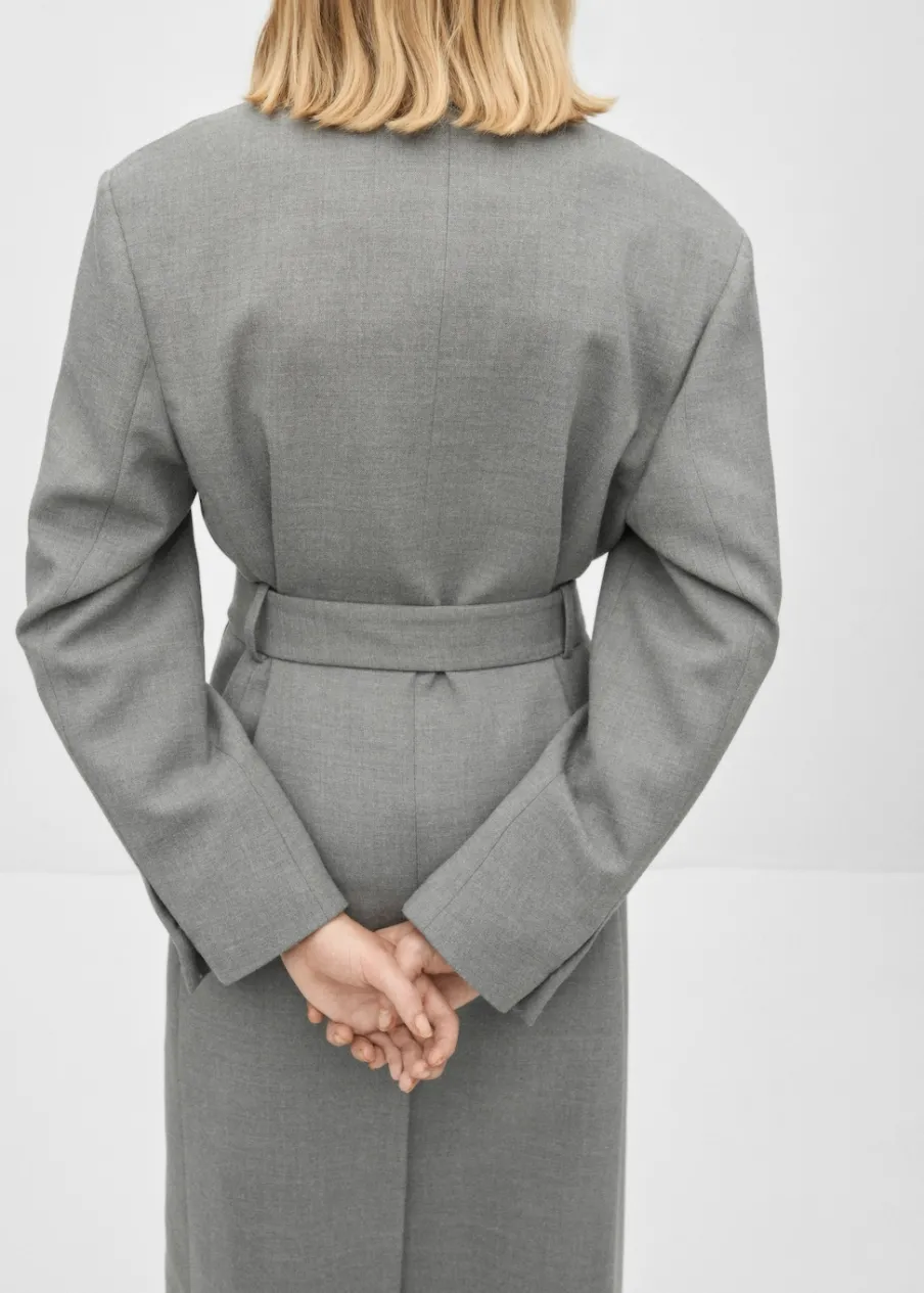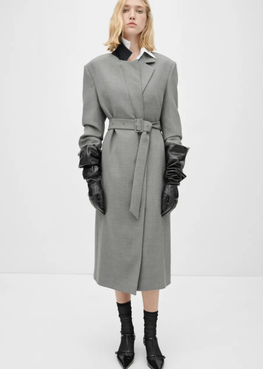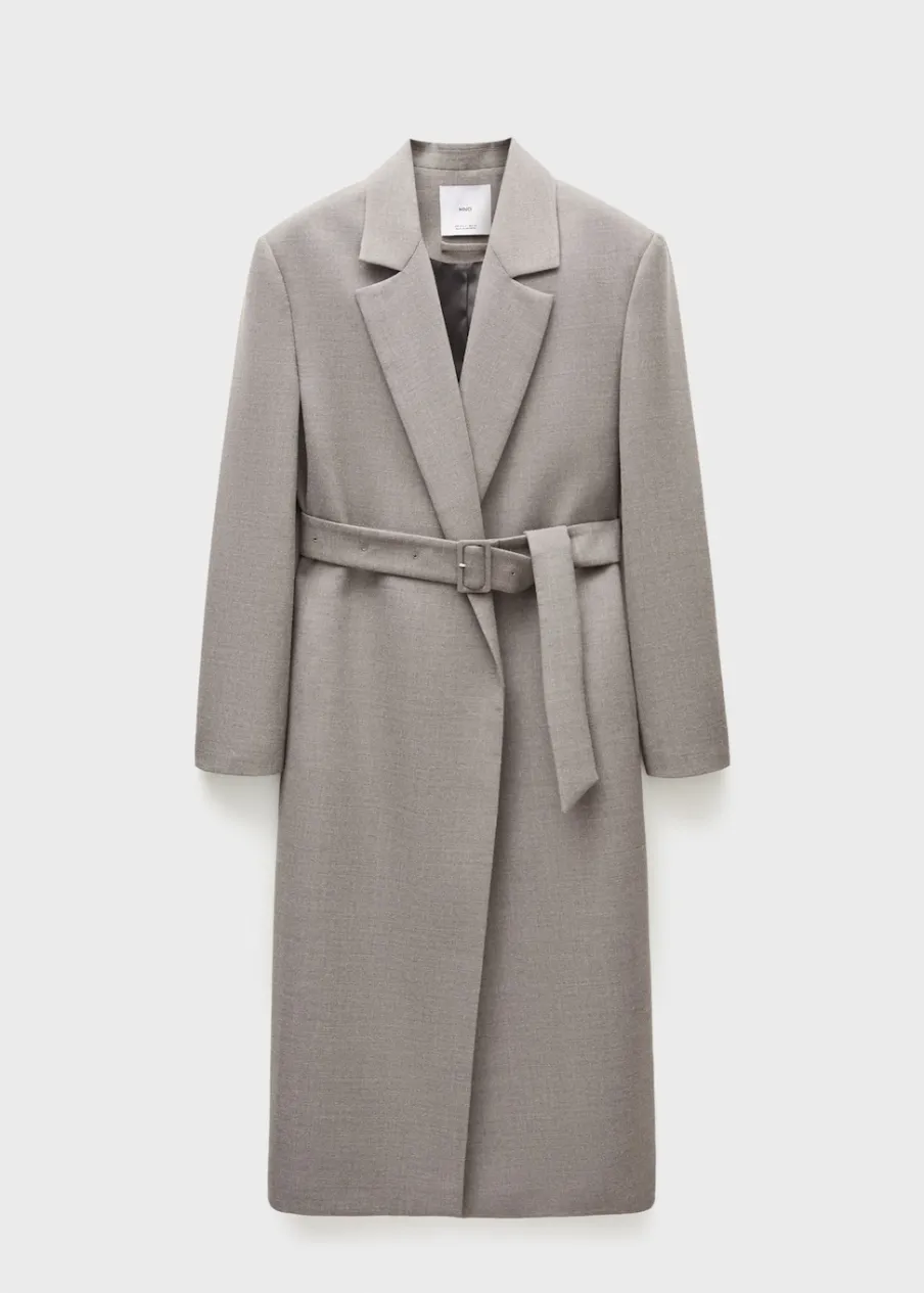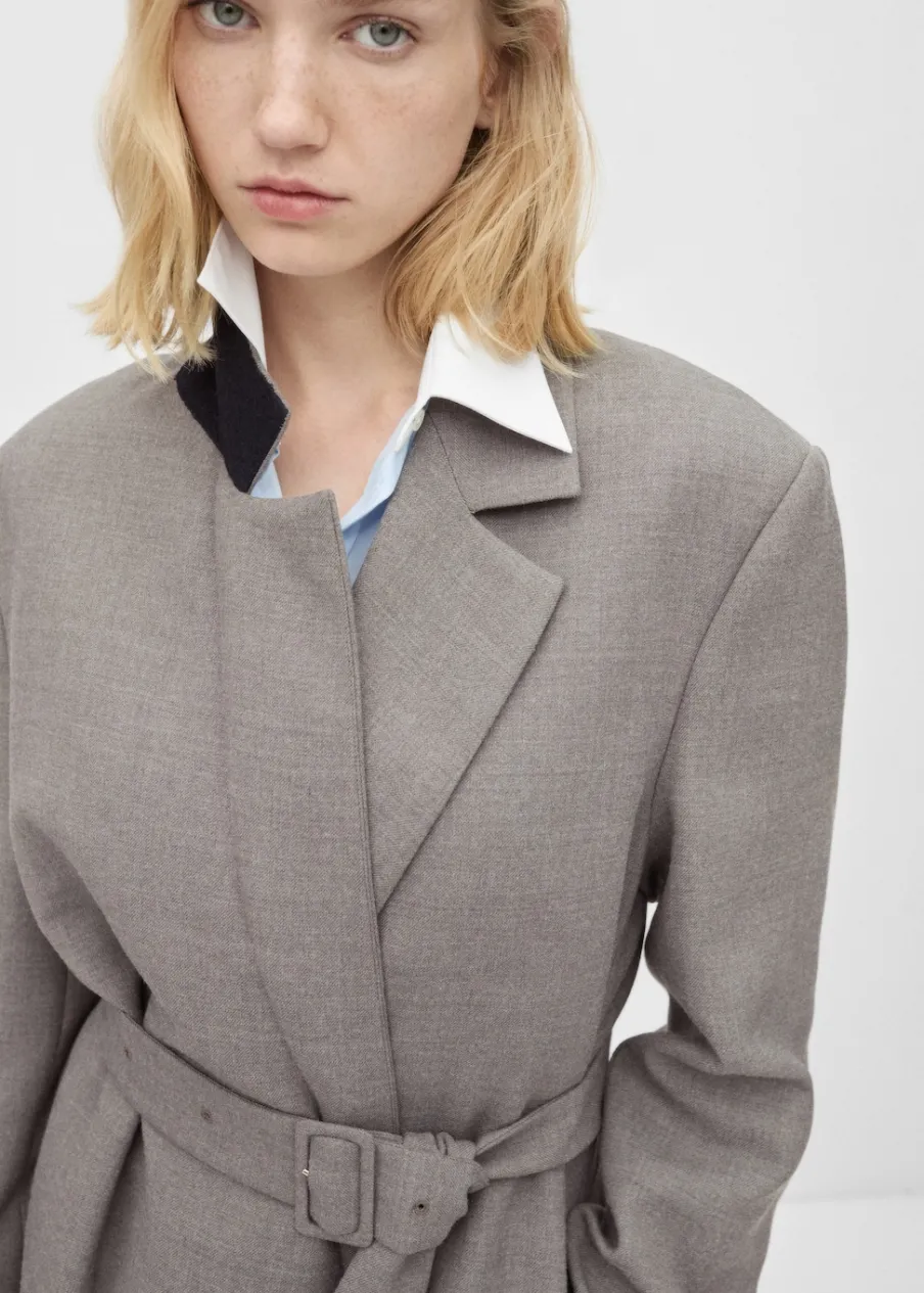 Model długi. Długi rękaw. Pasek zapinany na klamrę. Wewnętrzna podszewka. Kolekcja Selection. Modelka ma 178 cm wzrostu i nosi rozmiar S/36. Tkanina mieszanka wełny. Dekolt w szpic z kołnierzykiem. Klapy z nacięciem. Model zakładany. Model prosty.