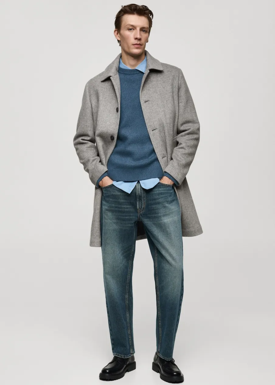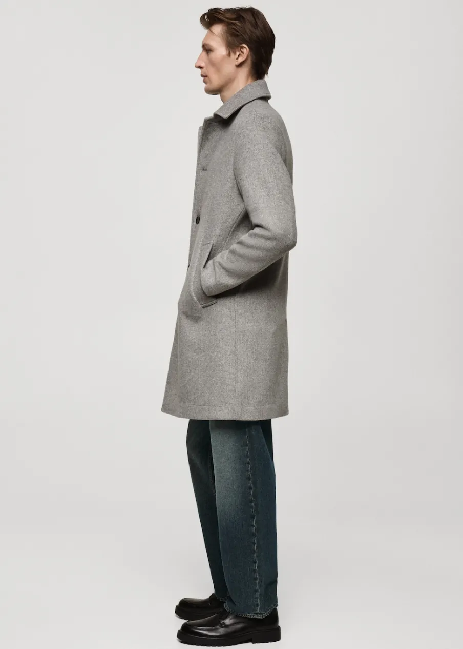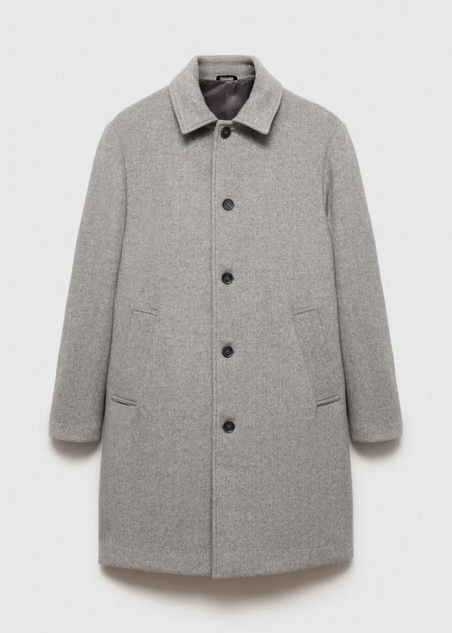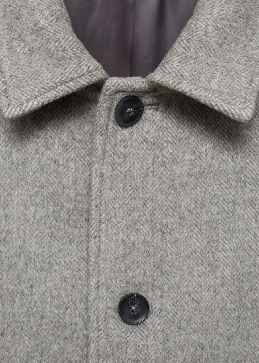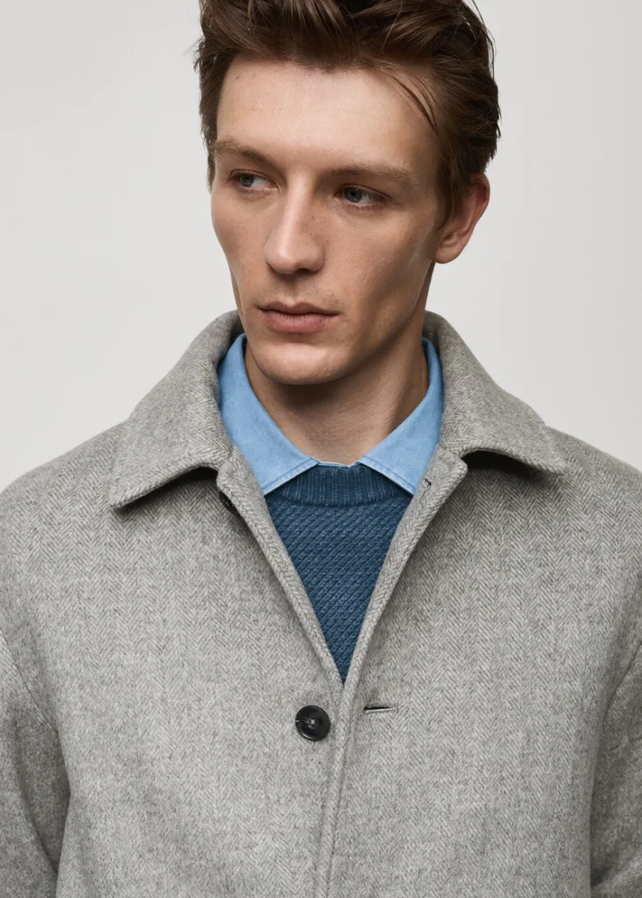 Tkanina mieszanka wełny. Krój regular. Jodełkowy deseń. Dwie kieszenie z wypustkami z przodu. Długi rękaw. Prosty dół. Wewnętrzna kieszeń. Wewnętrzna podszewka. Model ma 190 cm wzrostu i nosi rozmiar M. Z tyłu szlica z guzikiem. Klasyczny kołnierzyk. Zapięcie na guziki z przodu.