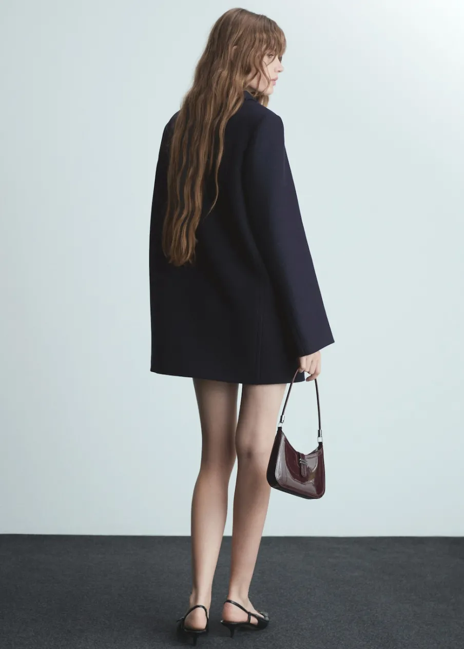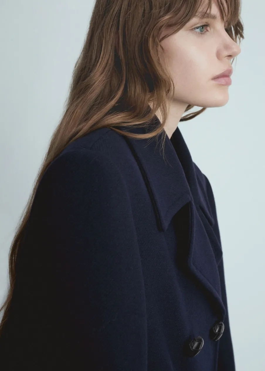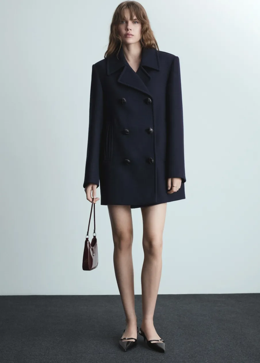 Tkanina mieszanka wełny. Model oversize. Model prosty. Fason o średniej długości. Dekolt w szpic z kołnierzykiem. Klapy z nacięciem. Długi rękaw. Dwurzędowe zapięcie. Wewnętrzna podszewka. Modelka ma 178 cm wzrostu i nosi rozmiar S/36.