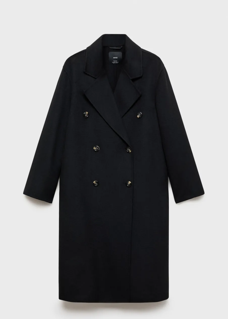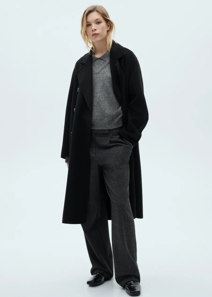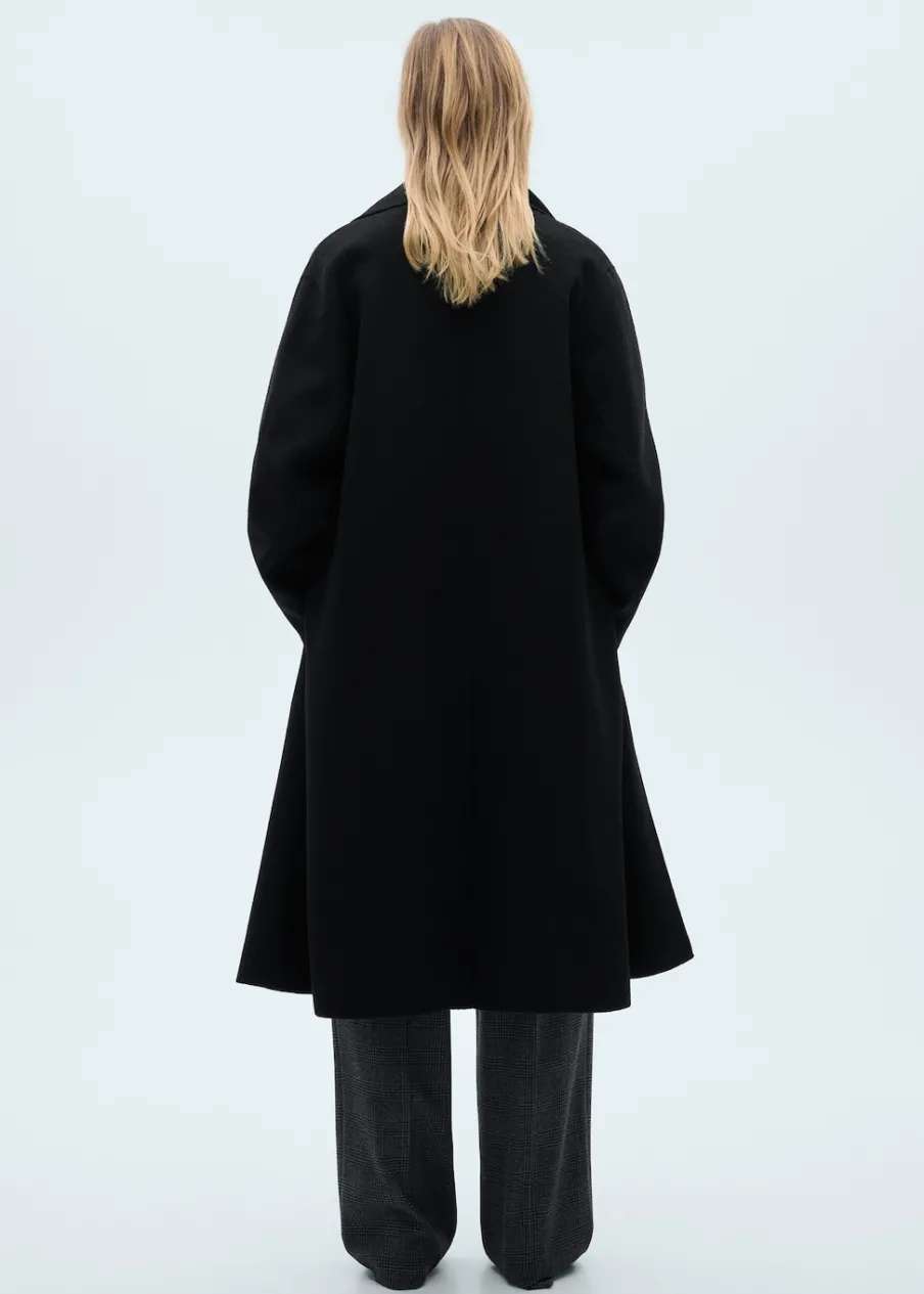 Długi rękaw. Ramiona z obniżonym szwem. Dwie kieszenie boczne. Dwurzędowe zapięcie. Rozcięcie z tyłu u dołu. Stylizacje biurowe. Tkanina z wełną. Wyrób ręczny. Model dwurzędowy. Model oversize. Model długi. Dekolt w szpic z kołnierzykiem. Klapy z nacięciem. Ciężka struktura. Zapięcie z przodu. Klapy. Bez podszewki.