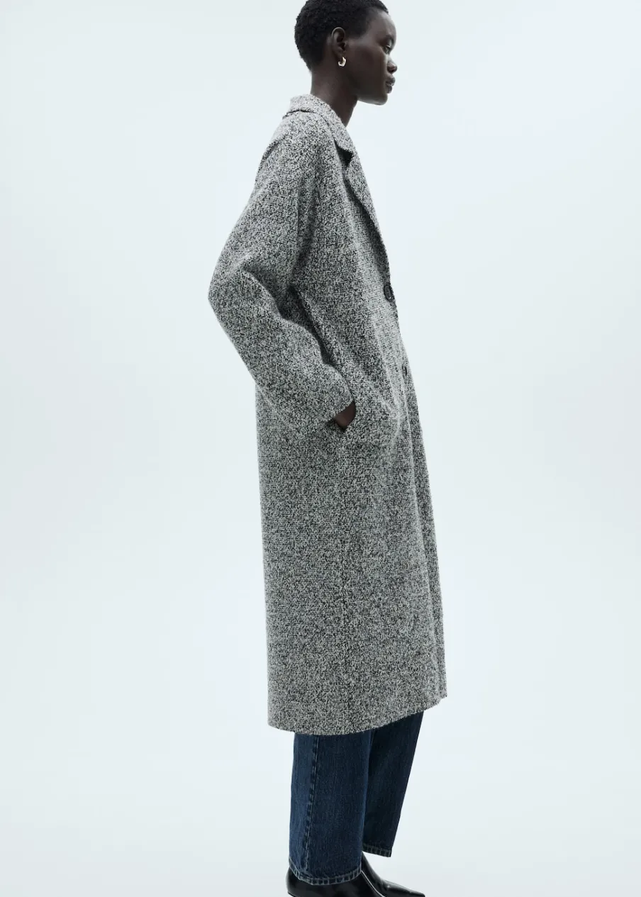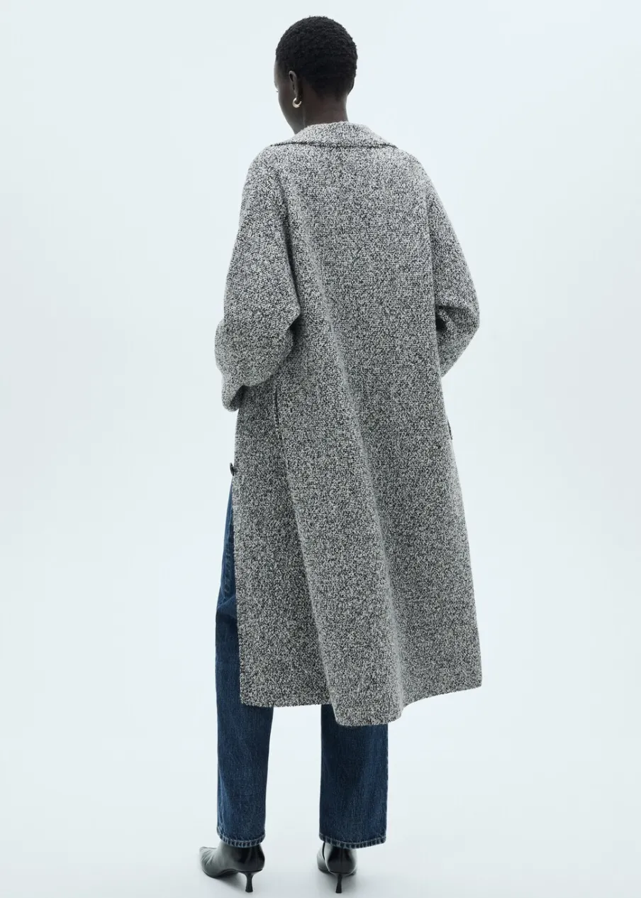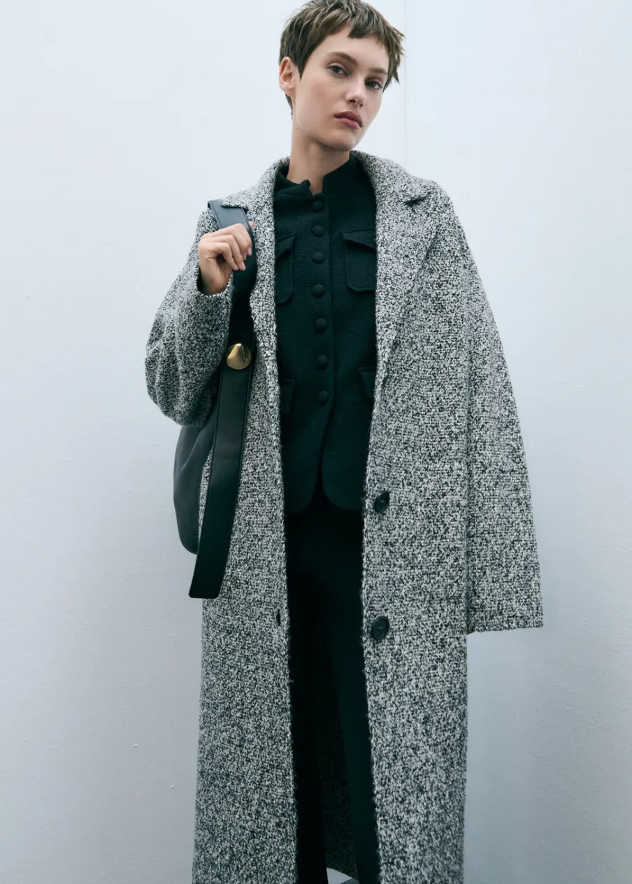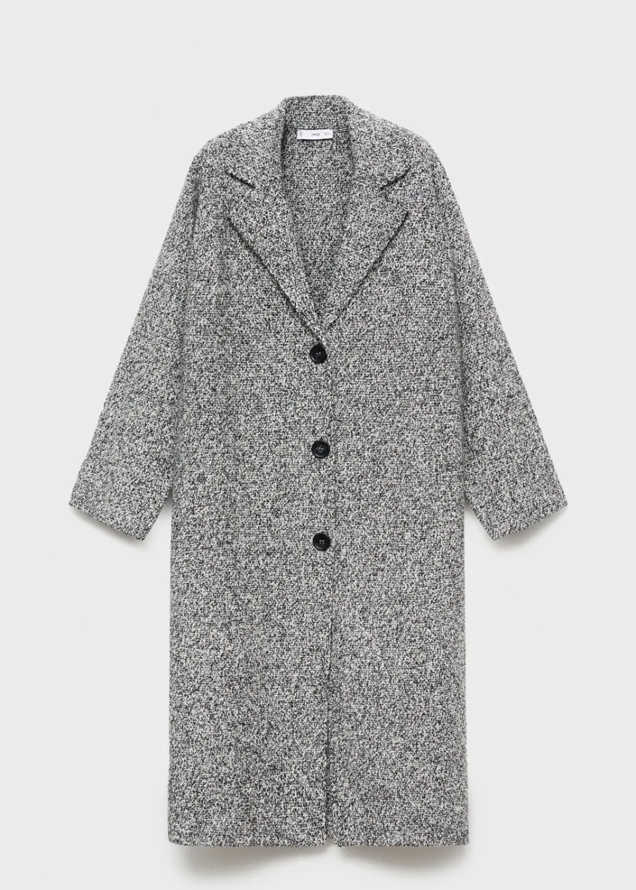 Melanżowa tkanina. Dekolt w szpic z kołnierzykiem. Klapy z nacięciem. Model długi. Dzianina średniej grubości. Model prosty. Długi rękaw. Tkanina mieszanka bawełny. Zapięcie z przodu na guziki. Modelka ma 175 cm wzrostu i nosi rozmiar S/36.