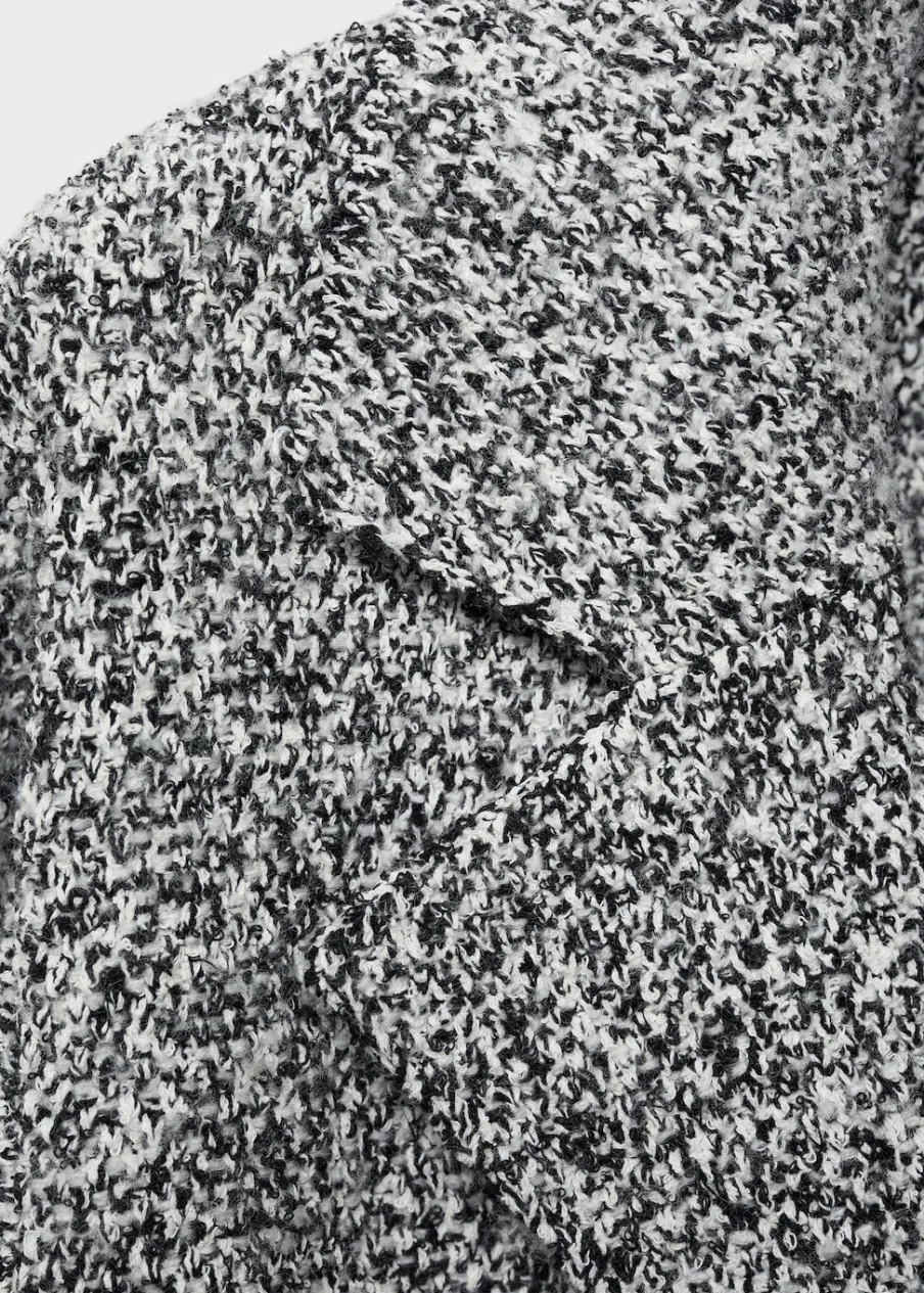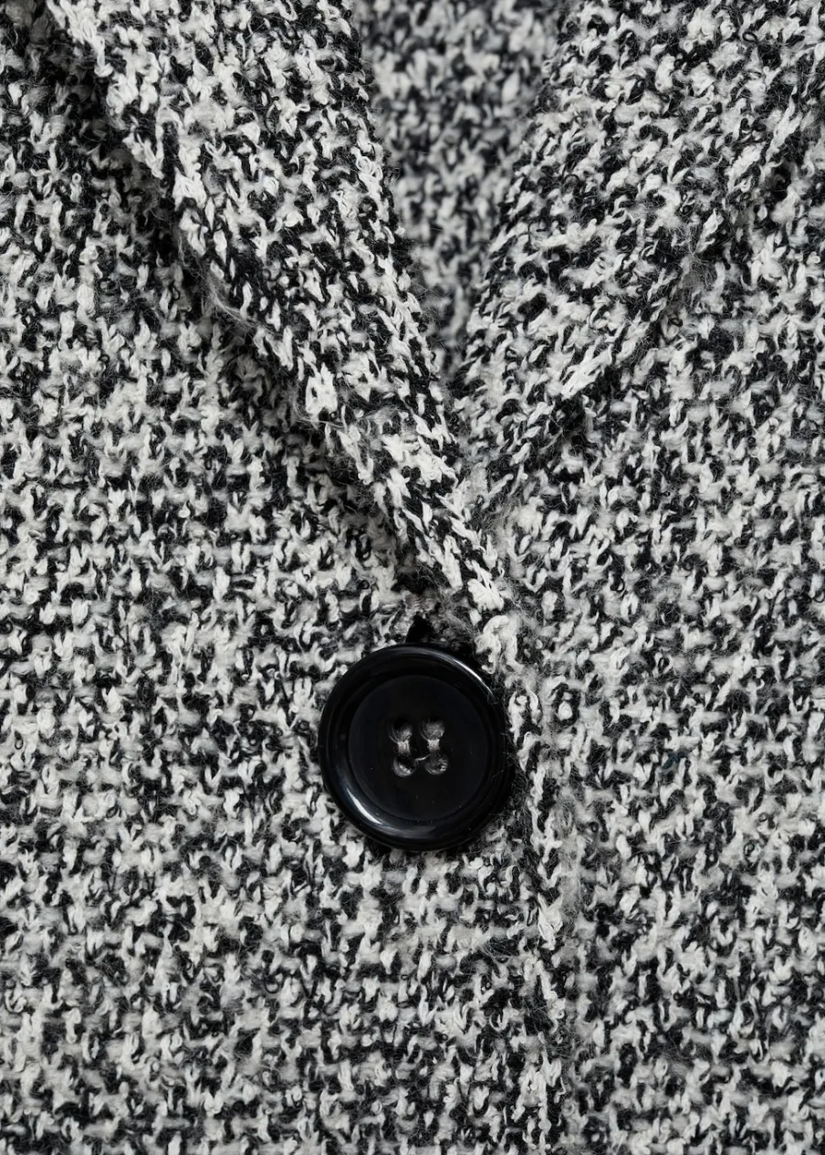 OpisMelanżowa tkanina. Dekolt w szpic z kołnierzykiem. Klapy z nacięciem. Model długi. Dzianina średniej grubości….