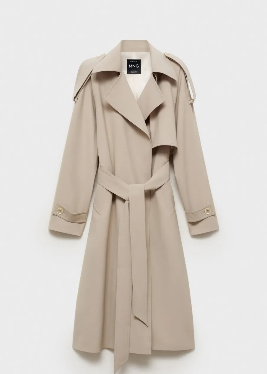 Model oversize. Dekolt w szpic z kołnierzykiem. Klapy z nacięciem. Pagony na ramionach. Długi rękaw. Patki na mankietach. Szlufki w pasie. Wiązany pasek. Odpinany pasek. Zapięcie z przodu. Dwie kieszenie boczne. Wewnętrzna podszewka.