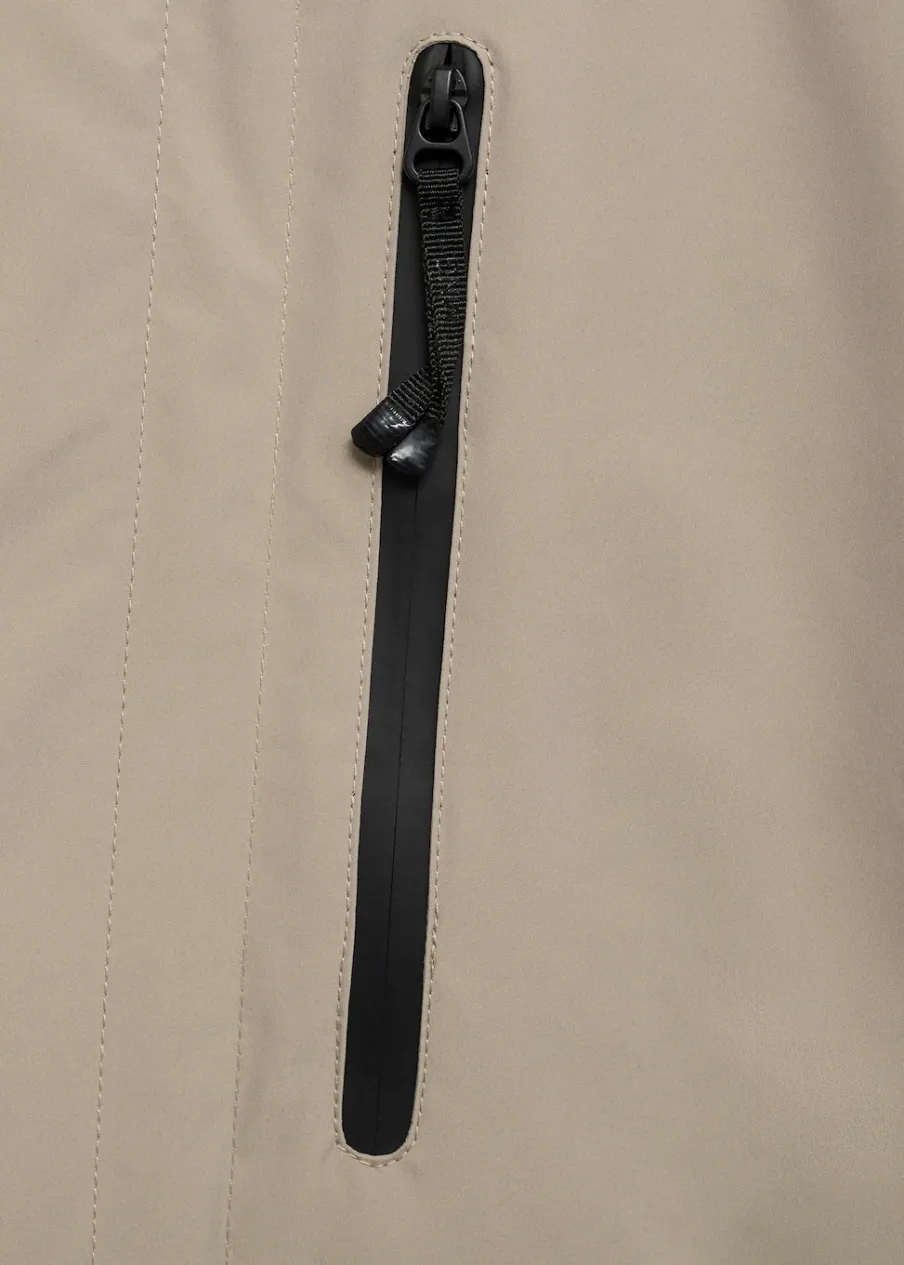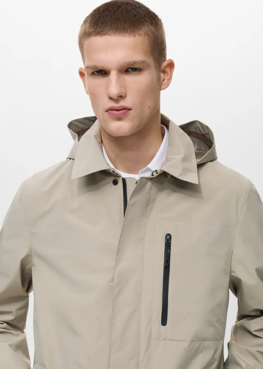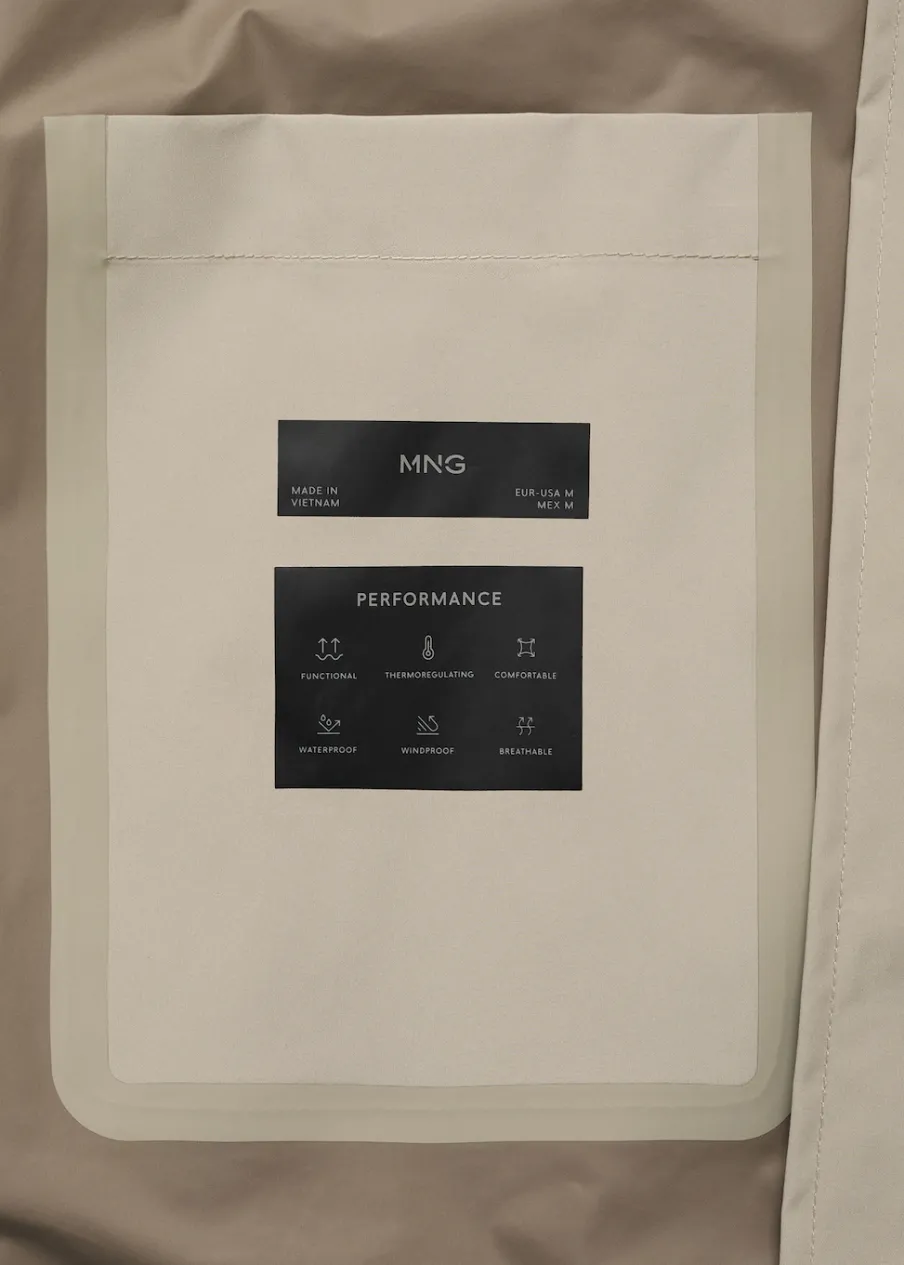 Kolekcja Performance. Comfort stretch: elastyczna tkanina dla większego komfortu. Coolmax® to specjalna tkanina, która pomaga odprowadzać wilgoć ze skóry, dzięki czemu w zimnym klimacie zapewnia suchość i ciepło, a w ciepłym klimacie poczucie rześkości i lekkości. Windproof: ten wytrzymały materiał zapewnia ochronę przed wiatrem dla większego komfortu podczas aktywności na świeżym powietrzu. Waterproof: trwałe wykończenie zapobiega przenikaniu wody przez tkaninę, zapewniając najlepszą możliwą ochronę przed deszczem. Termoregulacyjna: ta tkanina zapewnia optymalną przepuszczalność powietrza, by utrzymać stałą temperaturę ciała. Breathable: ta tkanina pomaga regulować temperaturę ciała, ponieważ pozwala na odprowadzenie wilgoci. Odpinany kaptur. Klasyczny kołnierzyk. Termoklejone wodoszczelne zapięcie na zamek i zatrzaski z przodu. Naszywana kieszeń z termoklejonym zapięciem na zamek. Dwie wpuszczane kieszenie z przodu i wodoszczelne zapięcie na zamek. Długie rękawy z regulowanymi szlufkami. Z tyłu szlica z guzikiem. Kieszenie wewnętrzne. Bez podszewki. Szwy wewnętrzne z termoklejonym wzmocnieniem. Model ma 190 cm wzrostu i nosi rozmiar M.