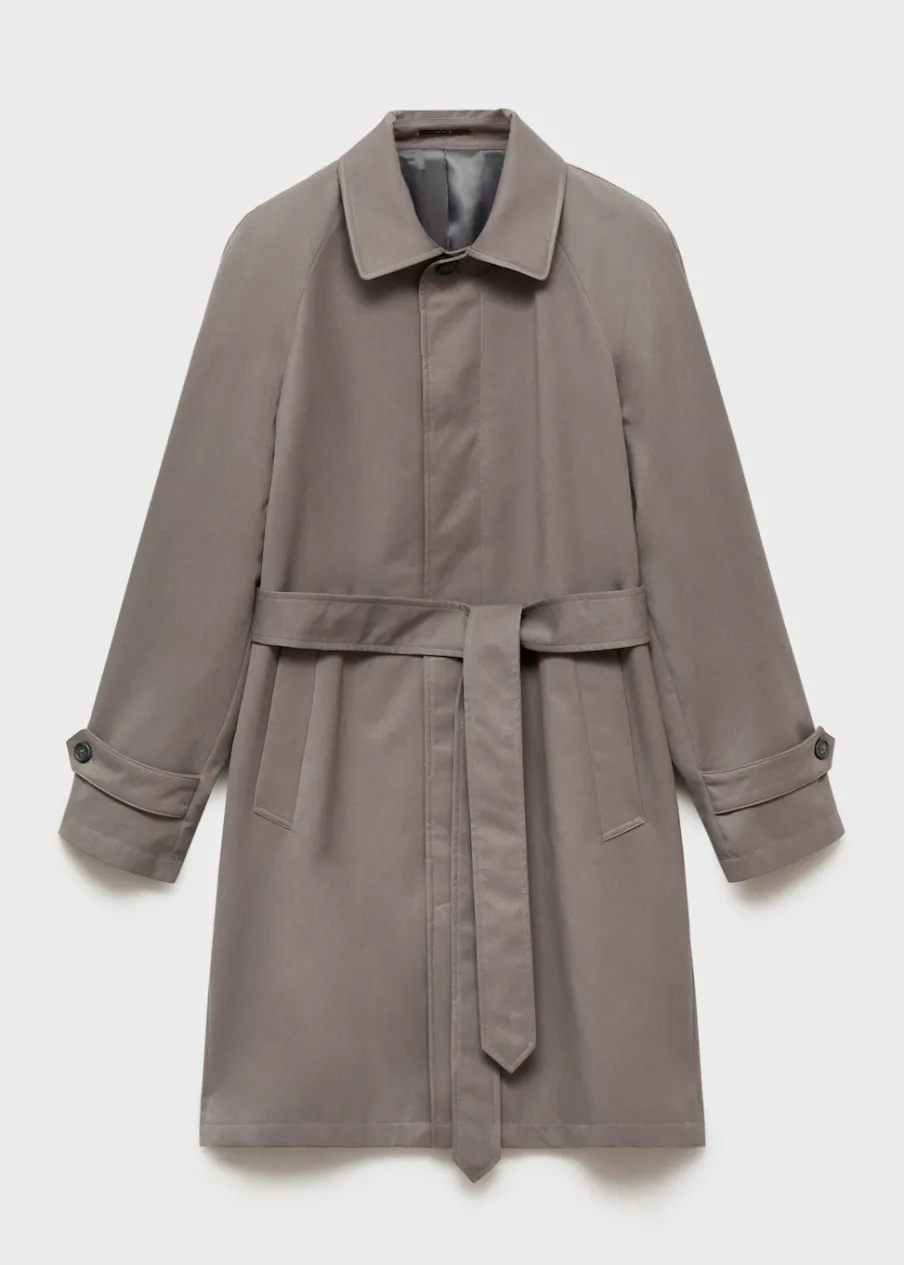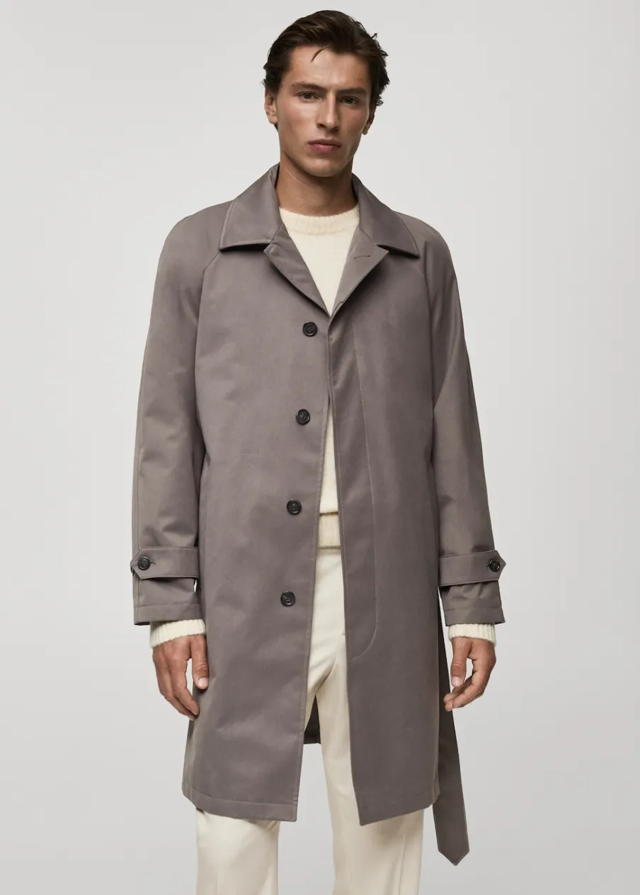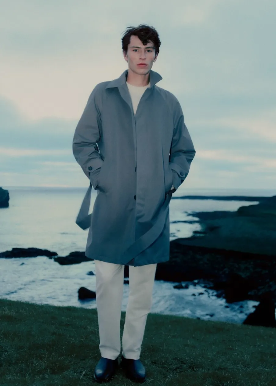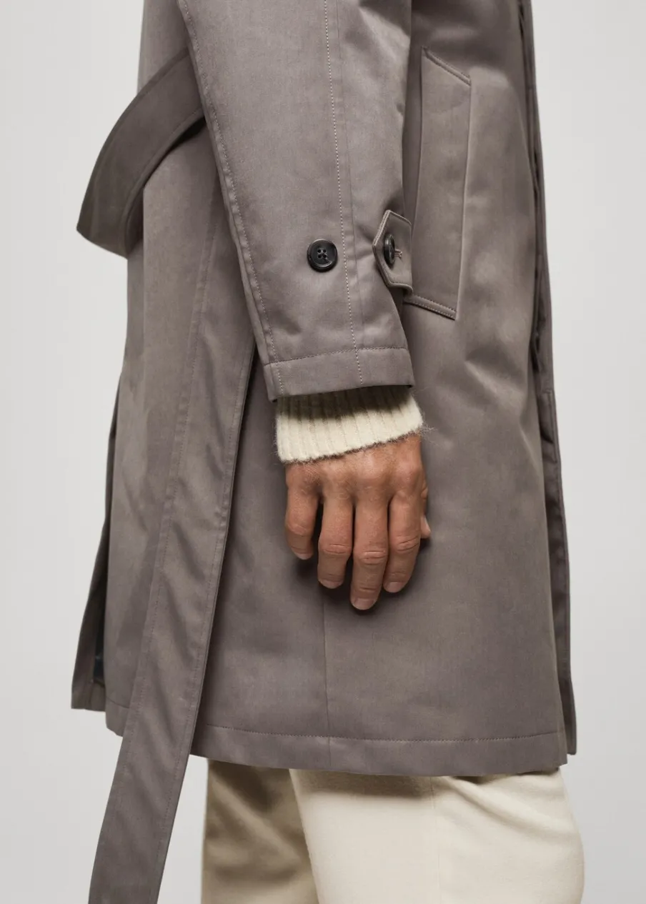 Kolekcja Selection. Klasyczny kołnierzyk. Stójka kołnierzyka z 100% wełny. Kryte zapięcie na guziki z listwą z przodu. Długie rękawy z regulowanymi szlufkami. Dwie kieszenie z wypustkami z przodu. Wiązany pasek. Rozcięcie z tyłu u dołu. Wewnętrzna podszewka. Wewnętrzna kieszeń. Model ma 190 cm wzrostu i nosi rozmiar M. Podwójna tkanina techniczna ze szmerglowanym wykończeniem, które jest komfortowe i miękkie w dotyku.