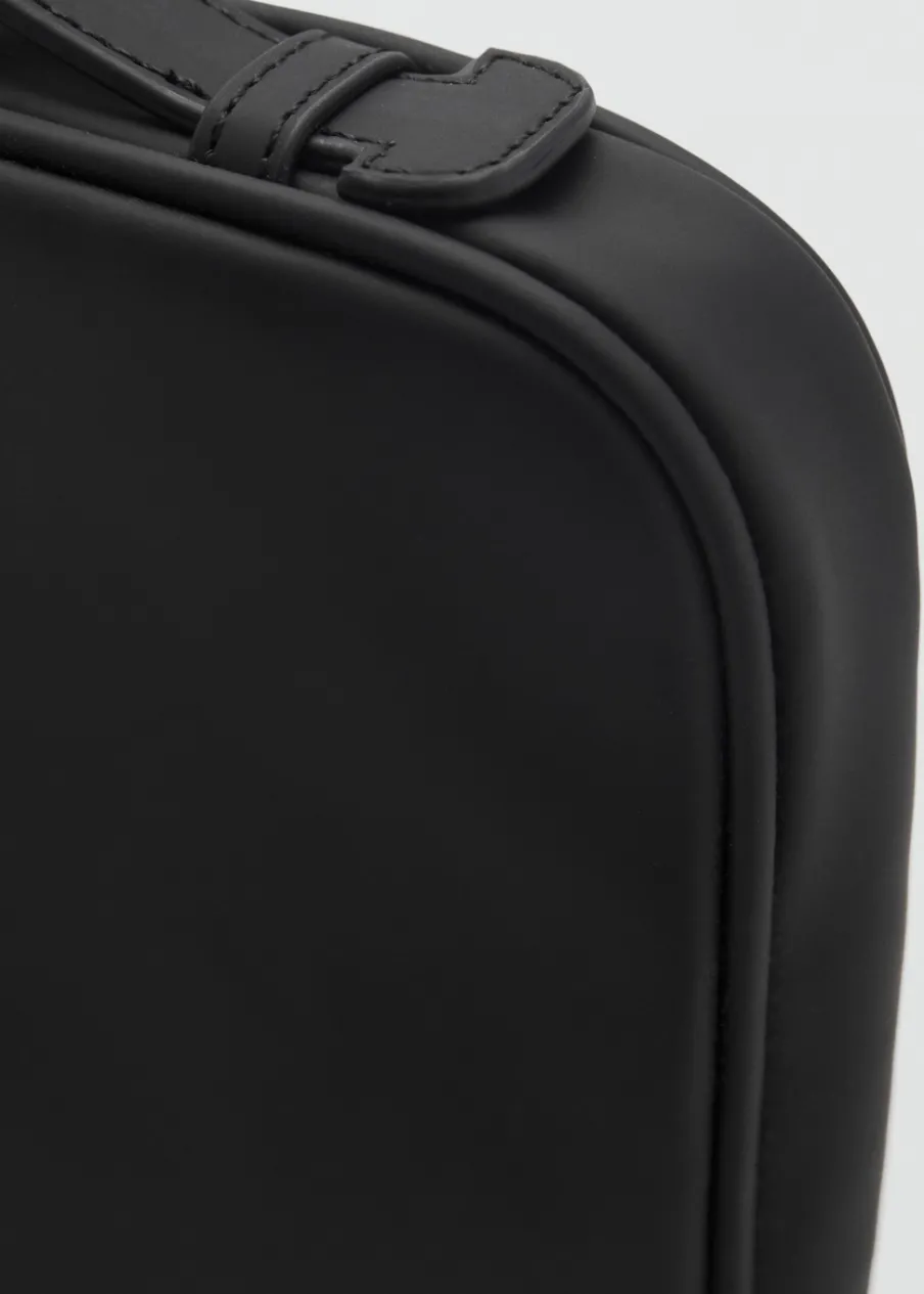 Gumowana tkanina. Krótki uchwyt. Główna przegroda z zapięciem na zamek.