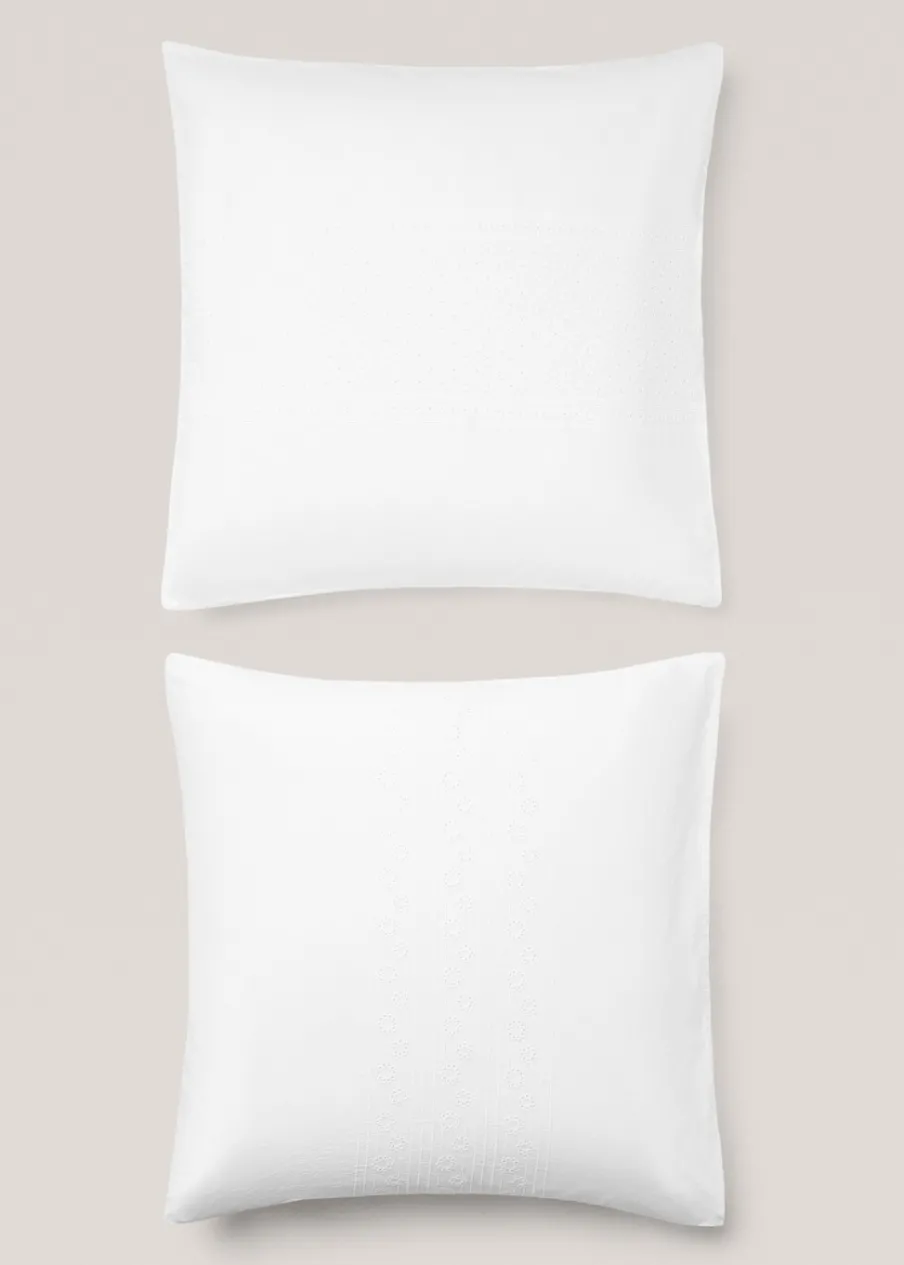 Zestaw 2 szt. Wymiary: 60 x 60 cm. Tkanina bawełniana typu perkal. Bawełna 100%. Gęstość splotu (TC): 200. Kwiatowy haft. Zamknięcie na klapę. Bez wkładu. Połącz poszewki na poduszkę do kompletu w trzech dostępnych rozmiarach.